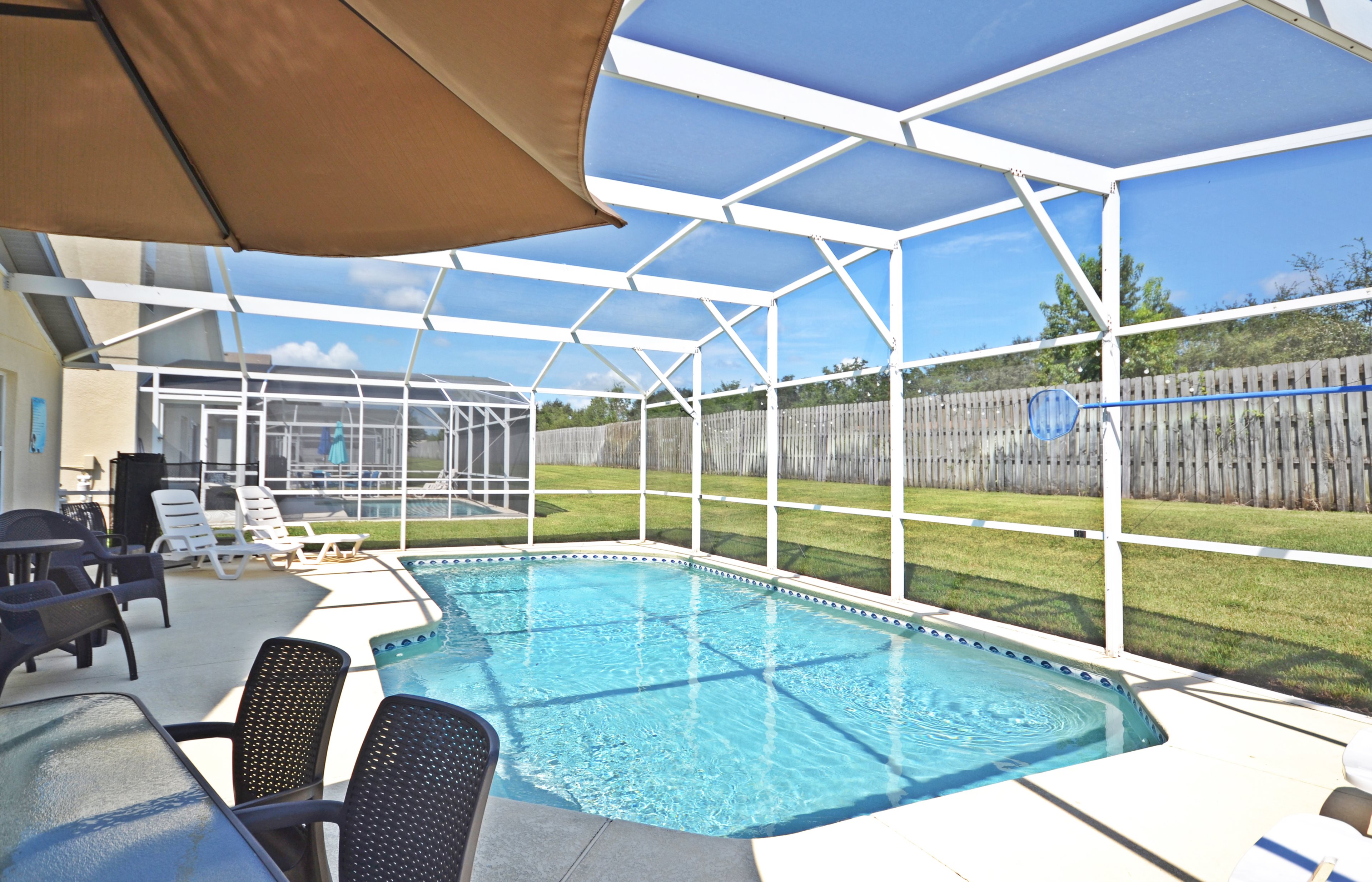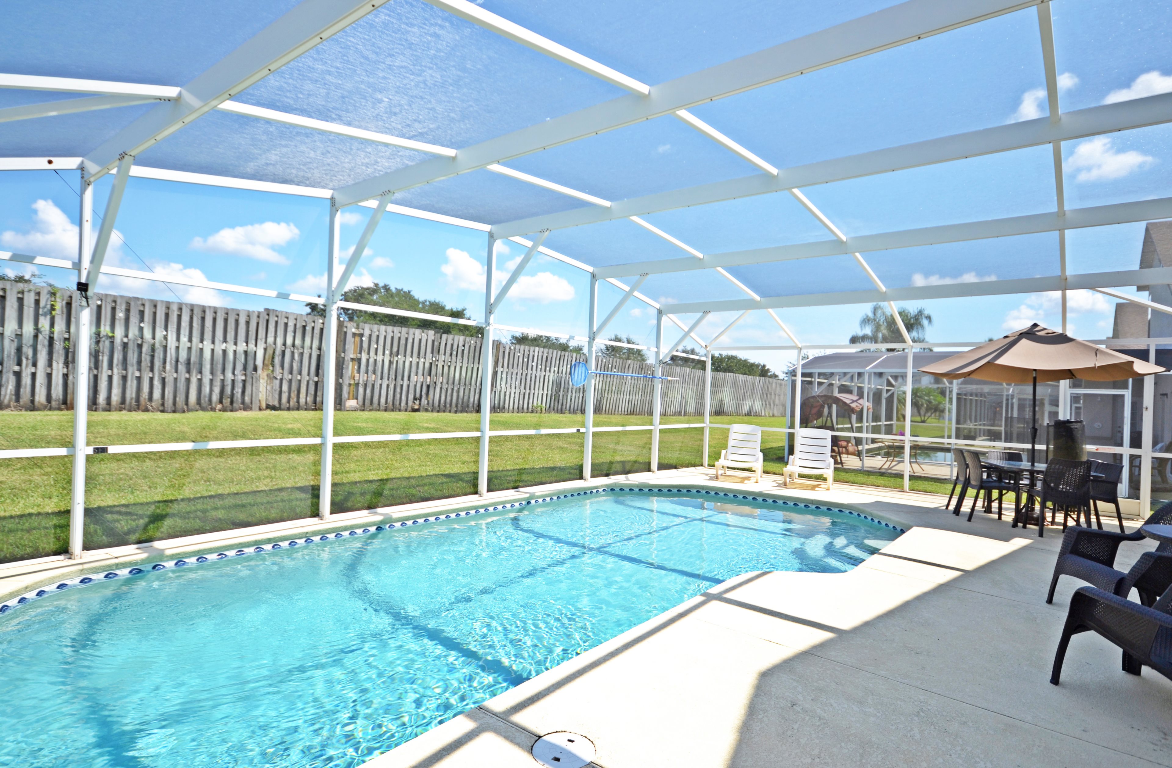Chill out in family room with large screen TV and cable services. Sliding doors lead from the family out to the pool. The pool has sun beds and table and chairs for a little alfresco dining. The pool does have an optional heater which can be activated at an extra cost.