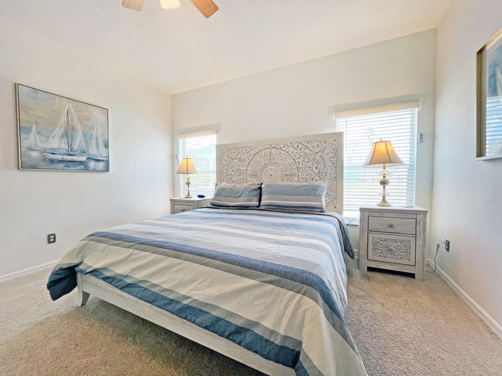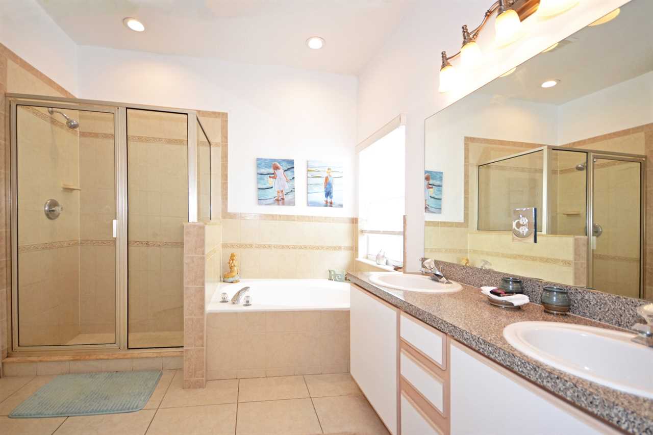 The king-size master bedroom is on the ground floor and is decorated in soothing colors with a beach theme. The bedroom has a generous ensuite including double sinks, bathtub and shower, together with walk-in wardrobe.