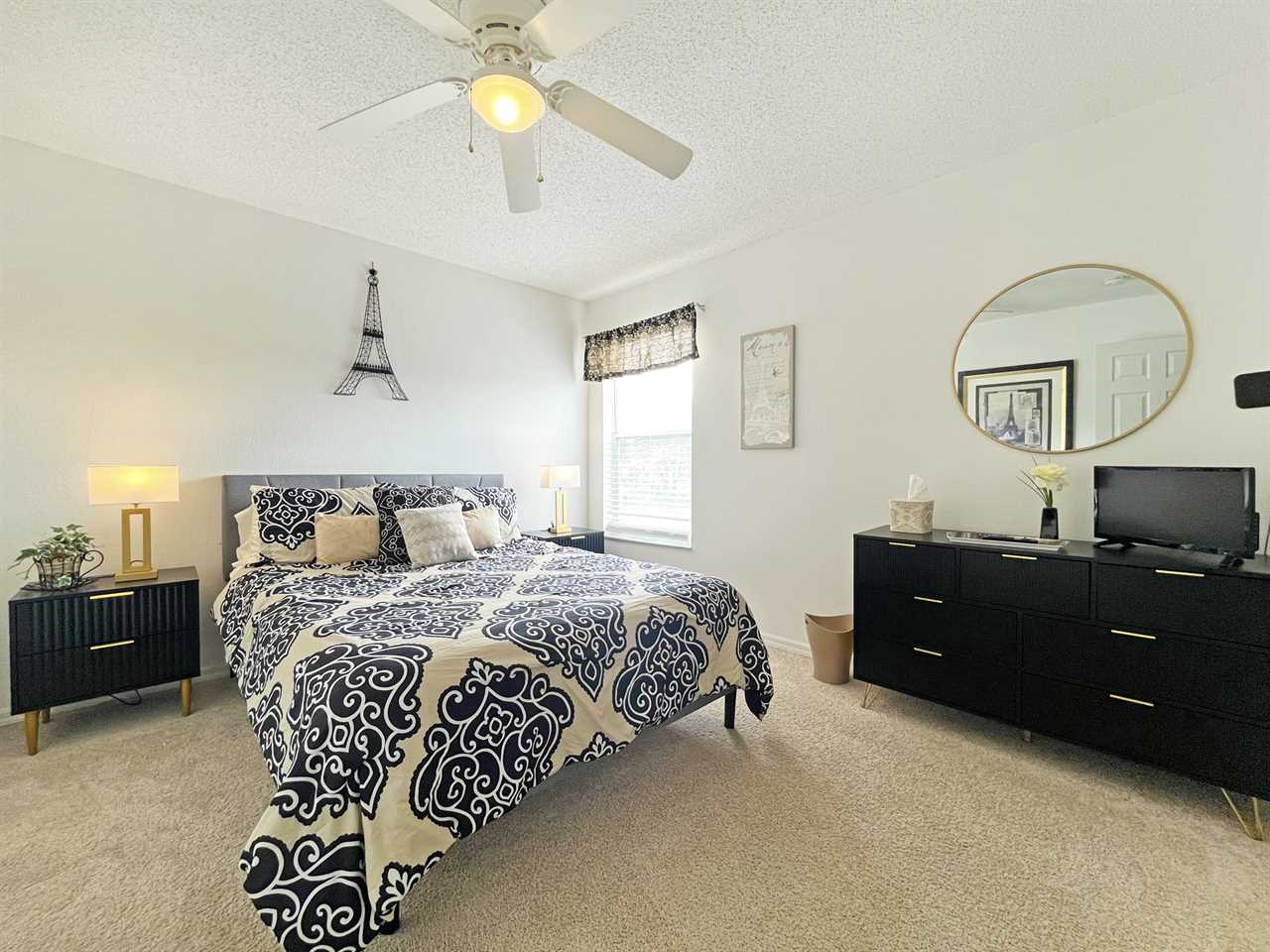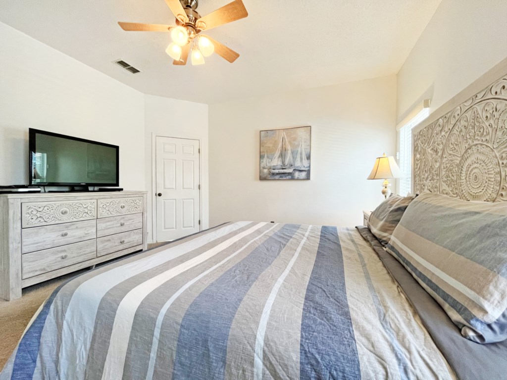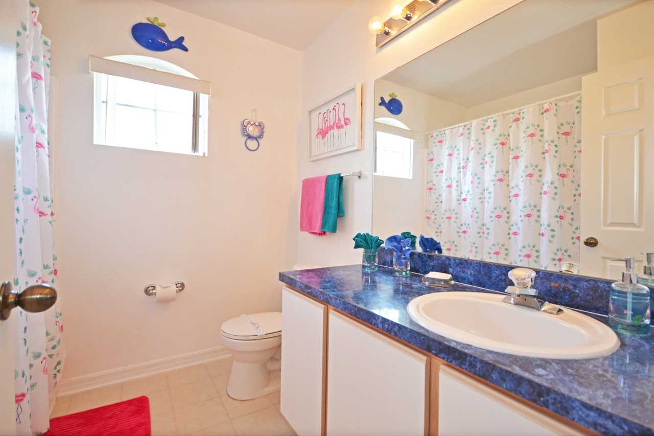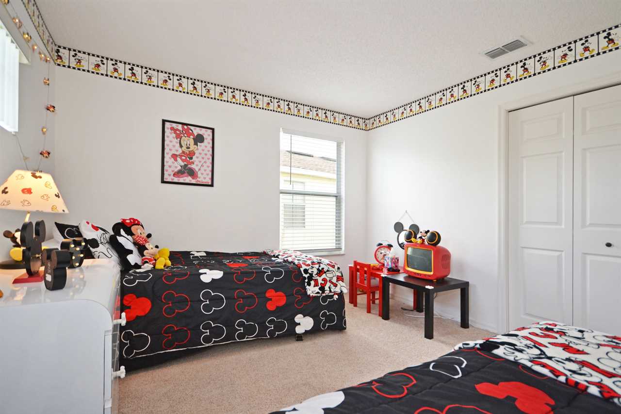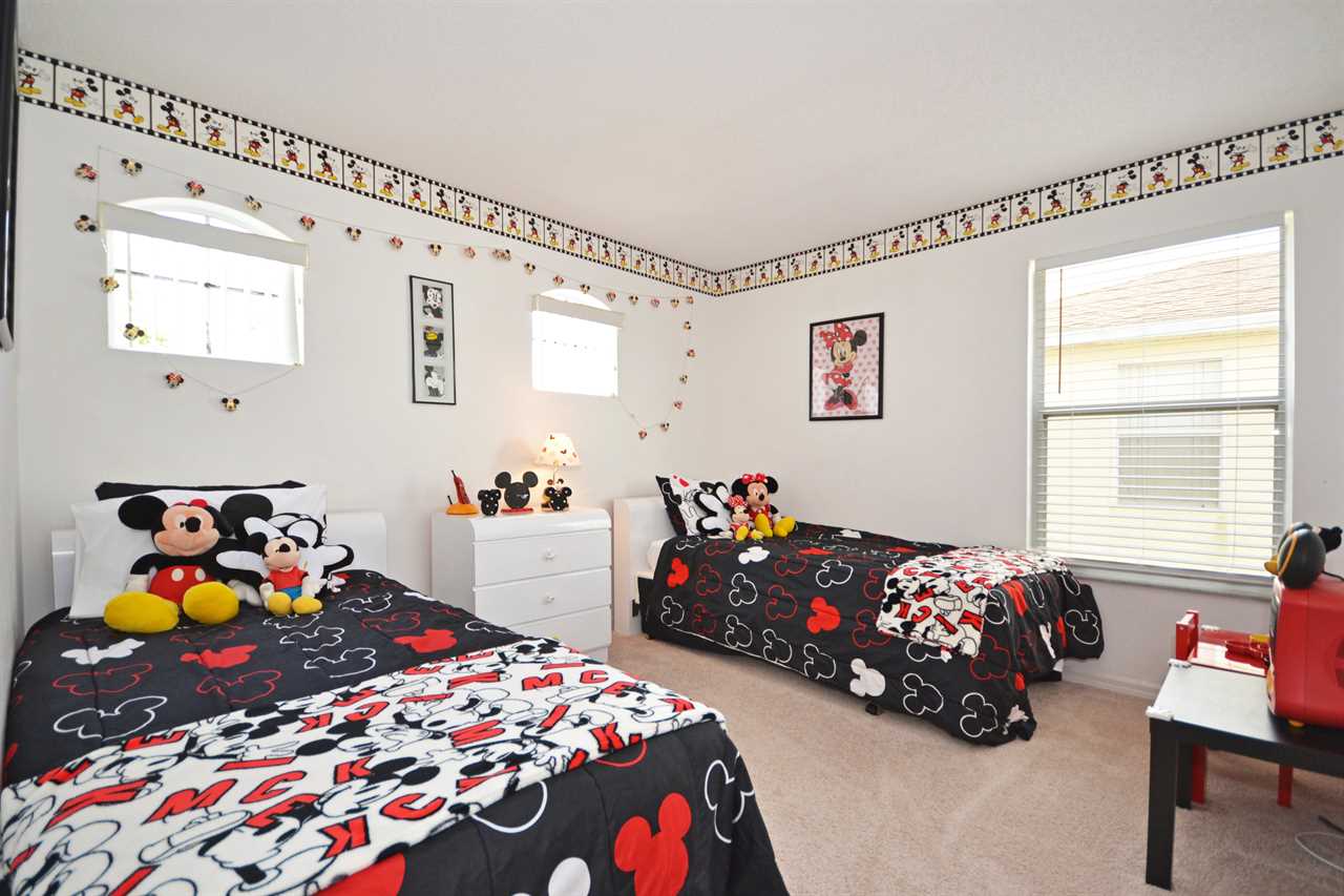 There is a second master bedroom downstairs, with ensuite including walk-in shower, both themed with florida palm tree décor. There are two twin bedrooms upstairs, perfect for the children, which share a bathroom. One bedroom brings the magic of Disney presented in a Mickey and Minnie theme; the other takes you out to sea in a fantastic nautical theme. The final bedroom upstairs has a queen bed and brings a touch of Parisian glamour.