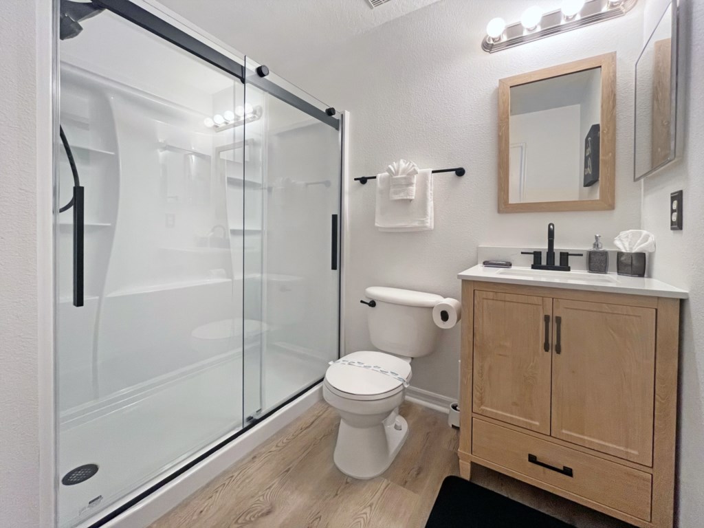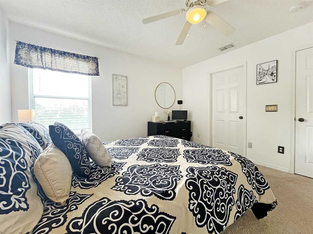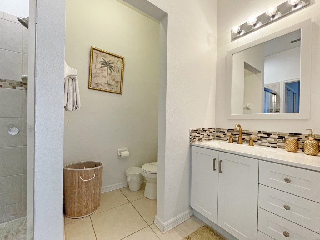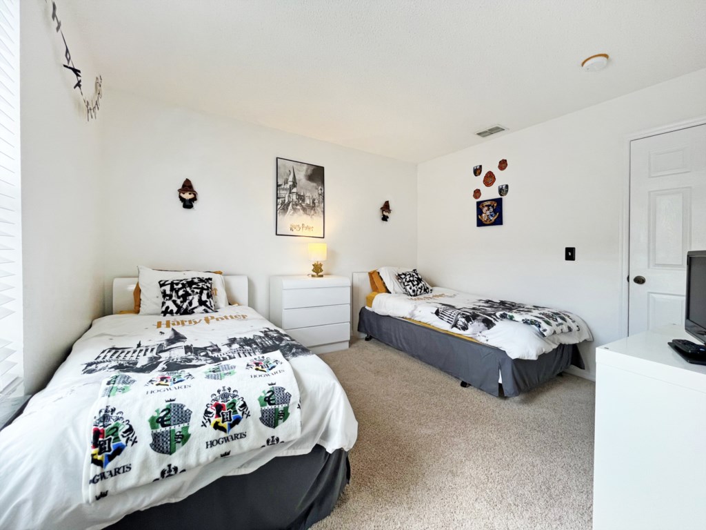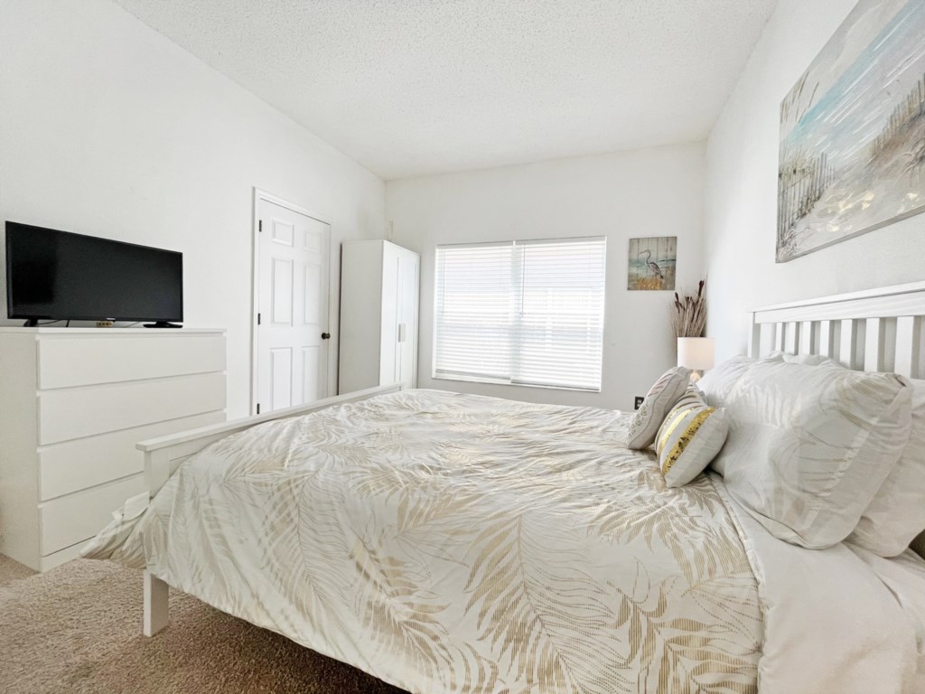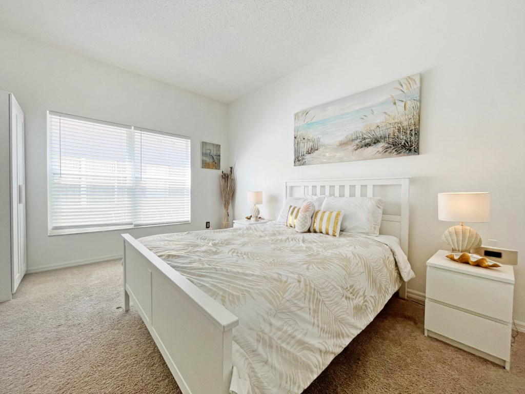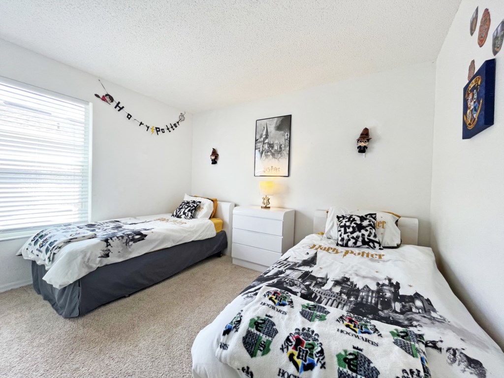 There is a second master bedroom downstairs, with ensuite including walk-in shower, both themed with florida palm tree décor. There are two twin bedrooms upstairs, perfect for the children, which share a bathroom. One bedroom brings the magic of Disney presented in a Mickey and Minnie theme; the other takes you out to sea in a fantastic nautical theme. The final bedroom upstairs has a queen bed and brings a touch of Parisian glamour.