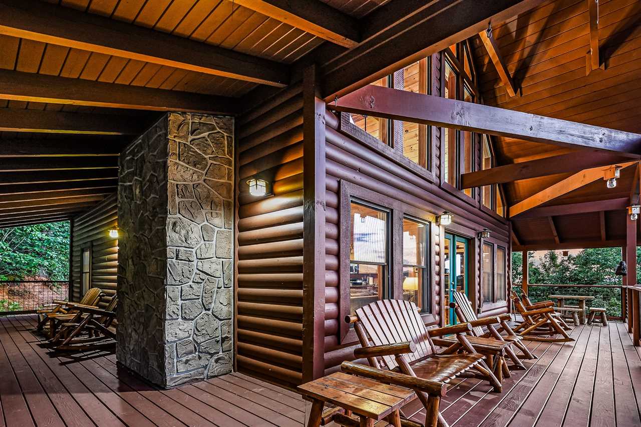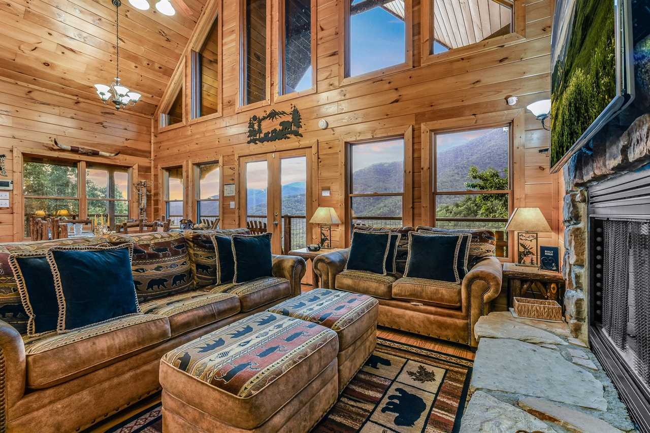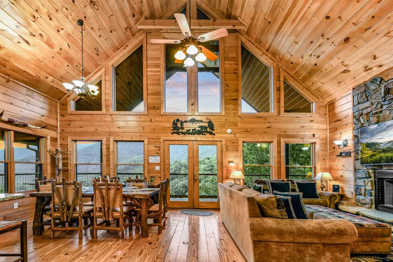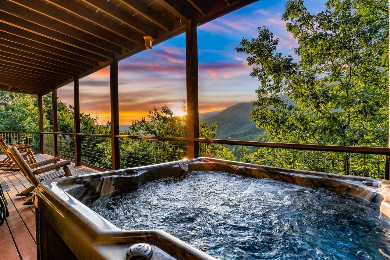 The great outdoors meets luxurious comfort. Step outside into your own private oasis, where a paved driveway leads you to a spacious cabin with breathtaking mountain views. Unwind in the soothing hot tub, perfectly positioned on one of the two covered decks, and take in the stunning scenery as the sun sets behind the trees. Gather around the charcoal grill and cook up a feast for your group, then enjoy dining on the patio furniture amidst the fresh mountain air. With two covered decks and ample outdoor seating, there's no shortage of space to soak up the natural beauty of the surroundings.