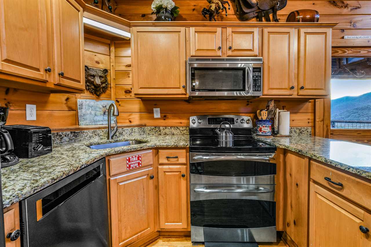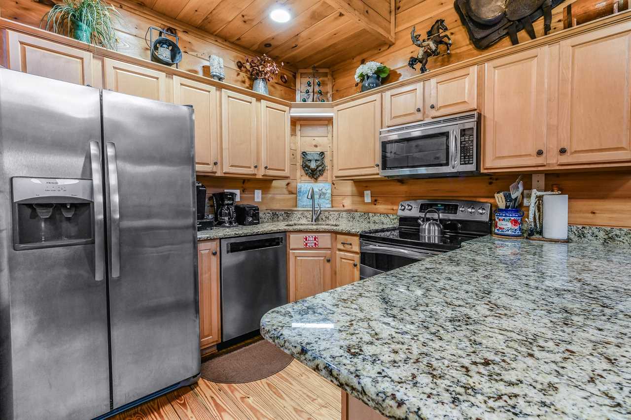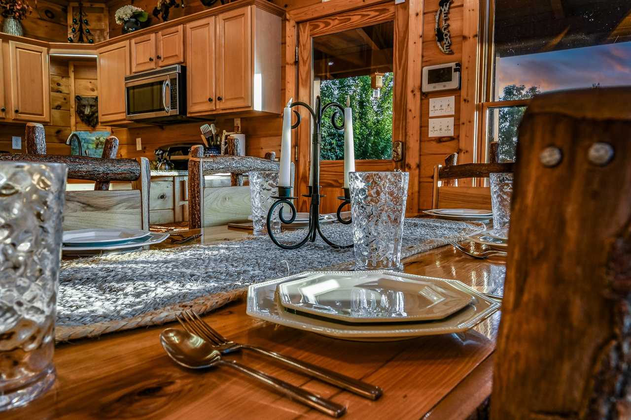 Prepare a culinary masterpiece in the fully equipped kitchen where modern conveniences meet rustic charm. Stainless steel appliances make cooking and entertaining a breeze, including a stove, refrigerator, microwave, and dishwasher for easy cleanup and ample counter space for meal prep. Enjoy a morning coffee or breakfast at the bar with seating for three, perfect for socializing with friends and family. A coffee maker and blender are always ready to whip up your favorite treats. When mealtime arrives, gather around the dining room table, which seats six comfortably, and enjoy a home-cooked meal amidst the peace and tranquility of the surrounding woods. With everything you need to cook delicious meals, this kitchen is the perfect place to create lasting memories with loved ones. Dish towels, Dish starter, and dishwasher starter pods are provided.