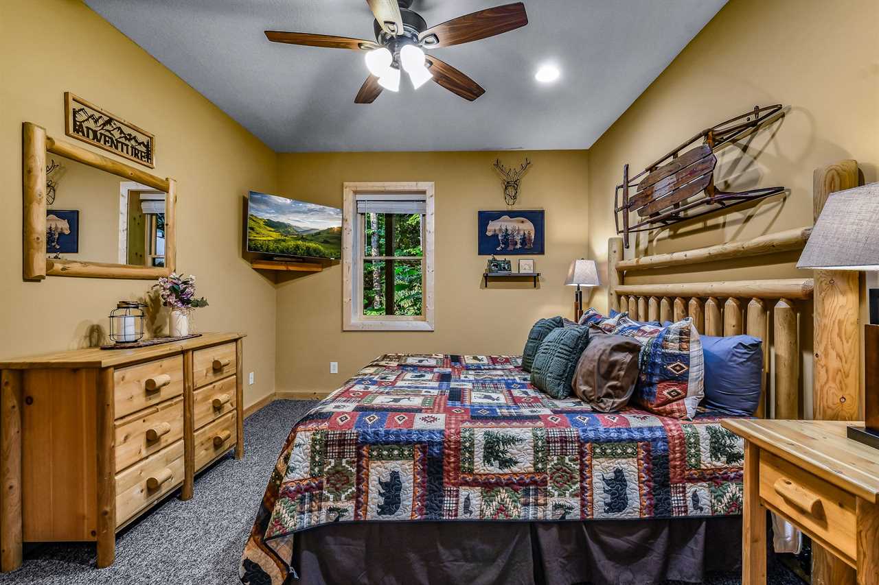 Cozy up in the inviting living room, where comfort and relaxation await. Sink into the plush loveseat or sofa sleeper, perfect for snuggling up with a good book or taking a nap after a day of exploring. The flat-screen TV provides endless entertainment options, while the rocker offers a soothing spot to rock your worries away. As the evening winds down, the gas fireplace crackles to life, casting a warm glow over the room and making it the perfect spot to gather with loved ones. With its warm and welcoming atmosphere, this living room is the perfect place to unwind and recharge after a day of adventure in the great outdoors.