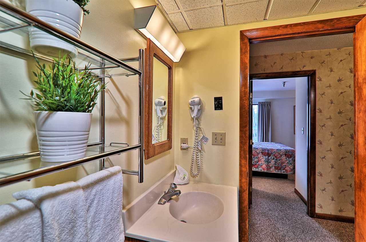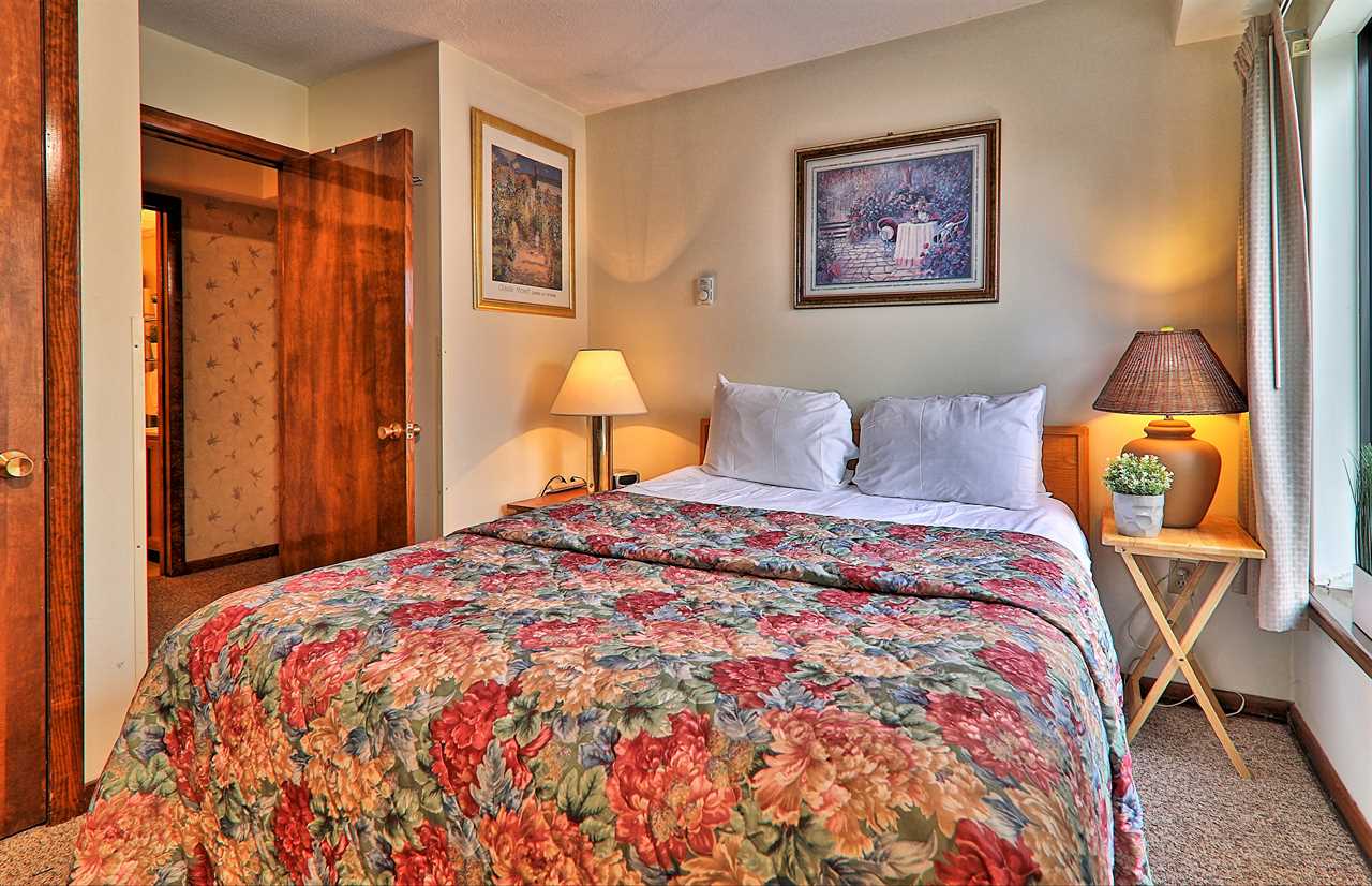 Our one bedroom condo sleeps four people in one queen bed and one sleeper sofa and features a full bathroom with shower/tub.