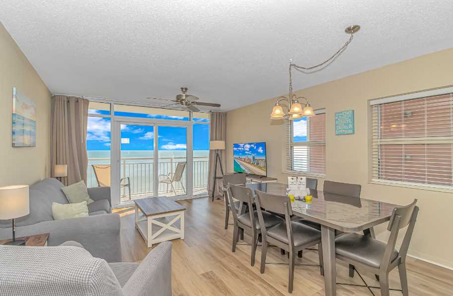 The search for your next vacation stops here! Check out this 7th floor, direct ocean front, updated, 2 bedroom apartment at The Atlantica Resort in Myrtle Beach. This 2 bedroom, 2 bath condo is fully furnished with 1 queen size bed, 1 full size bed, 1 king bed, and 1 queen sleeper sofa. The layout of this rental will comfortably accommodate 8 guests.
