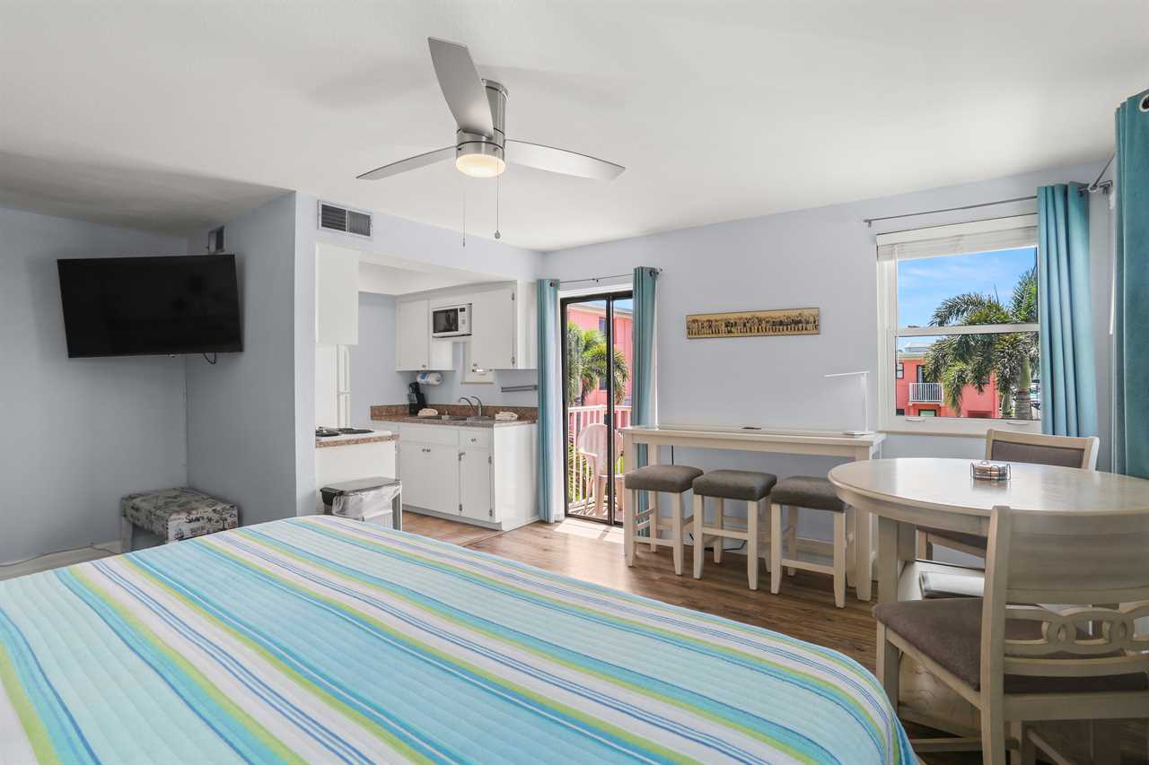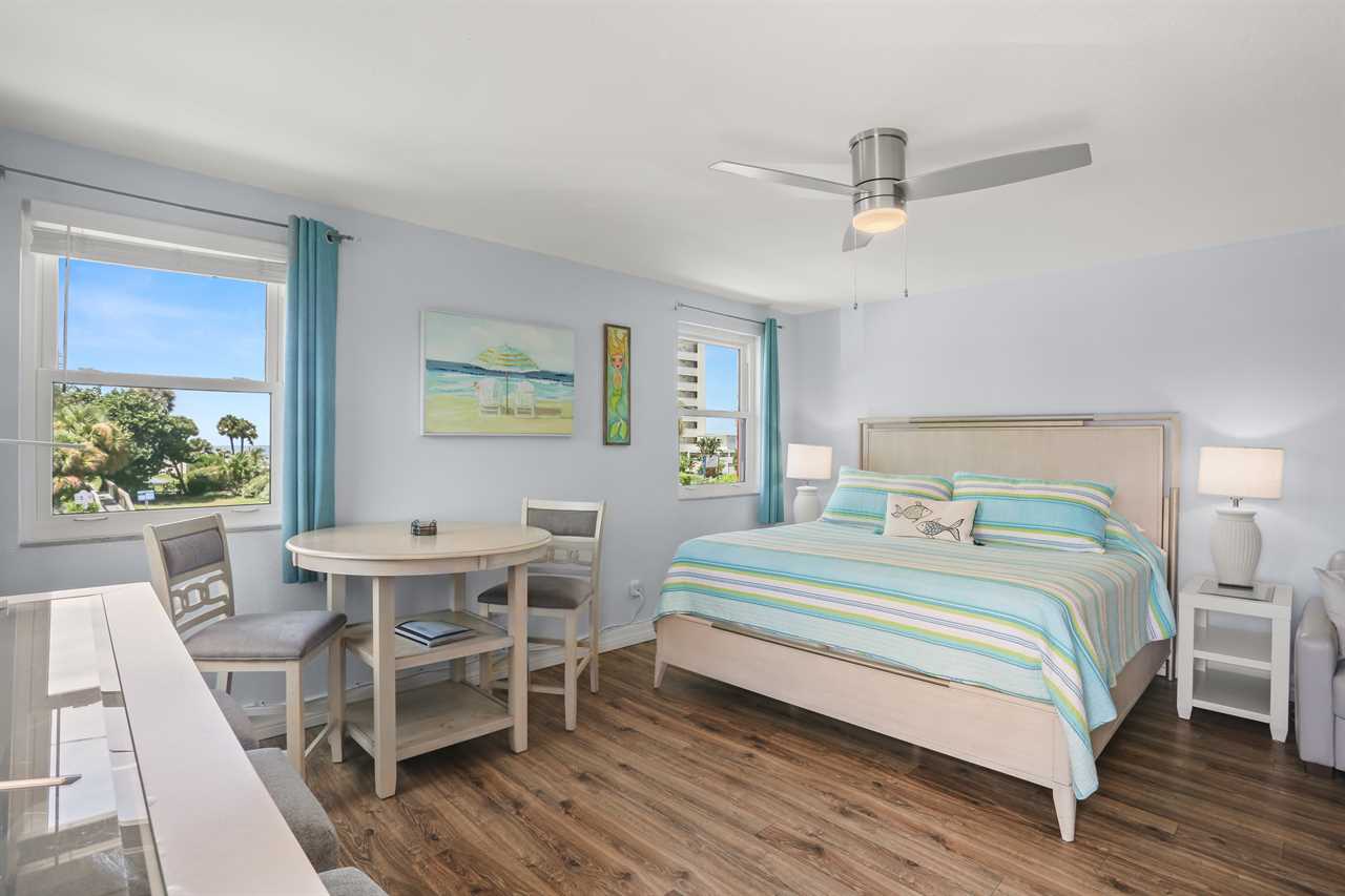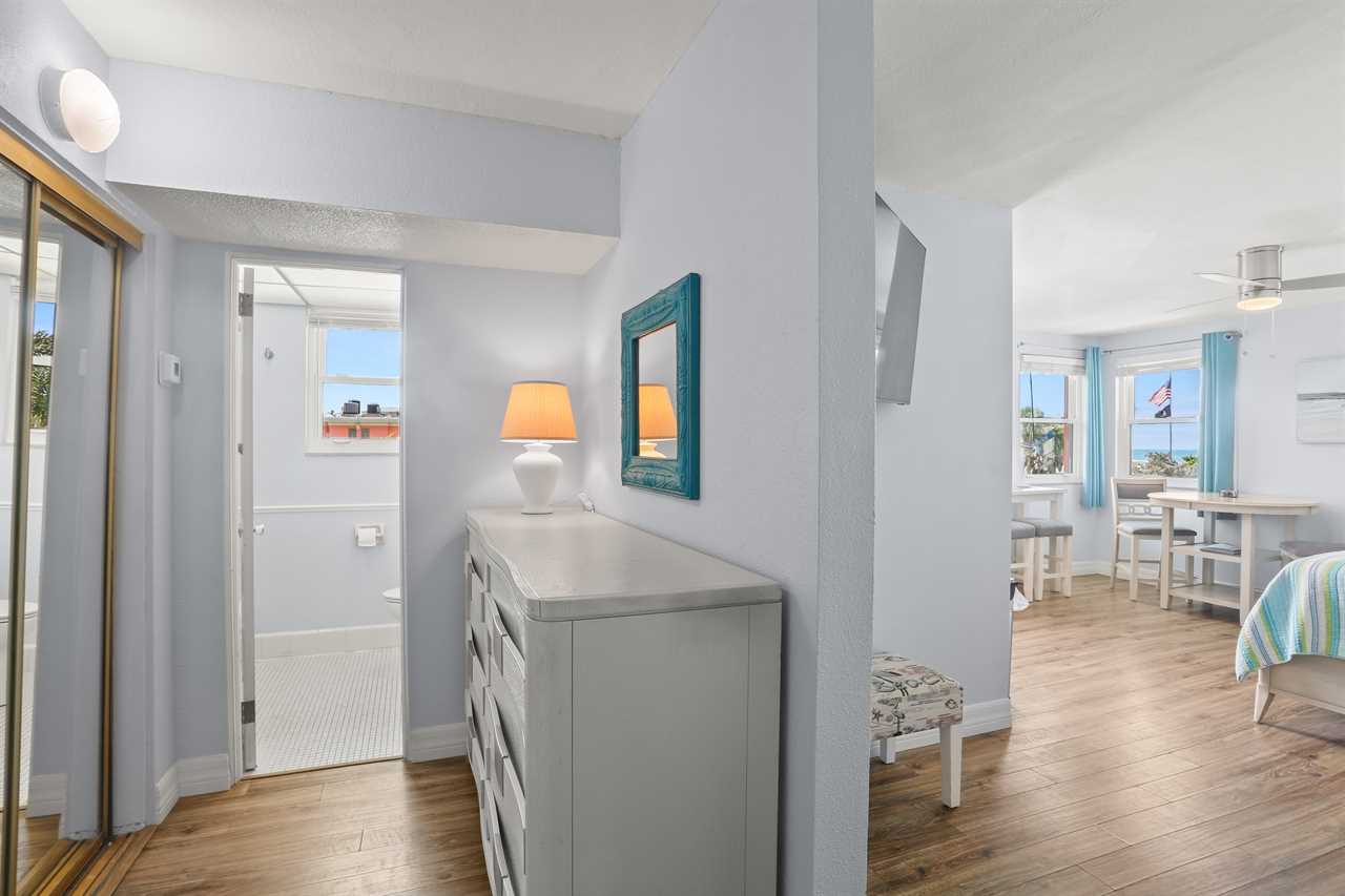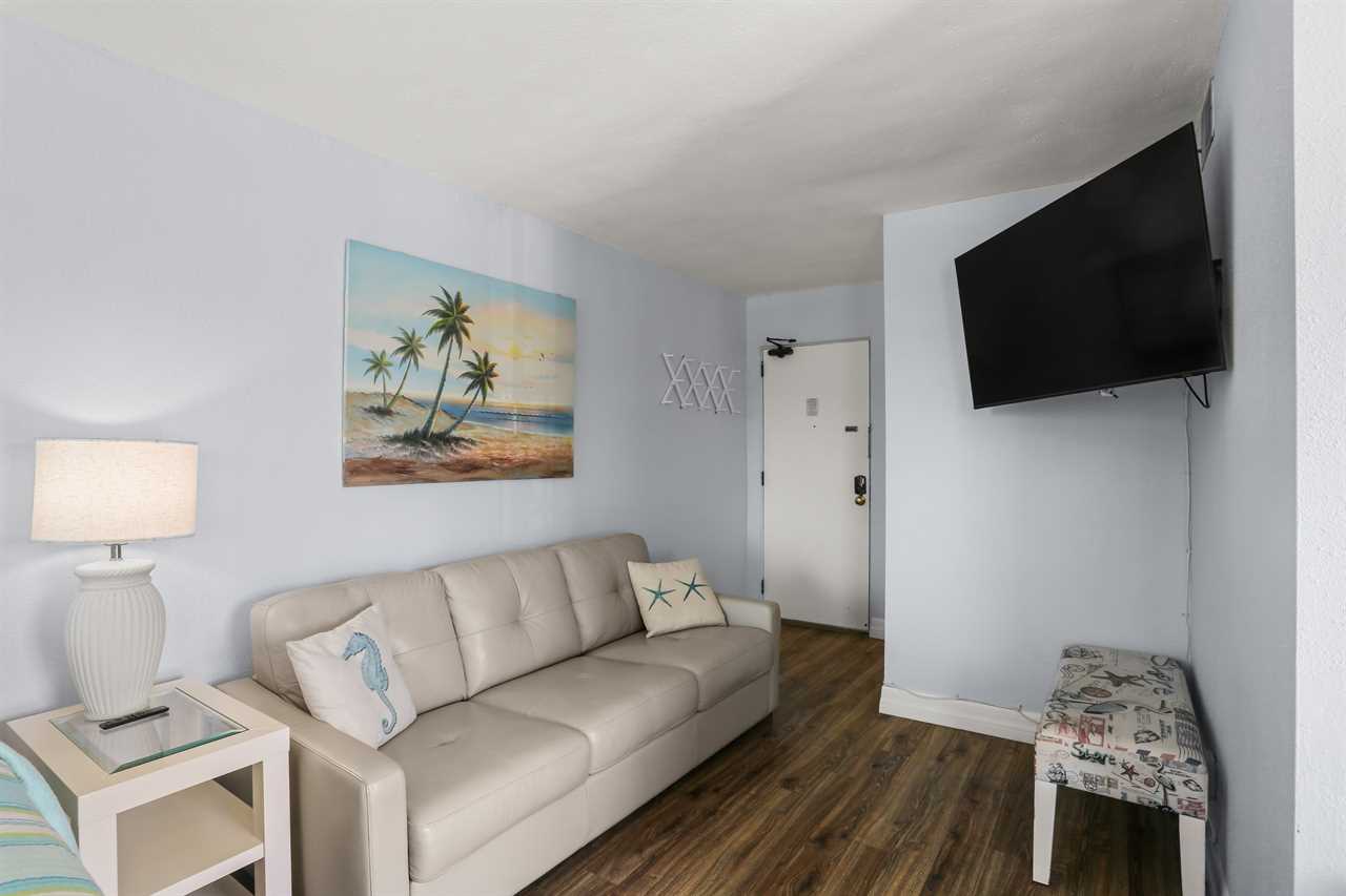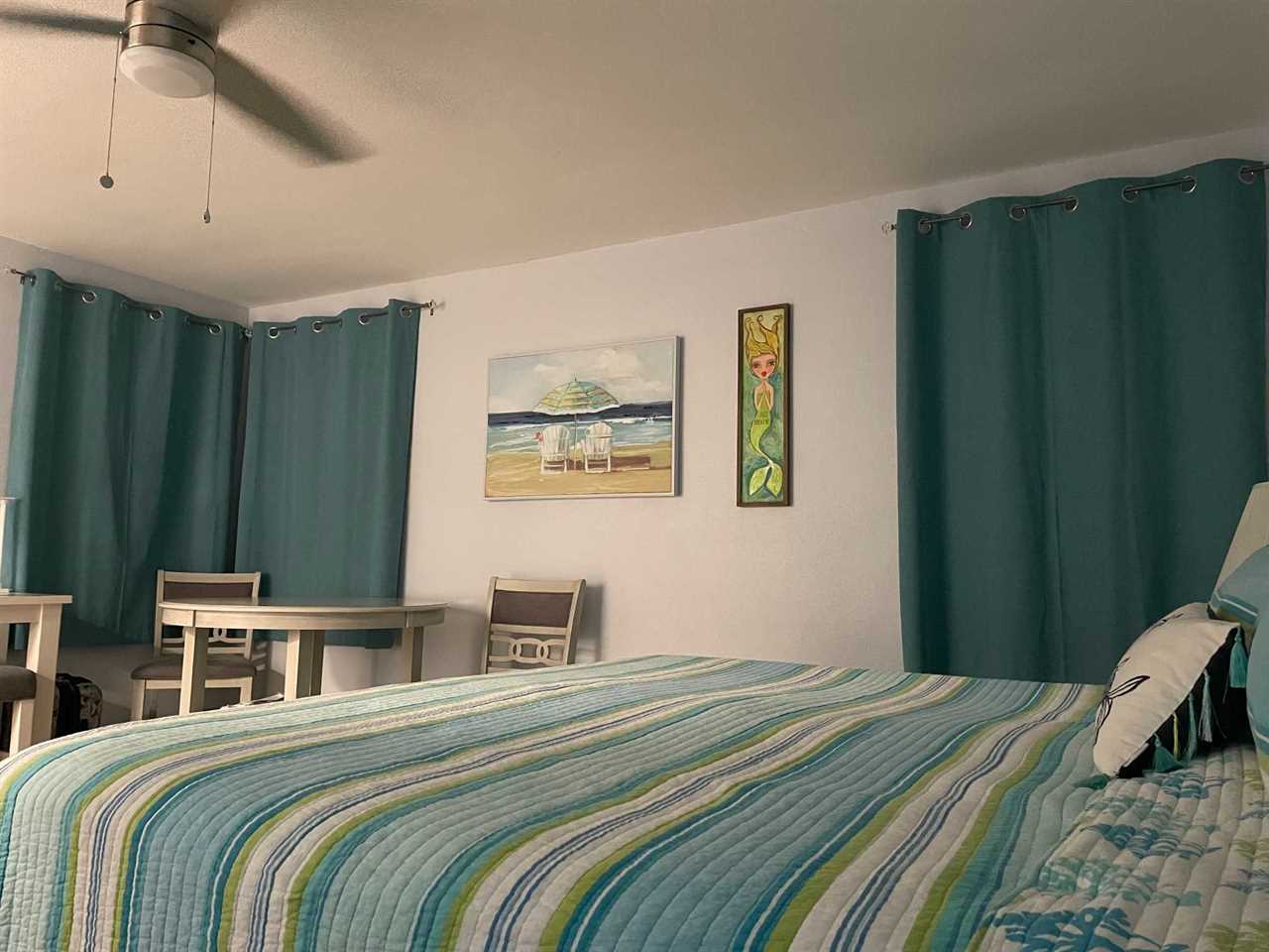 When you walk into the unit, there is a sitting area with a 50" Samsung Smart TV that swivels towards the bed. It is a studio, but feels spacious and comfortable. To the left of the sitting area is a dressing area leading to the bathroom with a large dresser and mirrored closet. This area offers private space for getting dressed away from the main area of the condo. Walk past the sitting area to the main area of the condo. There is a nicely-equipped kitchen with clean appliances and dishes, cups, utensils, and cookware. There is a dining area with views of the beach. There is also a private balcony. This condo is so bright and sunny.