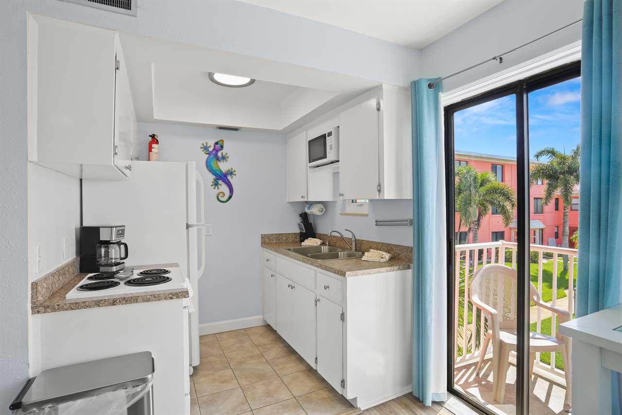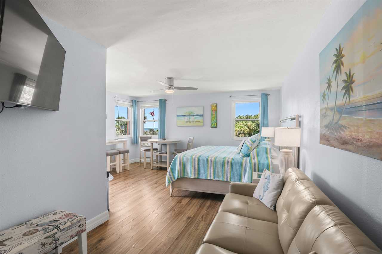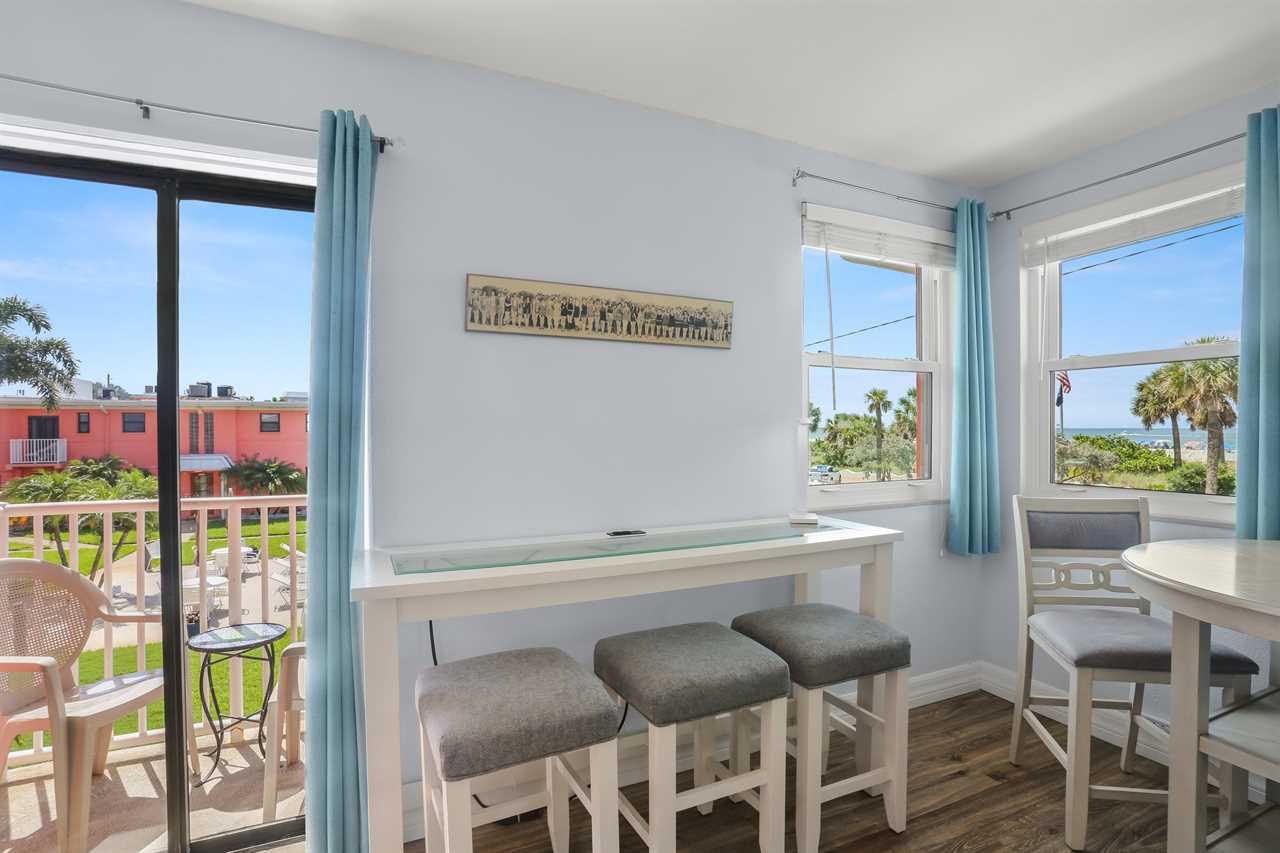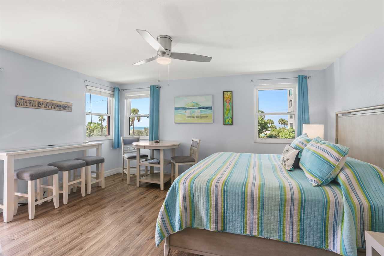 When you walk into the unit, there is a sitting area with a 50" Samsung Smart TV that swivels towards the bed. It is a studio, but feels spacious and comfortable. To the left of the sitting area is a dressing area leading to the bathroom with a large dresser and mirrored closet. This area offers private space for getting dressed away from the main area of the condo. Walk past the sitting area to the main area of the condo. There is a nicely-equipped kitchen with clean appliances and dishes, cups, utensils, and cookware. There is a dining area with views of the beach. There is also a private balcony. This condo is so bright and sunny.
