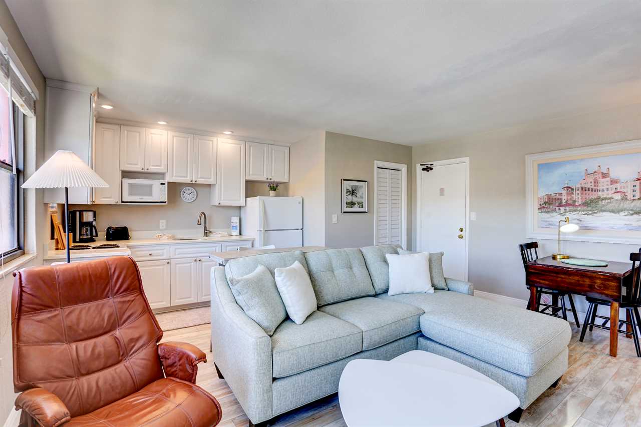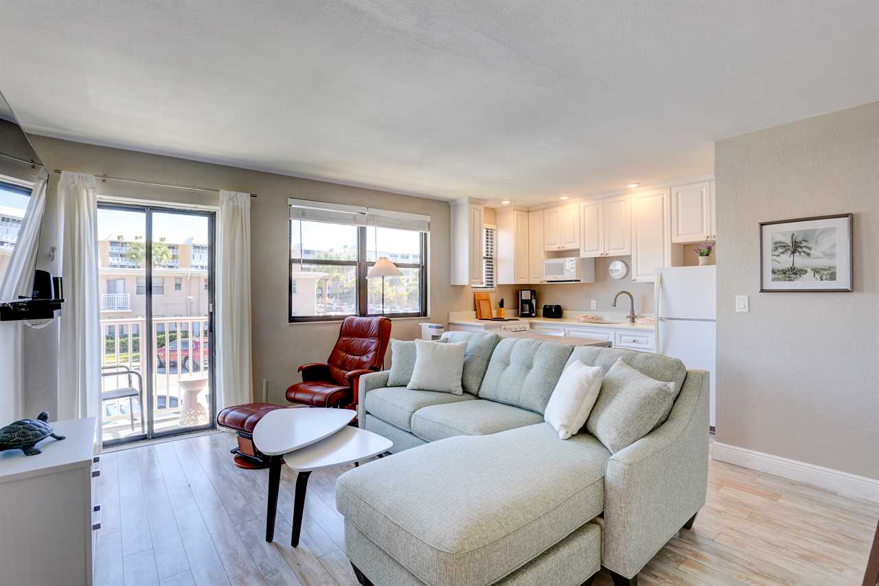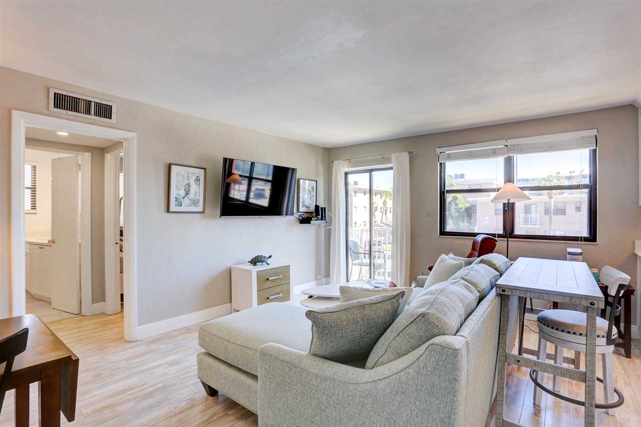 - Living Area: Bright and cheery with natural light and coastal charm