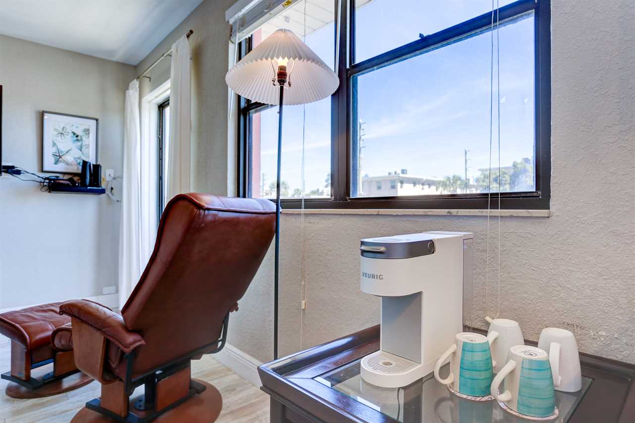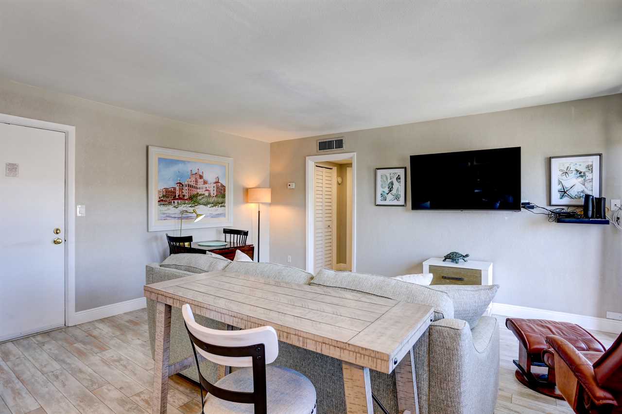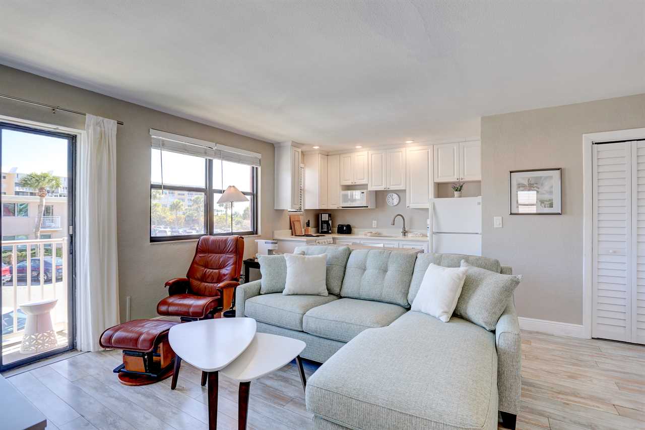 - Living Area: Bright and cheery with natural light and coastal charm