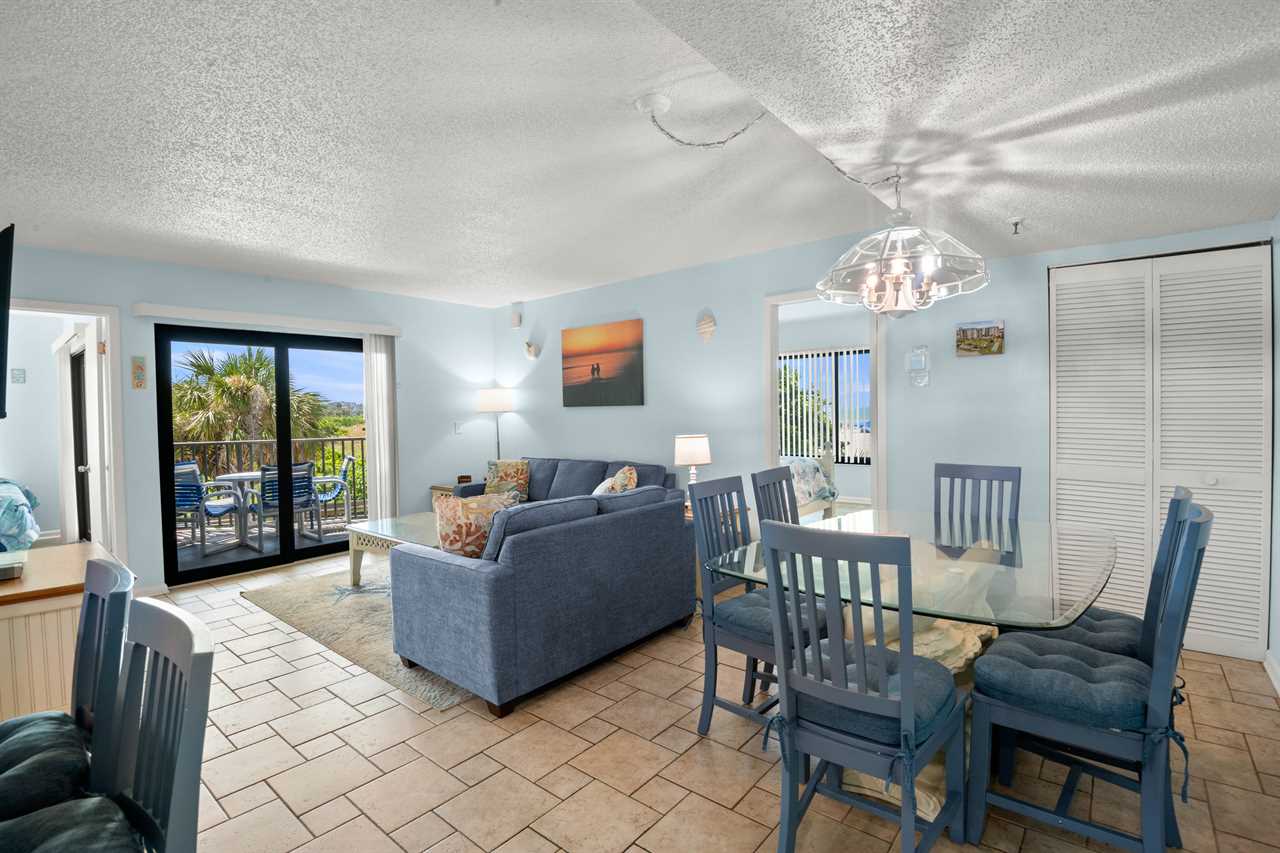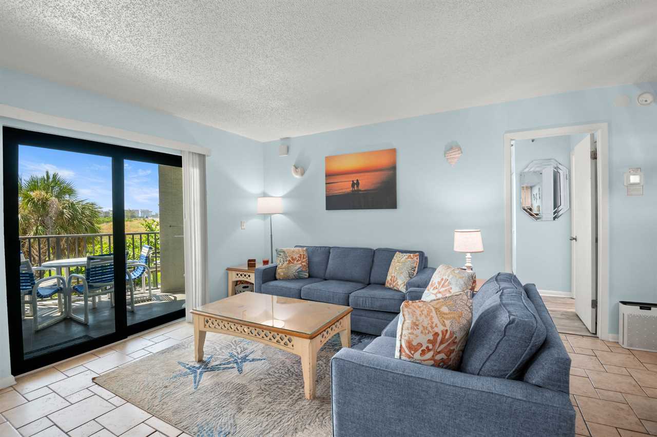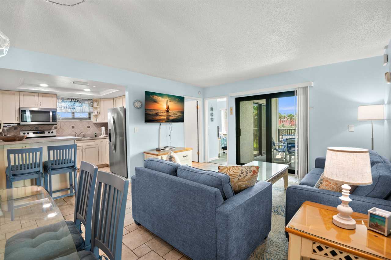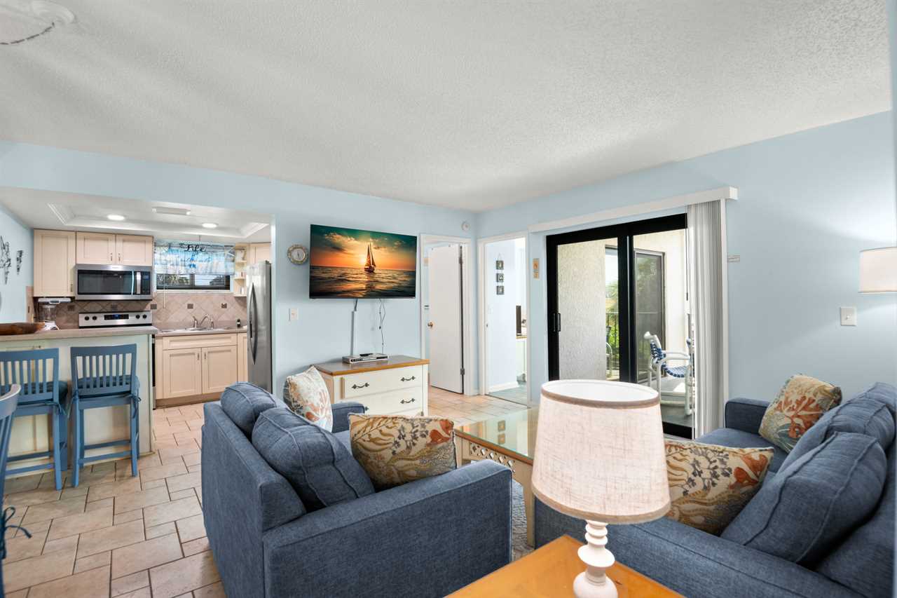 - Living Room β βAir Dreamβ sleeper sofa (inflatable mattress), love seat, 40β flat screen TV, balcony access