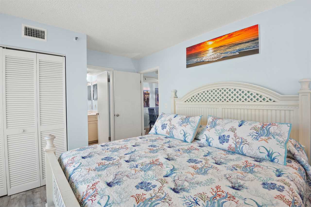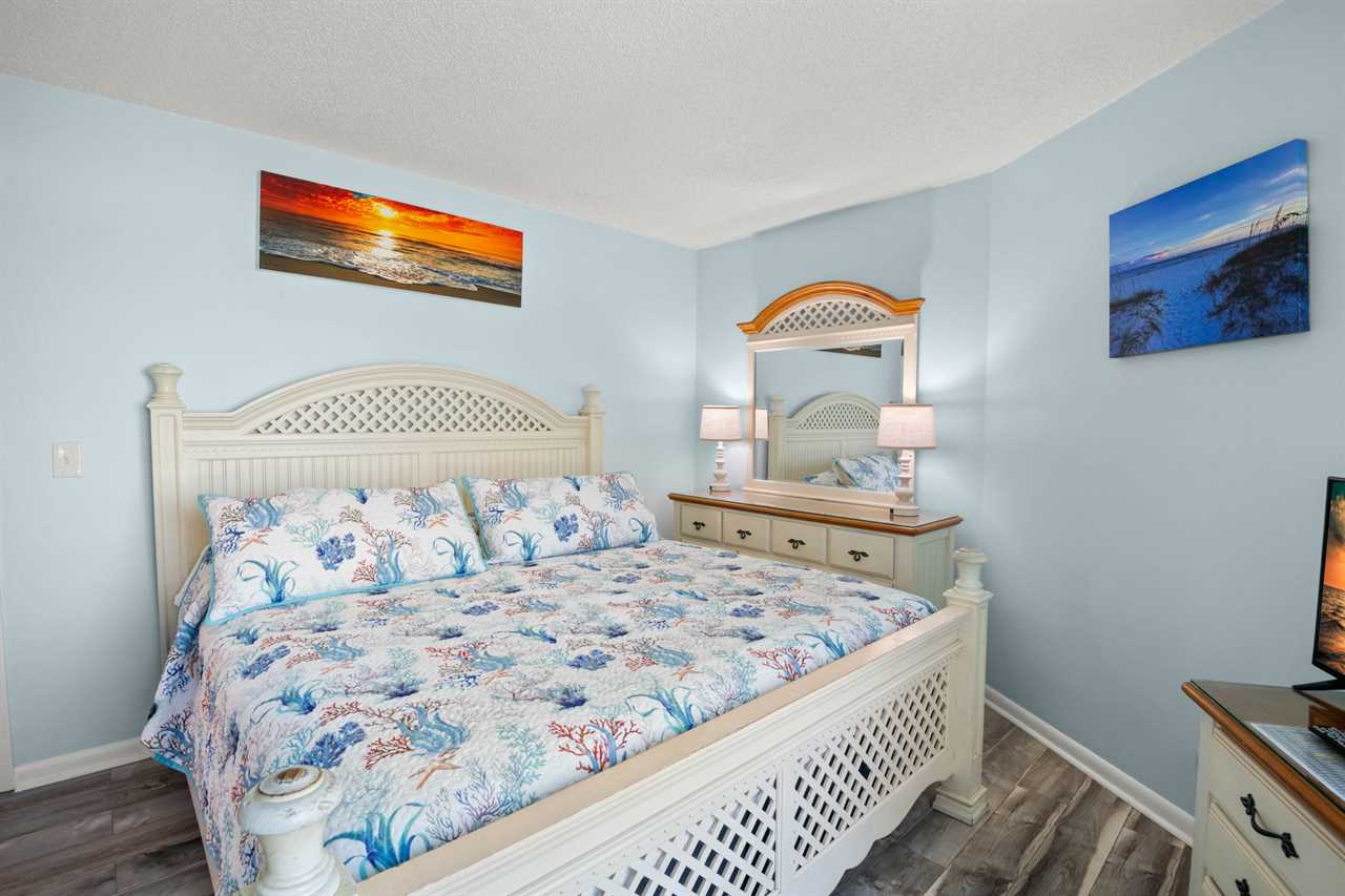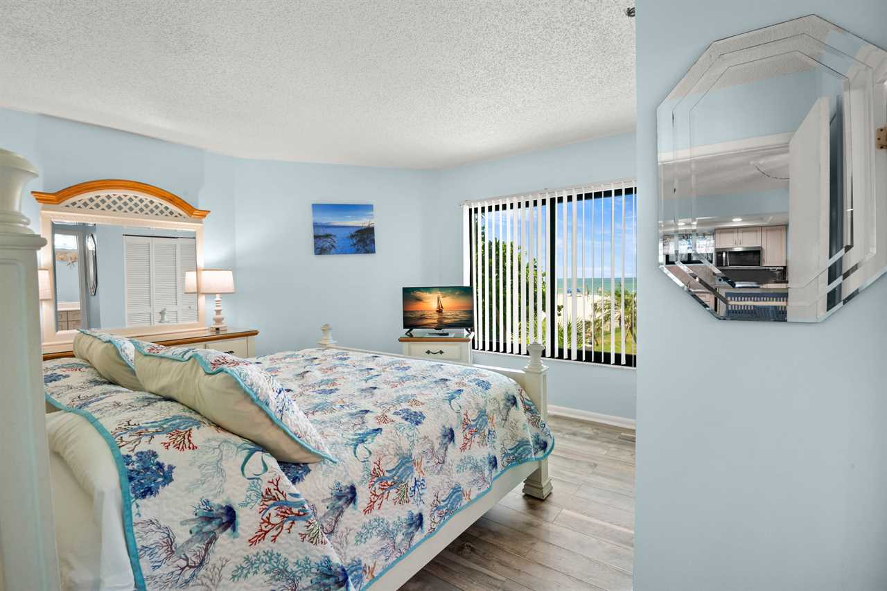 - Master Bedroom β King-size bed, 32β flat screen TV, large beach-facing window