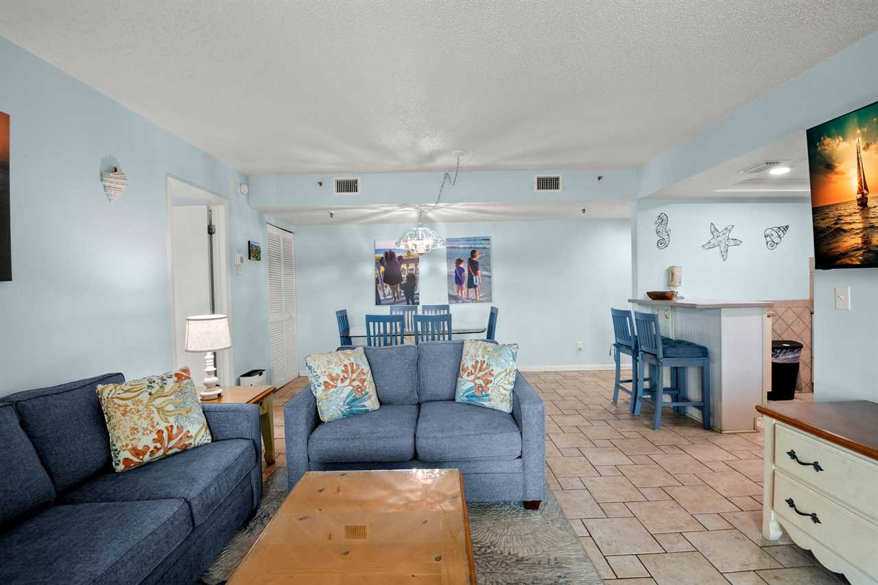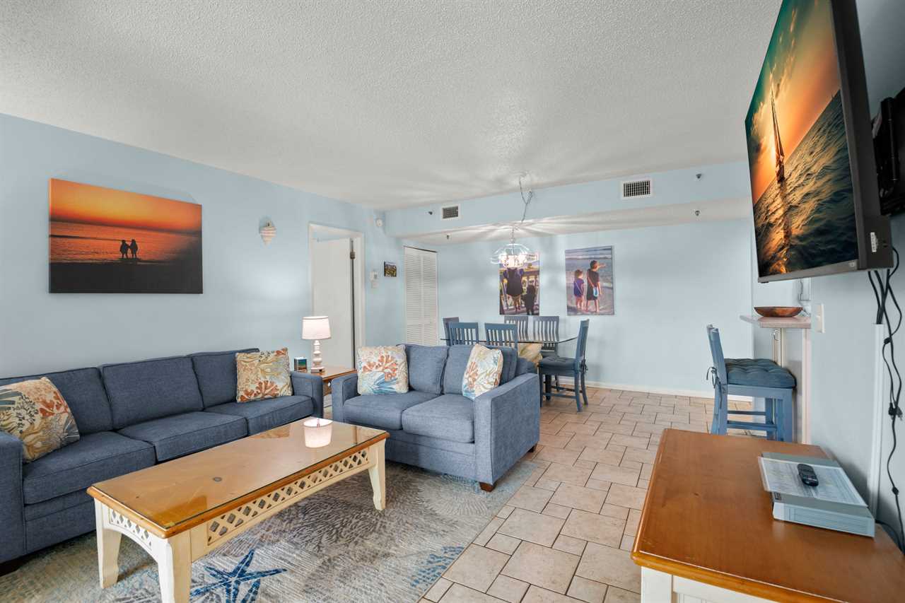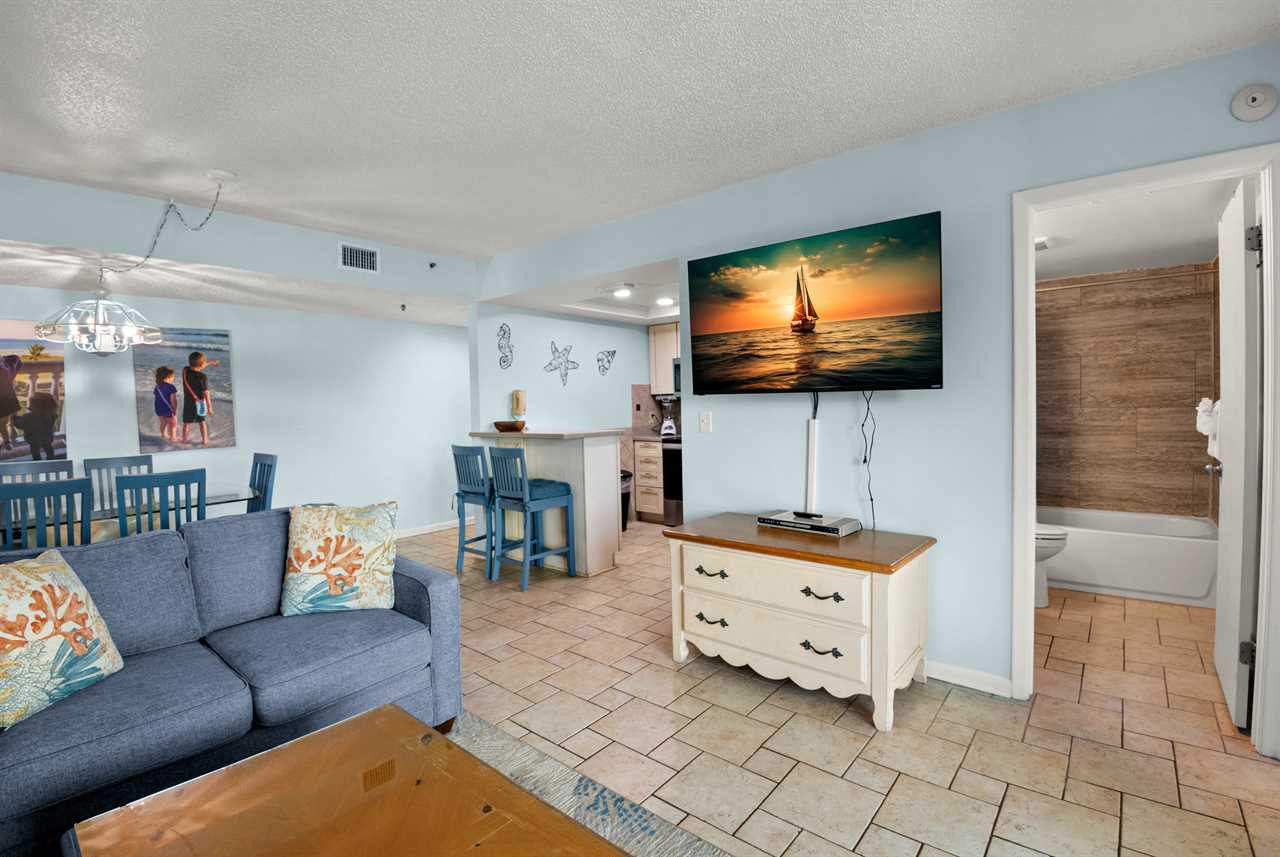 - Master Bedroom β King-size bed, 32β flat screen TV, large beach-facing window