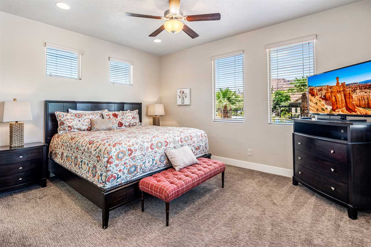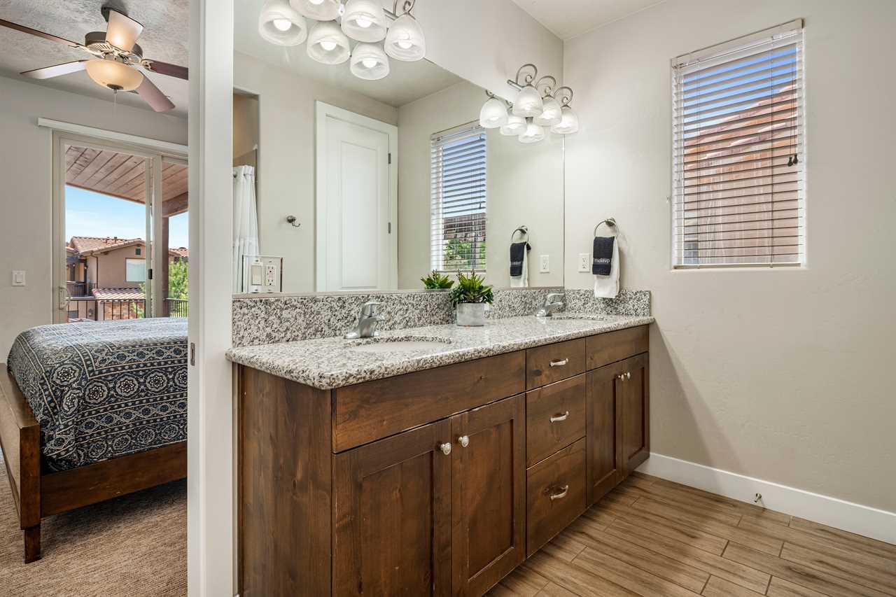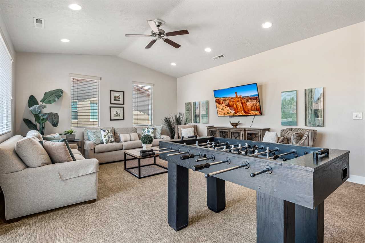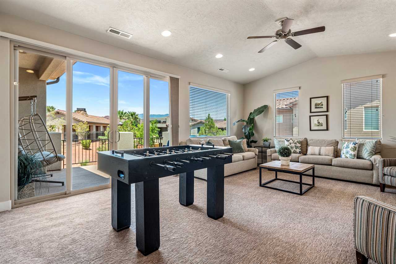 Poolside Paradise is a beautiful 4 bedroom / 4 & 2 ½ bath home that can comfortably accommodate 12 guests or up to 20 guests with the assistance of 3 queen air mattresses. The expansive fully equipped kitchen, grill, indoor & outdoor dining, and outdoor lounge areas make hosting family & friends a breeze. Spend your days lounging next to Paradise Village's resort-style pool or swimming at their waterpark! Take off for a day trip to one of the National or State parks within a close drive to explore the beauty Southern Utah has to offer. Back at home, challenge each other to ping pong, foosball, and Nintendo switch tournaments. Evenings will quickly become your favorite time of day as you lounge in the hammock on the balcony while watching the sunset over the desert mountains! Grab a bowl of popcorn and settle in for a cozy movie night, with two living rooms, each with a Smart TV, everyone will be able to find a movie they can enjoy! Whether you are adventuring through Southern Utah, lounging poolside, or competing in a ping pong tournament, you will find your own personal paradise at Poolside Paradise!