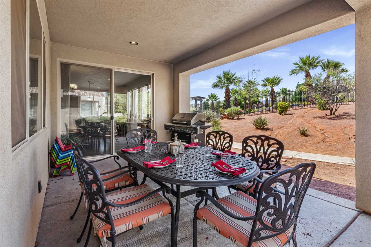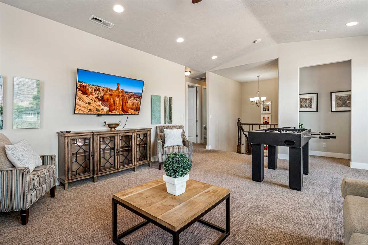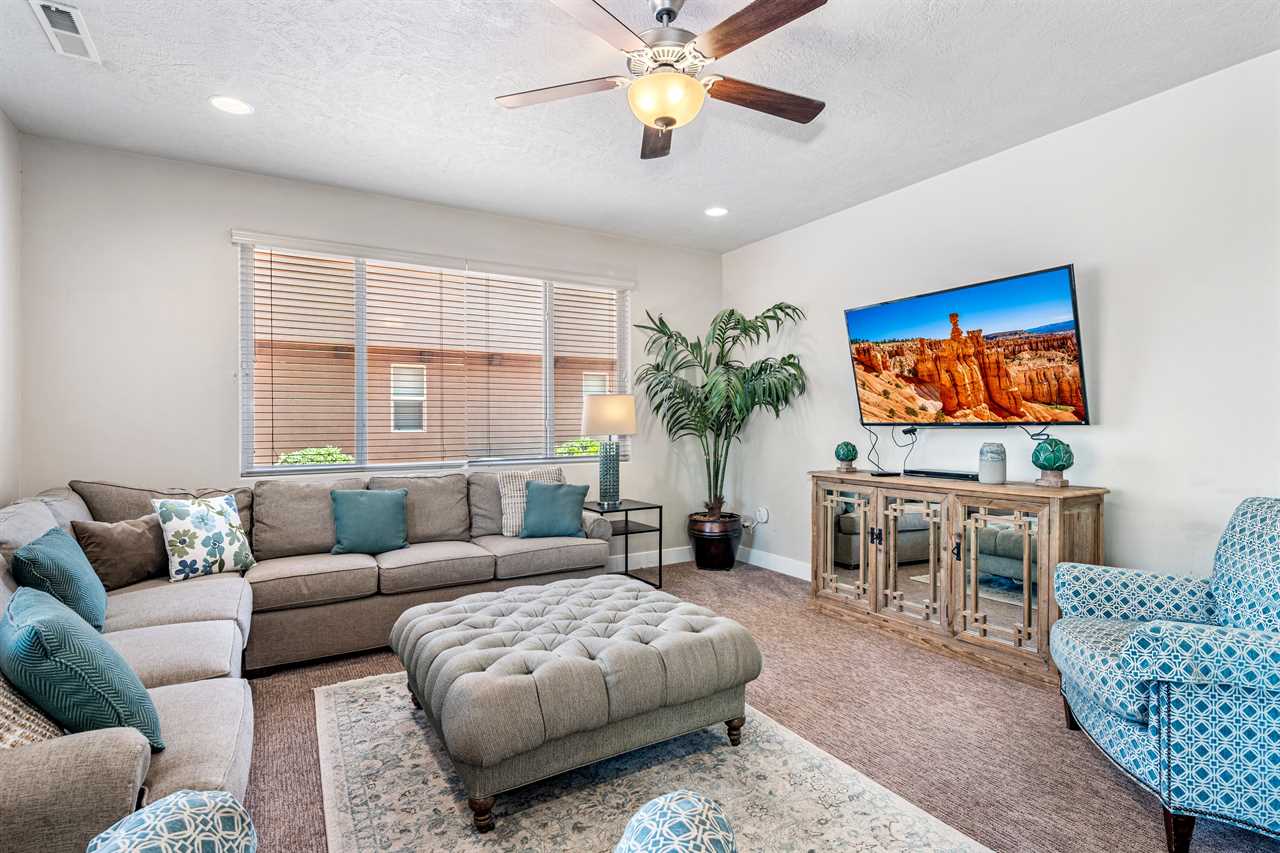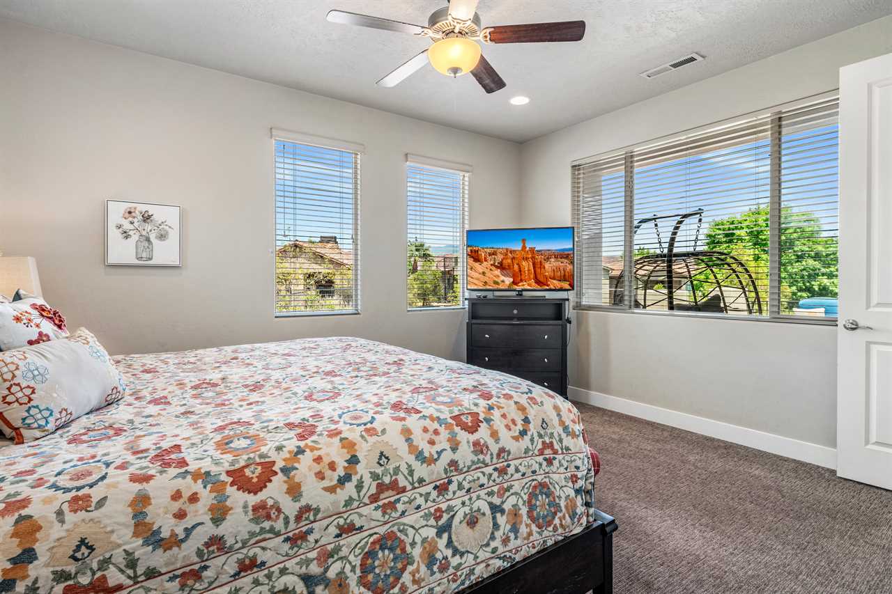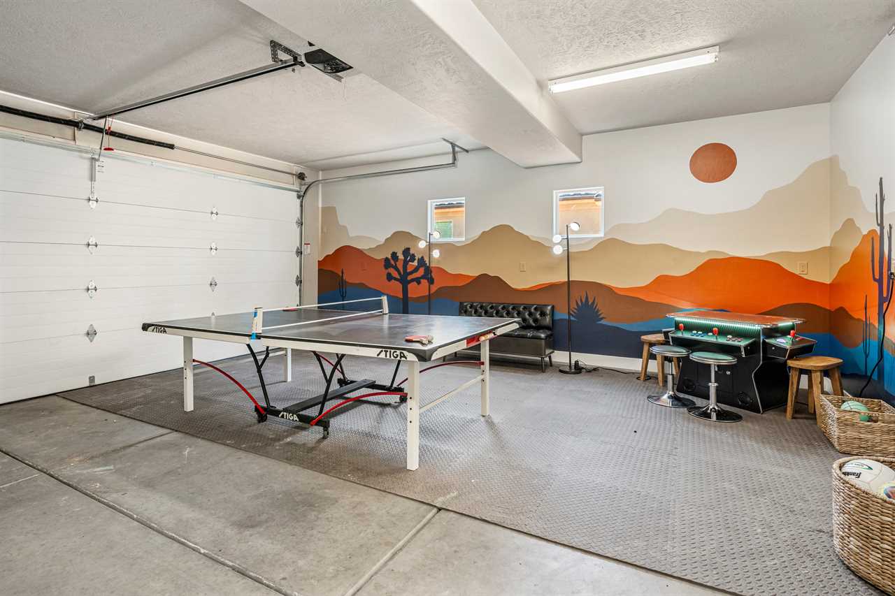 Poolside Paradise is a beautiful 4 bedroom / 4 & 2 ½ bath home that can comfortably accommodate 12 guests or up to 20 guests with the assistance of 3 queen air mattresses. The expansive fully equipped kitchen, grill, indoor & outdoor dining, and outdoor lounge areas make hosting family & friends a breeze. Spend your days lounging next to Paradise Village's resort-style pool or swimming at their waterpark! Take off for a day trip to one of the National or State parks within a close drive to explore the beauty Southern Utah has to offer. Back at home, challenge each other to ping pong, foosball, and Nintendo switch tournaments. Evenings will quickly become your favorite time of day as you lounge in the hammock on the balcony while watching the sunset over the desert mountains! Grab a bowl of popcorn and settle in for a cozy movie night, with two living rooms, each with a Smart TV, everyone will be able to find a movie they can enjoy! Whether you are adventuring through Southern Utah, lounging poolside, or competing in a ping pong tournament, you will find your own personal paradise at Poolside Paradise!