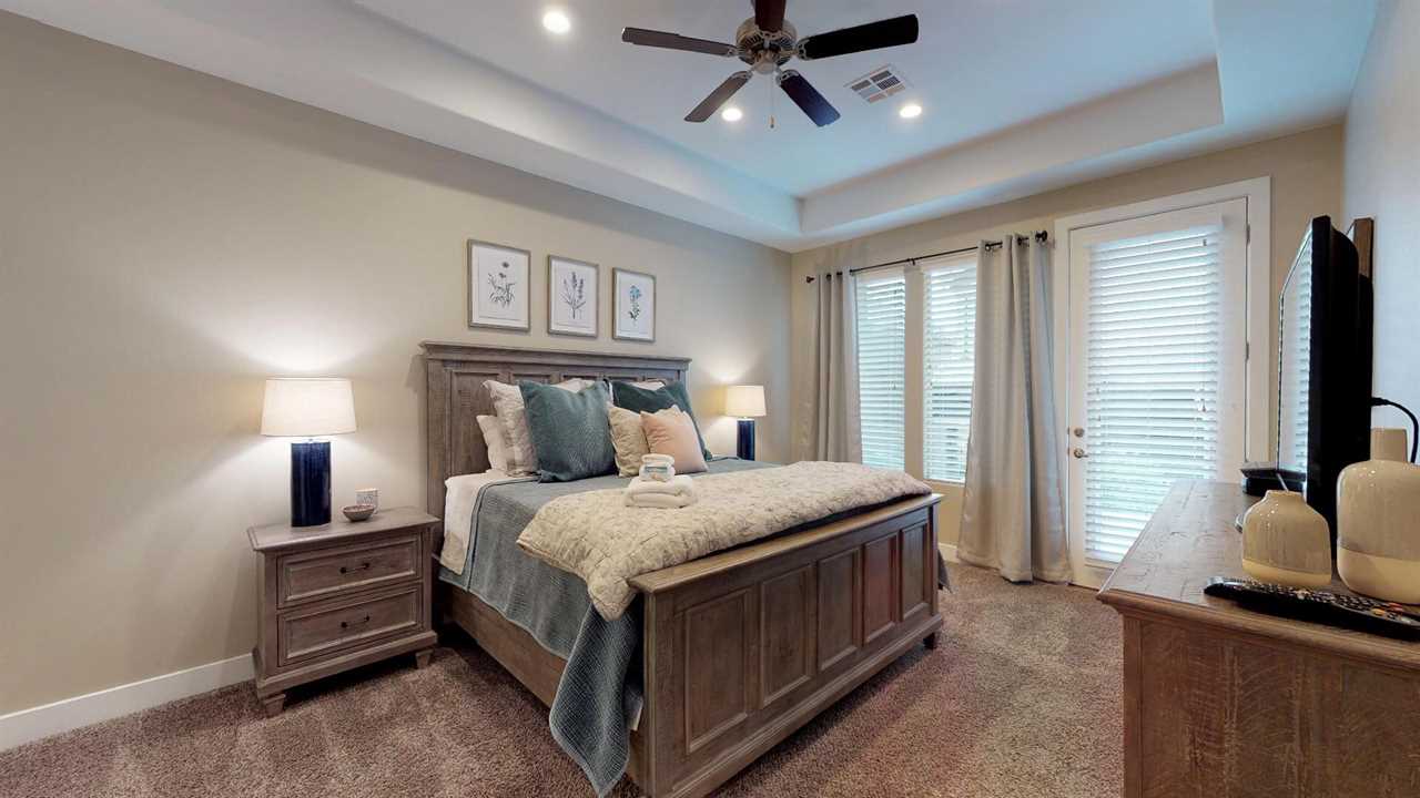 Main Level Master Bedroom: King bed, flat screen TV, bathroom suite with walk-in shower, large soaking tub and double sinks, open up to the back patio.