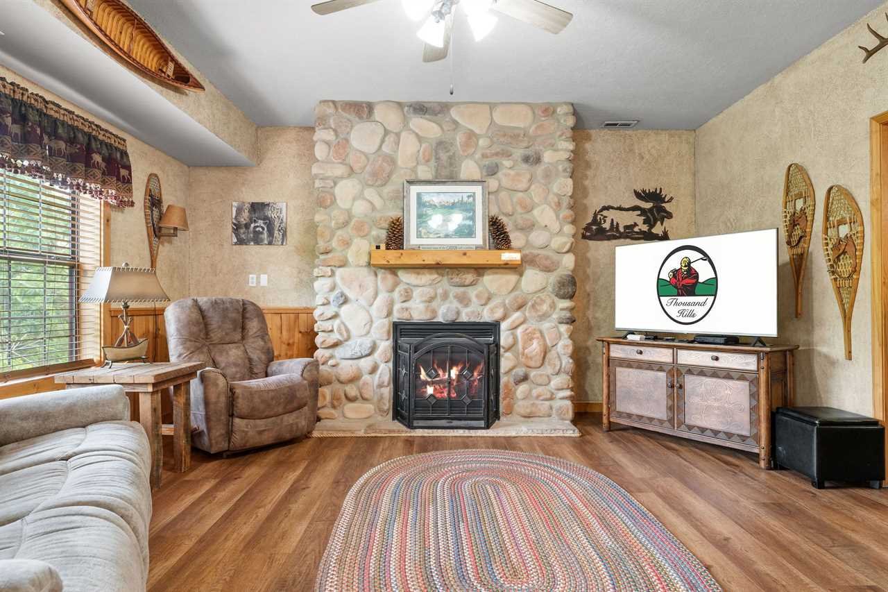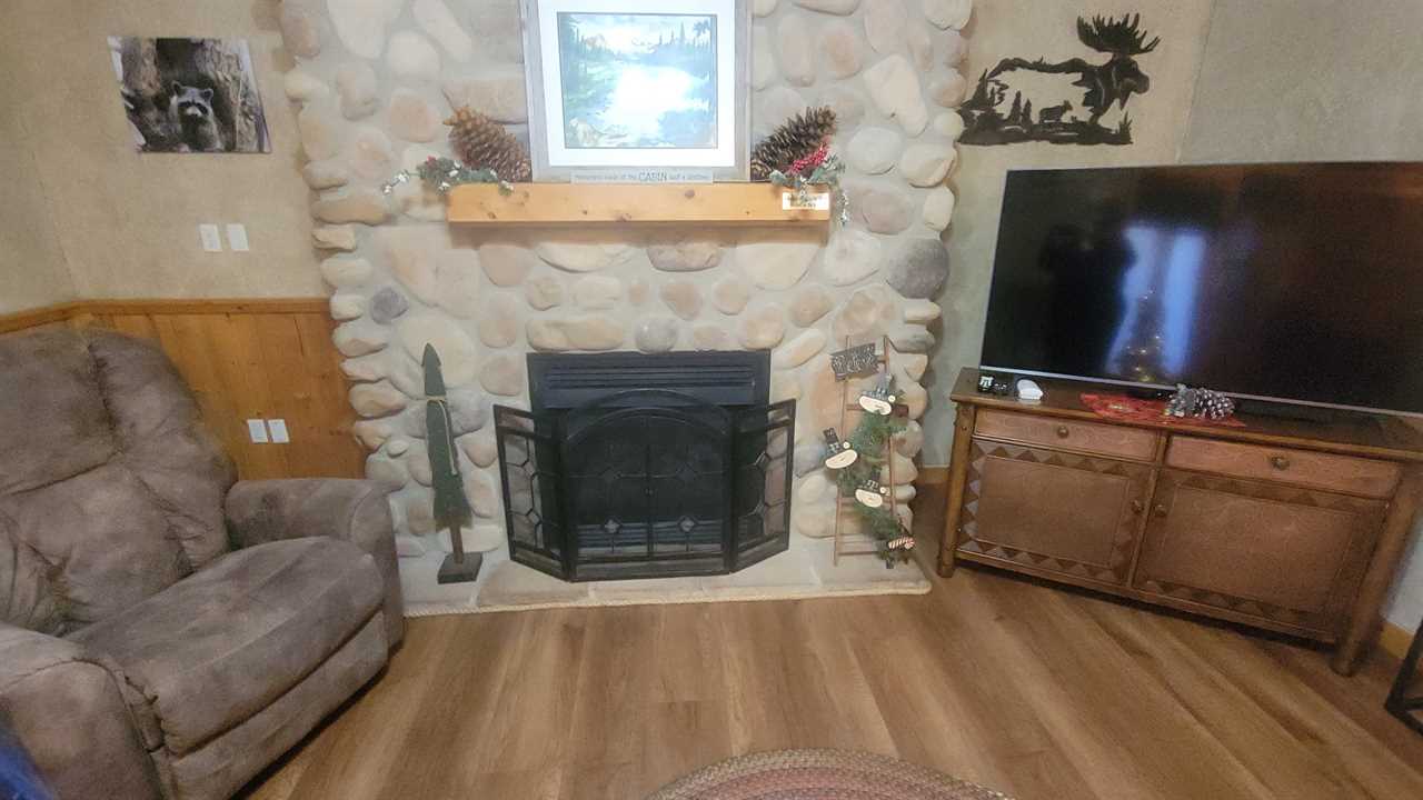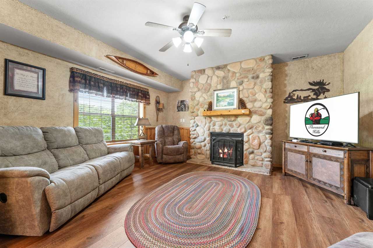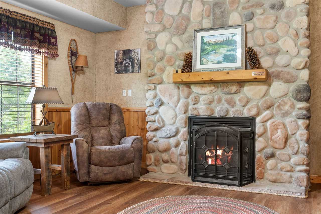 The living area is built for comfort with a standalone recliner plus a reclining sofa with two built-in recliners — four total. Relax by the gas fireplace, enjoy a movie night, or step onto the private, screened-in porch to soak in the wooded serenity.