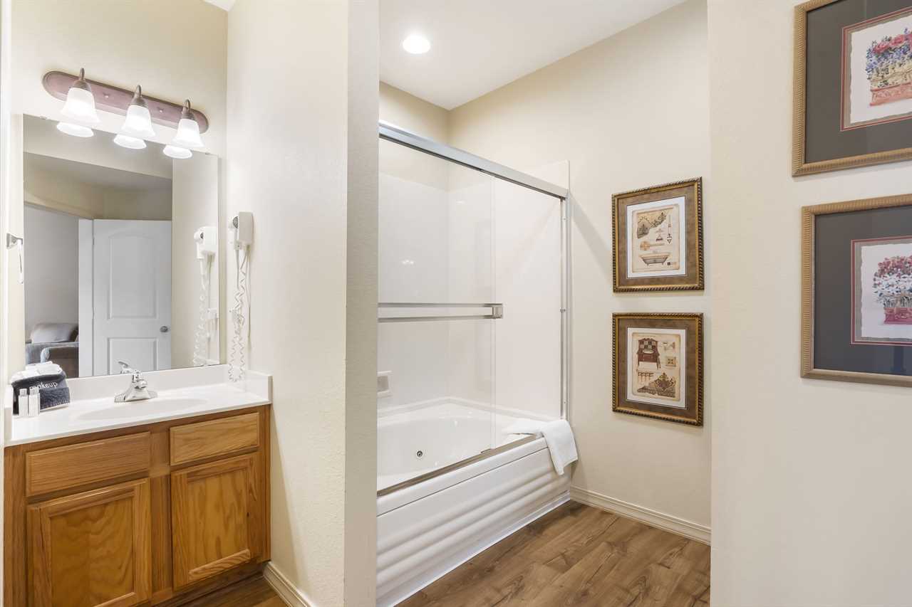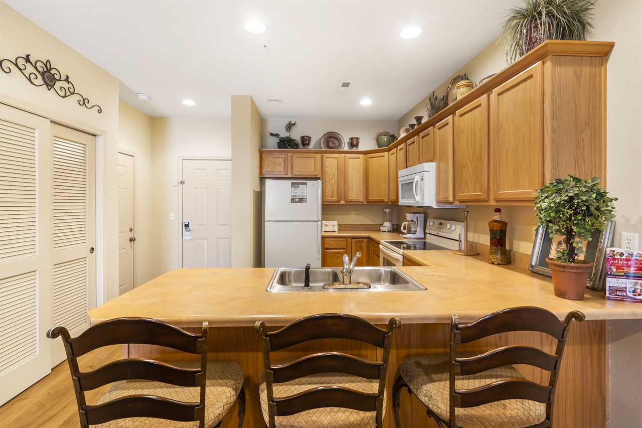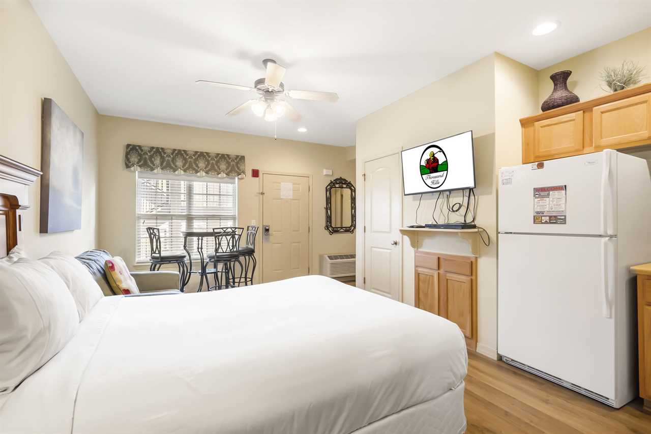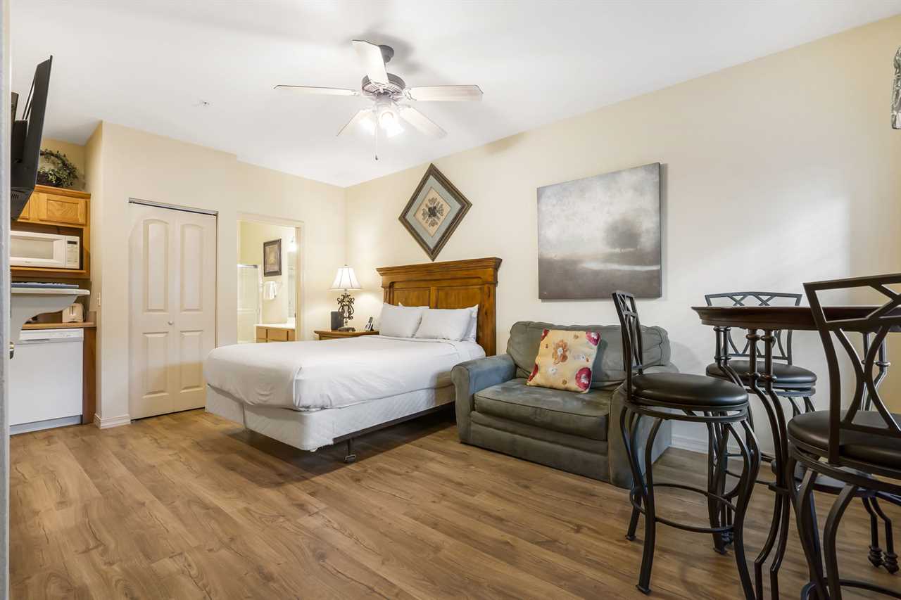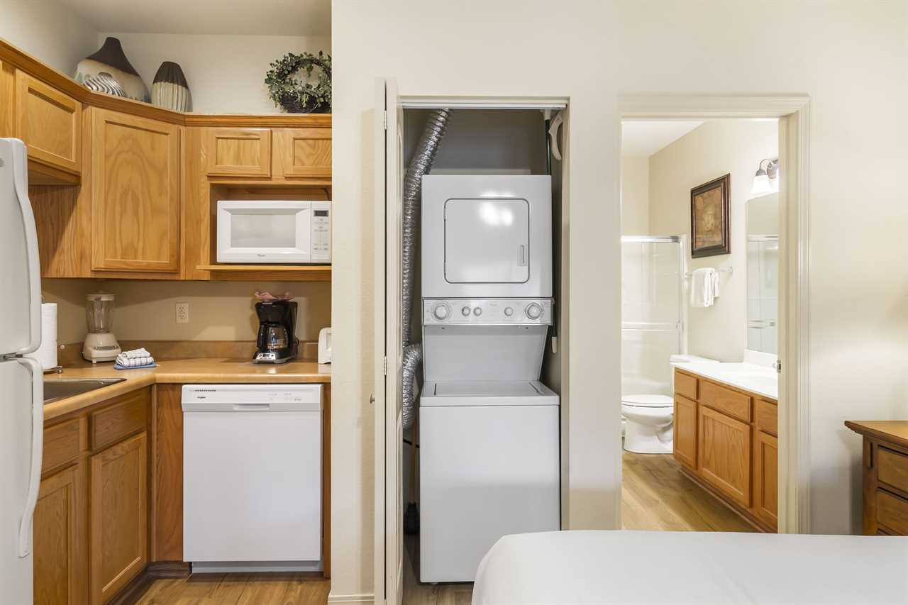 This lodging option includes a walk-in one-bedroom condominium with a king-size bed and an adjoining queen suite near our award-winning golf course. The condo features a full kitchen with major appliances, a dining area, a living room with cable TV/DVD, a queen-size sofa bed, a private covered balcony, and an in-unit washer and dryer. The bedroom offers a king-size bed, balcony access, cable TV, closet and drawer space, and a private bathroom with a whirlpool tub. The suite provides a queen-size bed, cable TV/DVD, a kitchenette with a refrigerator, microwave, dishwasher, and coffee pot, and a sitting/dining area with a small sofa bed. The rooms are adjoined by lock-off access. Free wireless internet and Resort Amenity access are included.