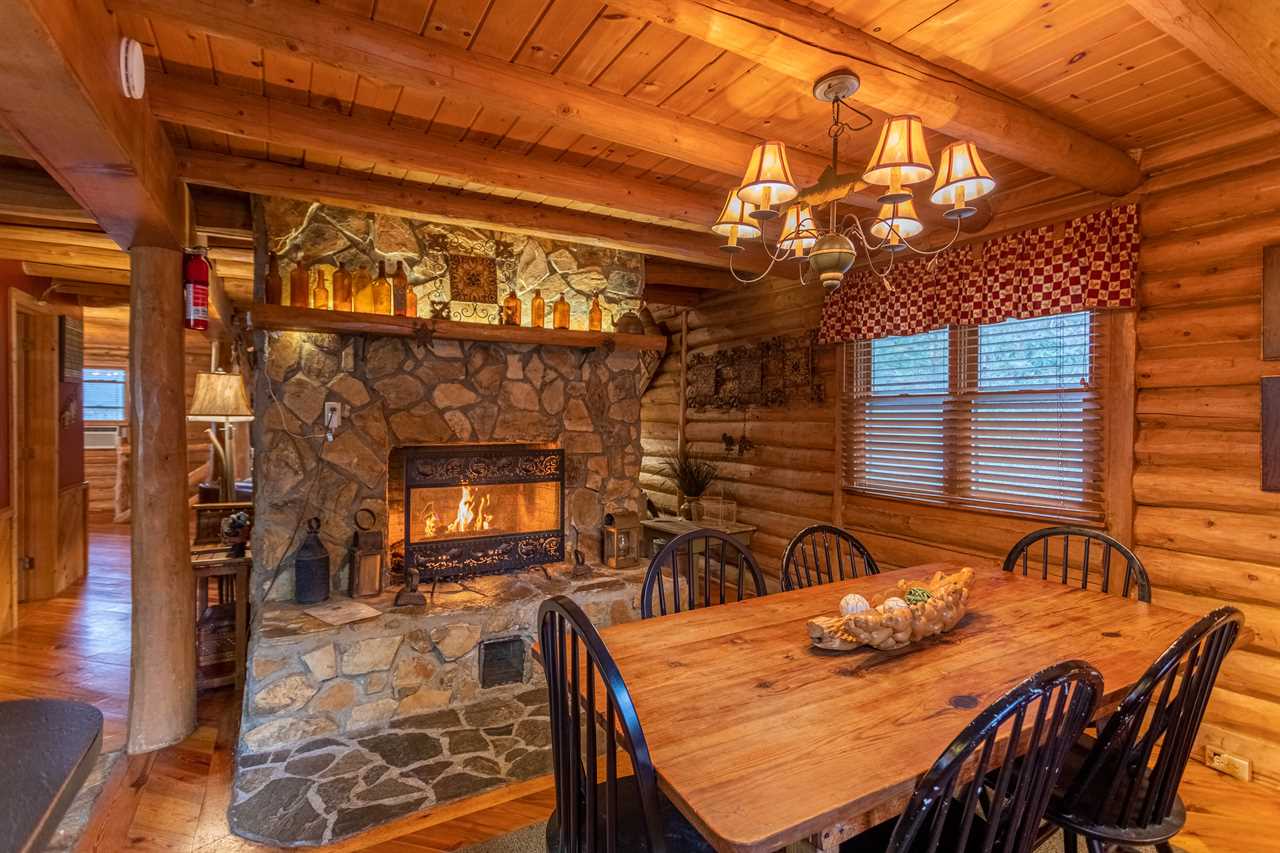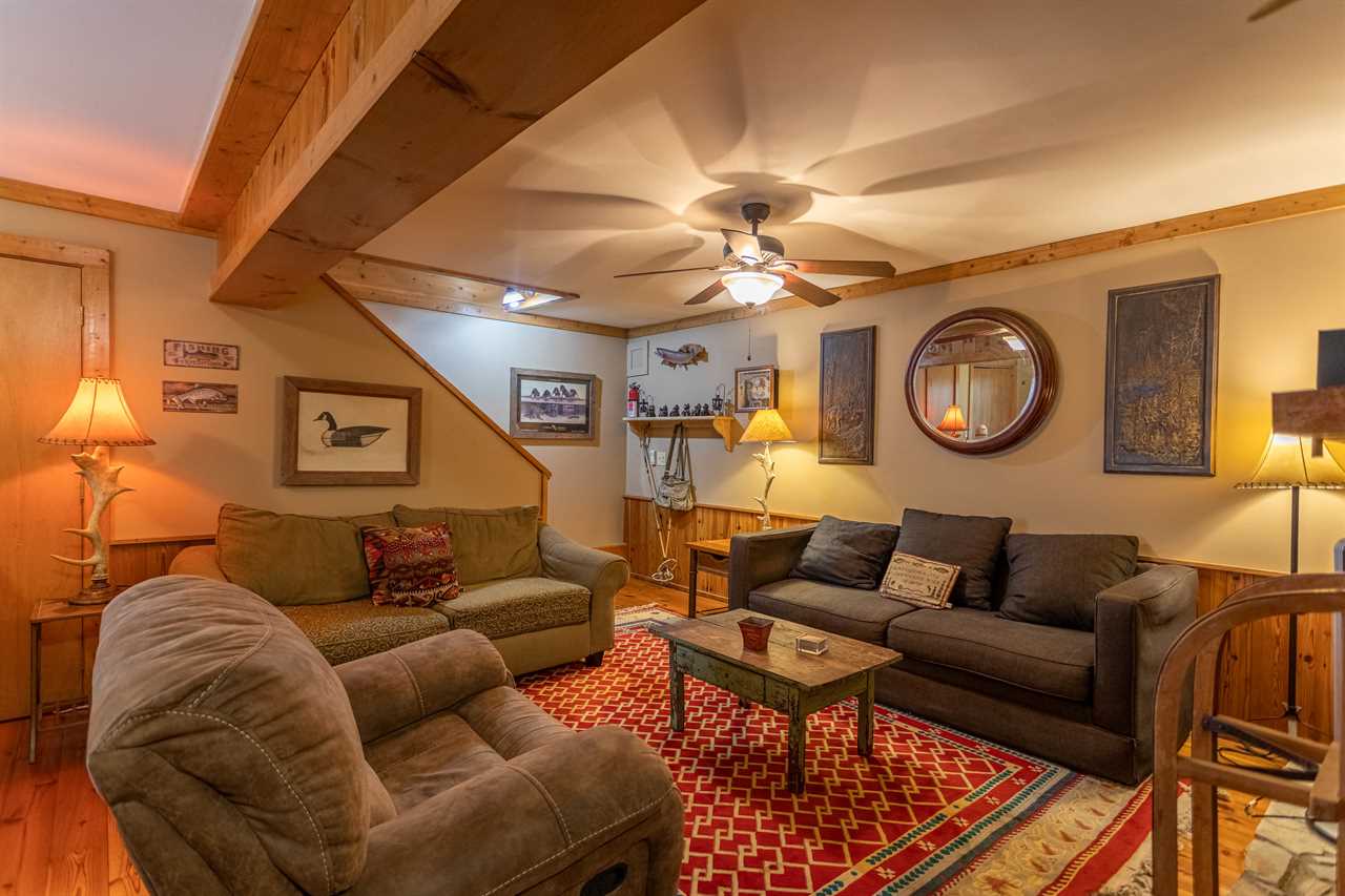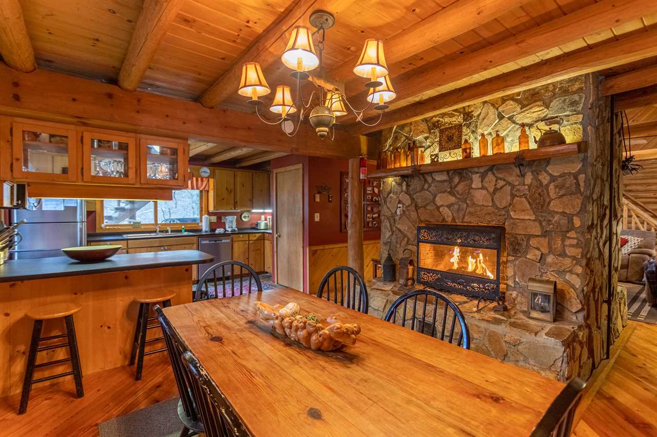 The main level has a great room with vaulted exposed-beam ceilings and suede furniture arranged around a stone wood burning fireplace with a TV & BluRay player mounted overhead. Vintage fly rods decorate the room, and there's a rustic Christmas tree in one corner decorated with a fly fishing theme. A round table for four by sliding glass doors overlooks the river, and there's another table for 6 in the dining room. The dining room has its own wood burning fireplace and is beside the spacious kitchen with stone flooring. There is also a half bath with washer & dryer on this level.