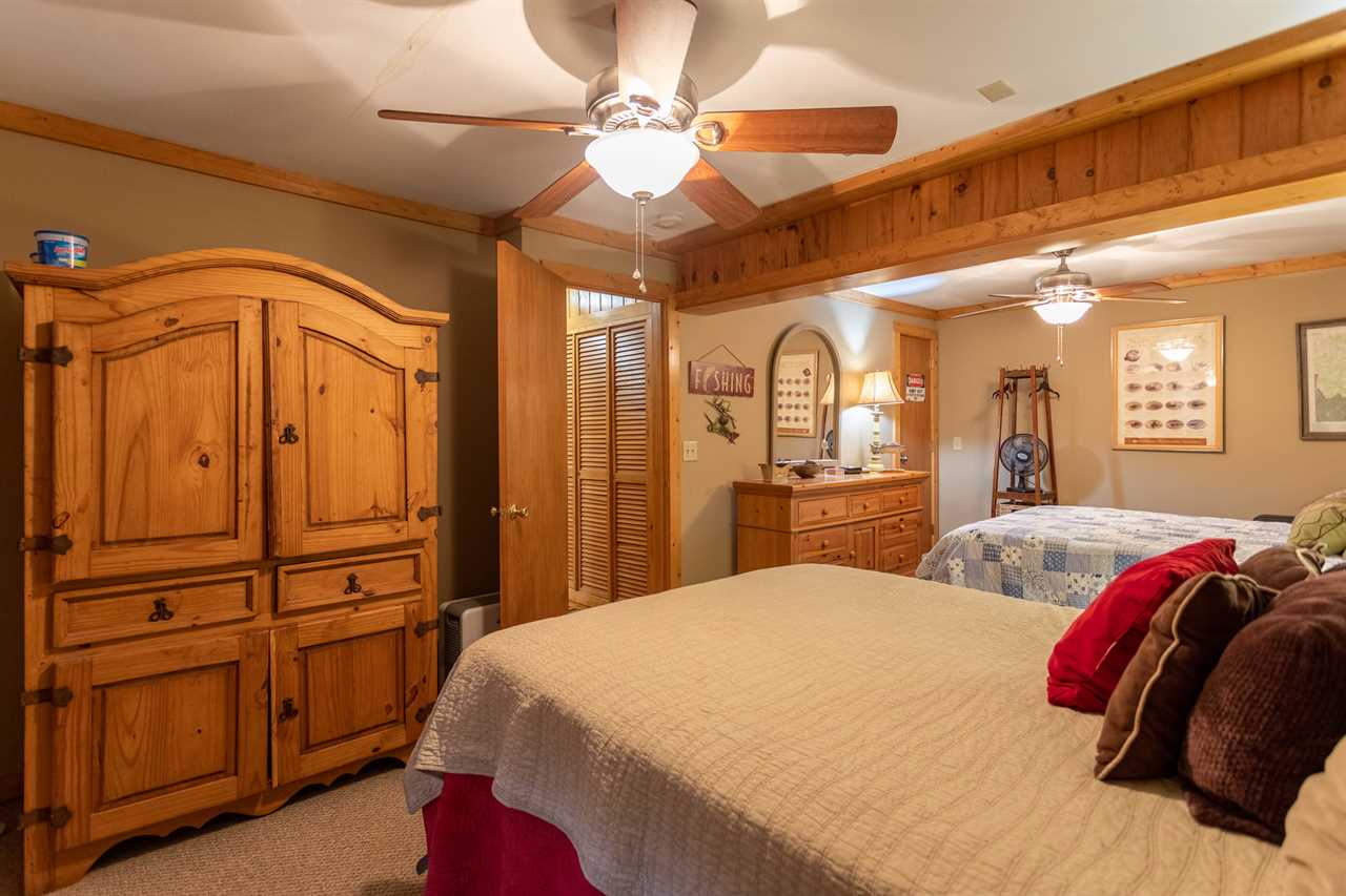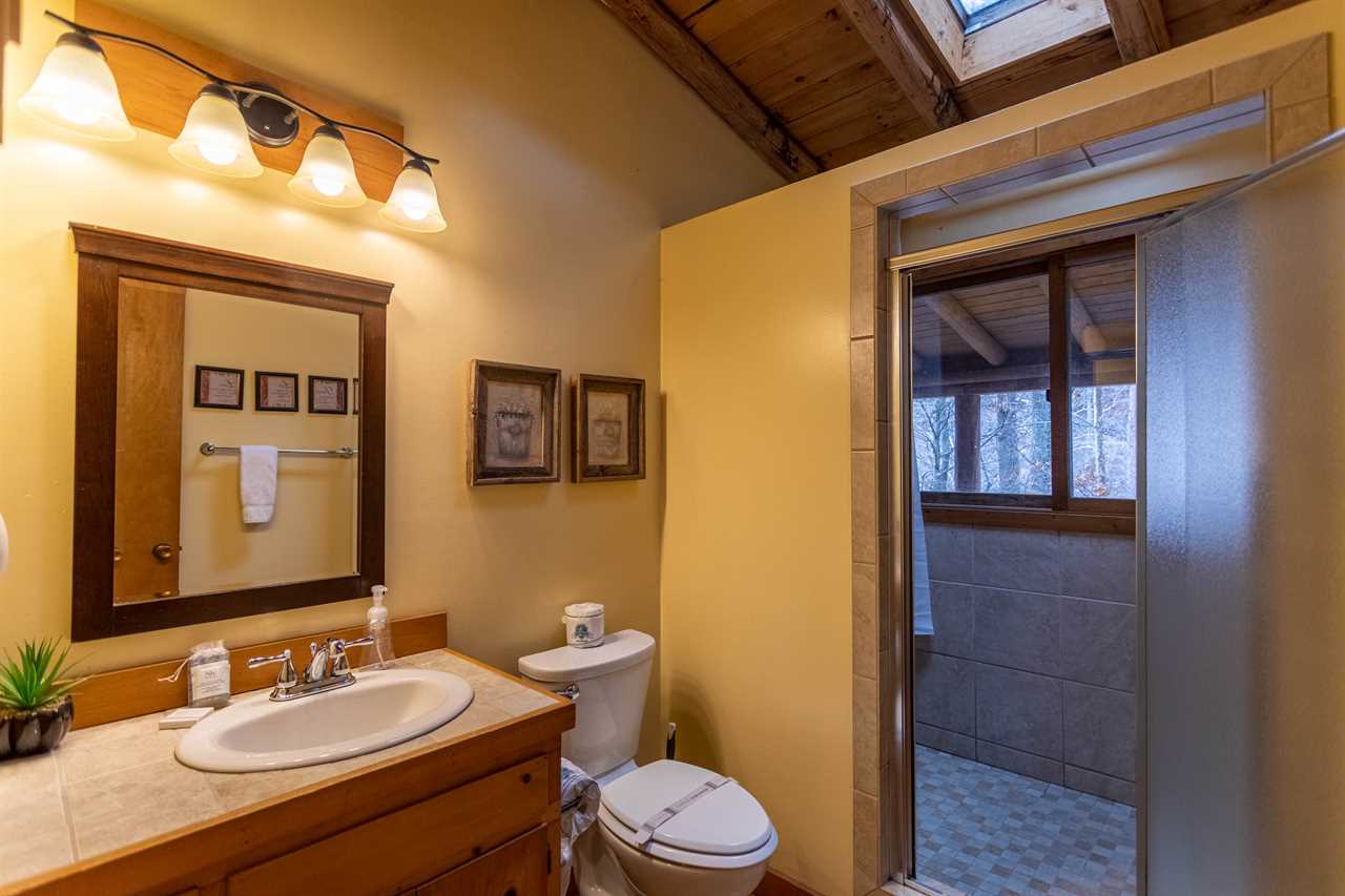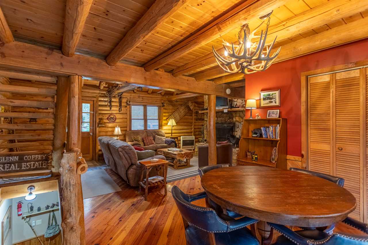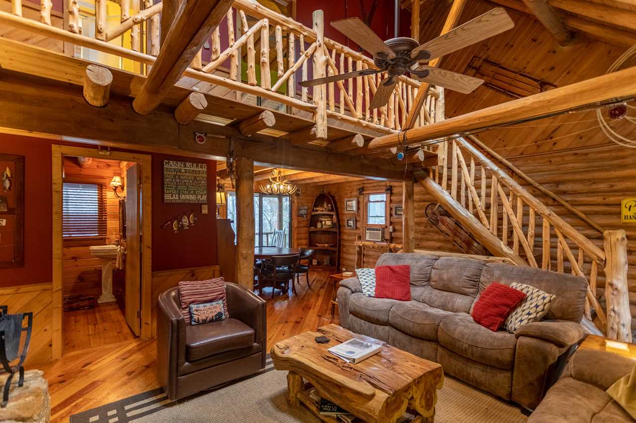 The main level has a great room with vaulted exposed-beam ceilings and suede furniture arranged around a stone wood burning fireplace with a TV & BluRay player mounted overhead. Vintage fly rods decorate the room, and there's a rustic Christmas tree in one corner decorated with a fly fishing theme. A round table for four by sliding glass doors overlooks the river, and there's another table for 6 in the dining room. The dining room has its own wood burning fireplace and is beside the spacious kitchen with stone flooring. There is also a half bath with washer & dryer on this level.