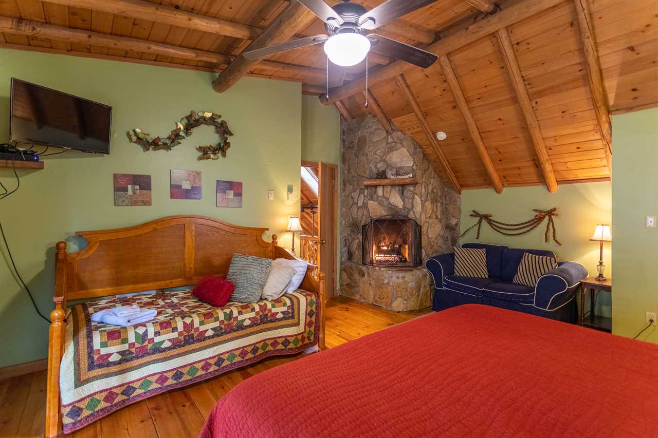 Upstairs there are two bedrooms and a full bath with a tiled shower and skylight. The first bedroom has a Queen bed and sliding doors to the upper deck, and at the end of the hall is the master bedroom. This room has a wood fireplace in the corner, a King bed, a loveseat couch, and a daybed with trundle, along with a TV and a set of sliding doors to the upper deck. There are window a/c units in the bedrooms and living room.