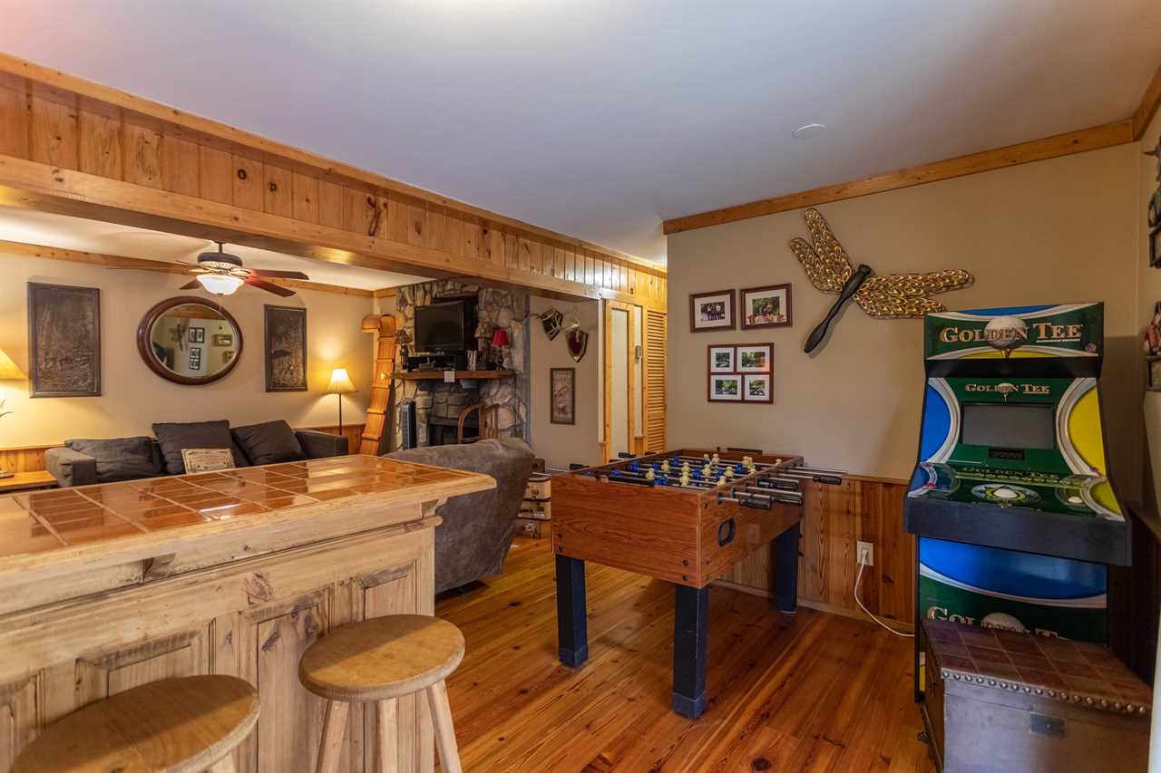 The lower floor of the cabin has a second living area featuring a foosball table, HDTV with DVD player, Golden Tee arcade game, and sleeper sofa. There is a full bathroom with a tub/shower combination, and at the end of the hall is a bedroom with two Queen beds in it.