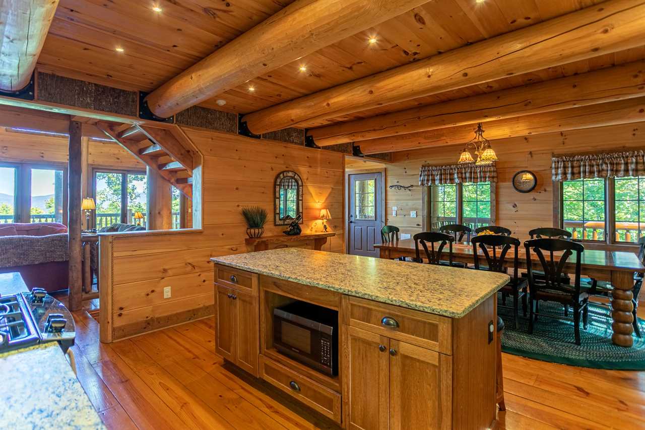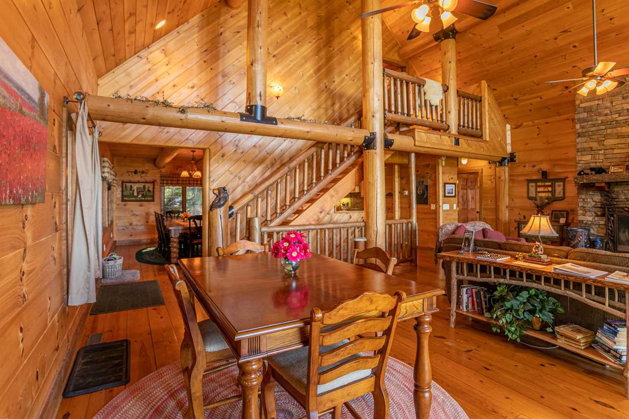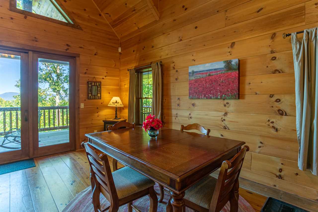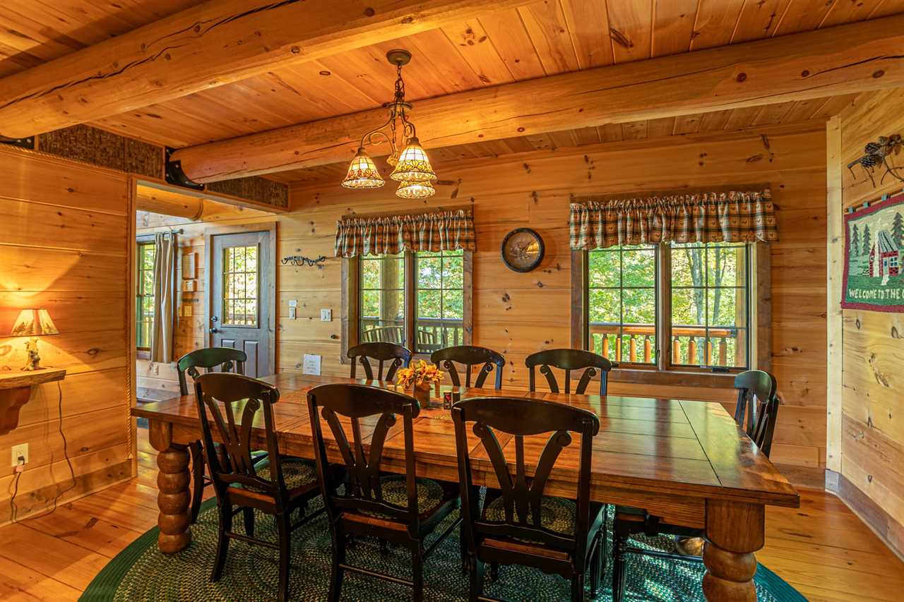 The floors of the cabin are made of rustic wide-plank knotty yellow pine that have been carefully stained and oiled to remind you of days long gone when mountain homes were crafted entirely by hand from available materials. In keeping with this spirit of self-sufficiency the mantel over the fireplace, the sofa table in the great room, the serving shelf in the dining room and the small shelf in the lower hallway all were hand-crafted by a local artisan from a tall, regal cherry tree that was felled to make room for the cabin.