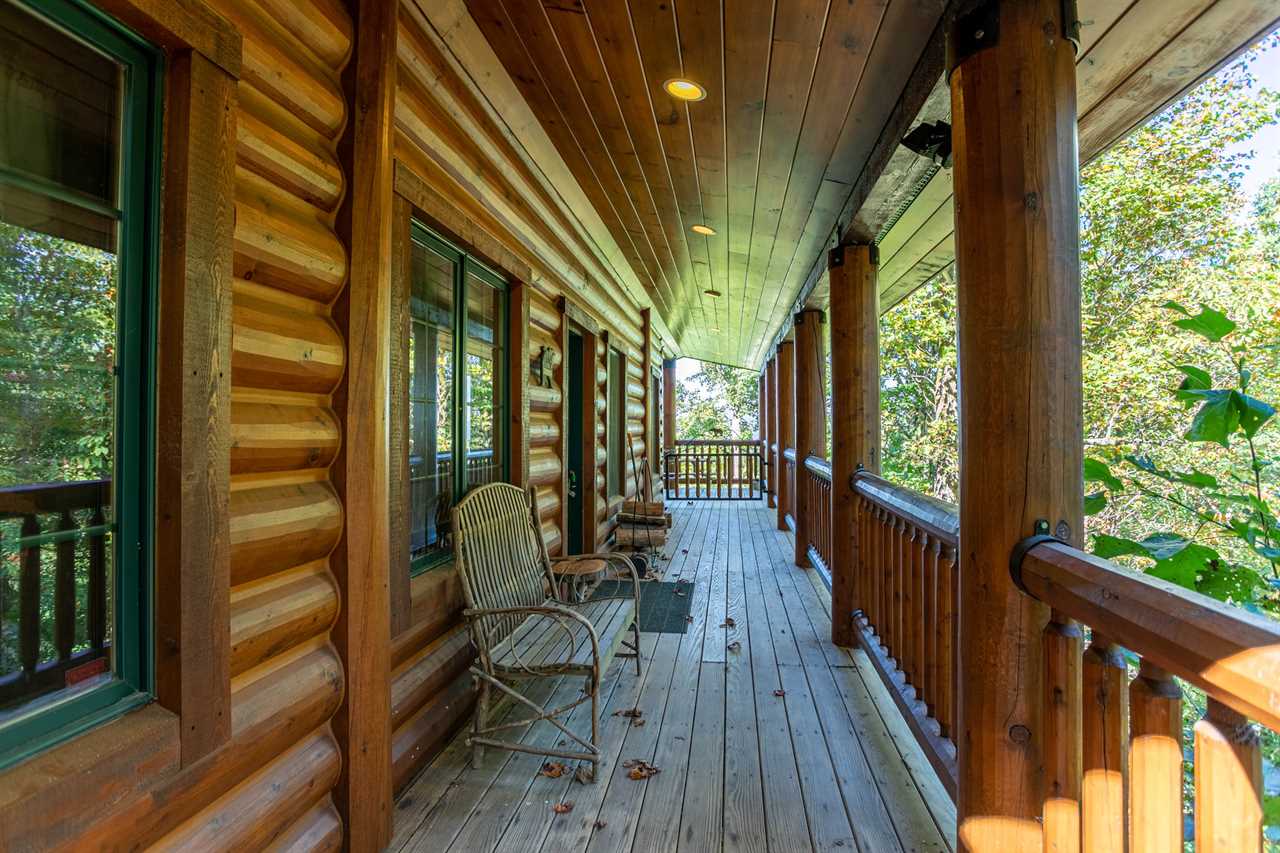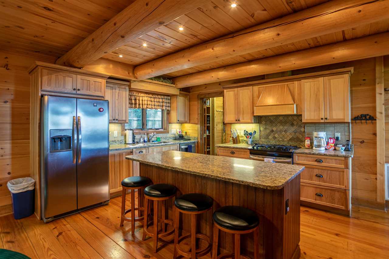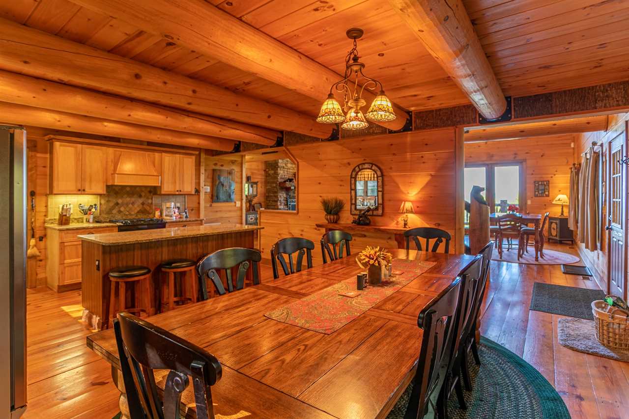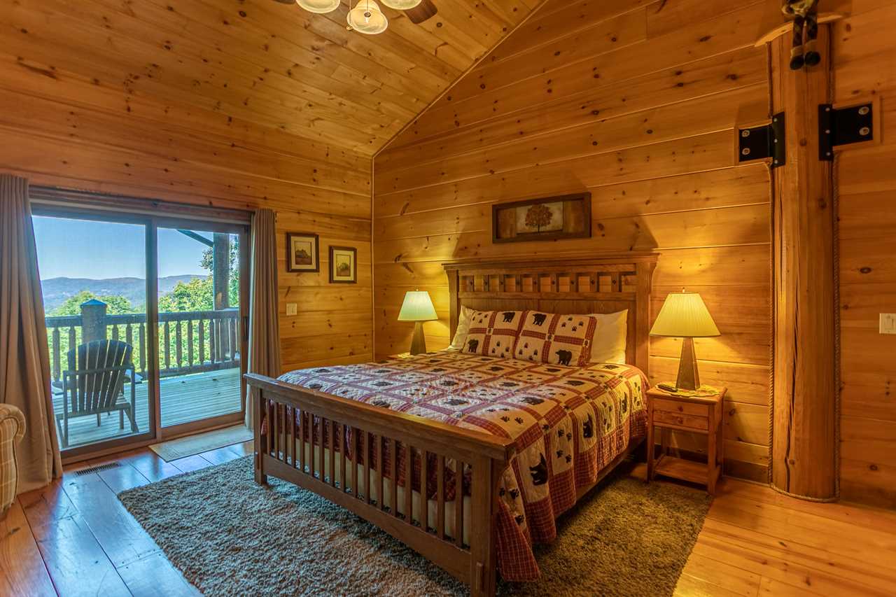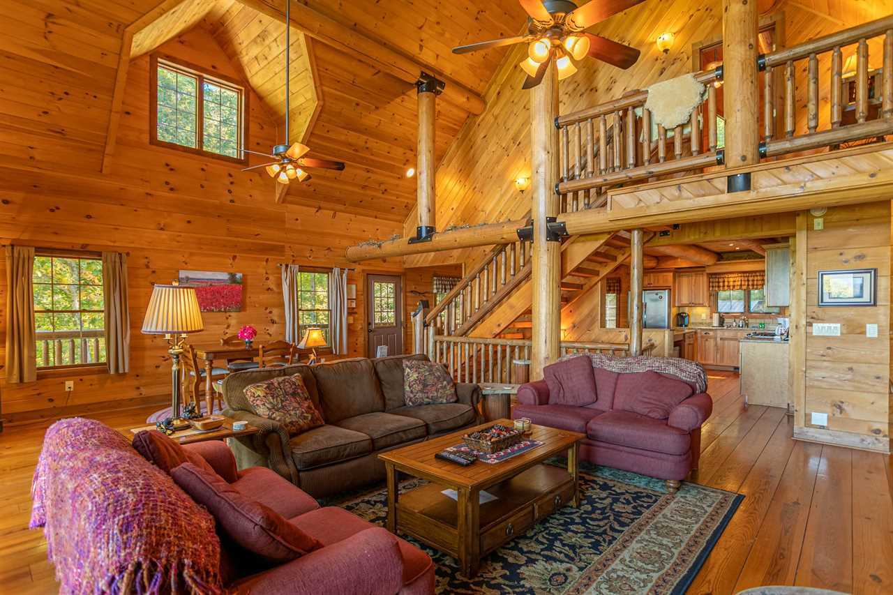 The floors of the cabin are made of rustic wide-plank knotty yellow pine that have been carefully stained and oiled to remind you of days long gone when mountain homes were crafted entirely by hand from available materials. In keeping with this spirit of self-sufficiency the mantel over the fireplace, the sofa table in the great room, the serving shelf in the dining room and the small shelf in the lower hallway all were hand-crafted by a local artisan from a tall, regal cherry tree that was felled to make room for the cabin.