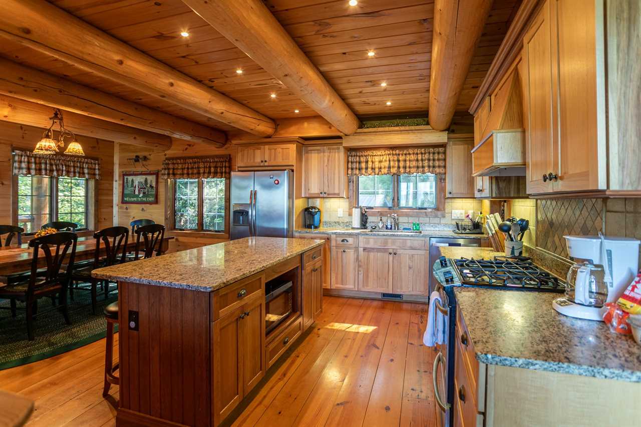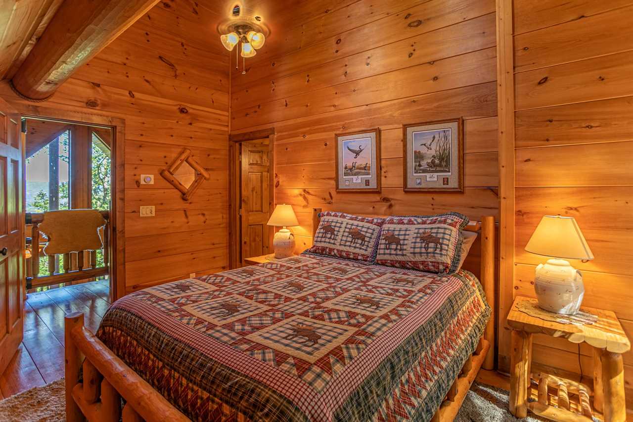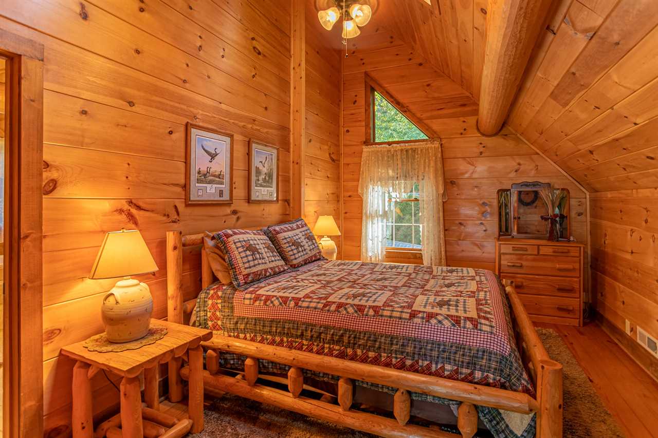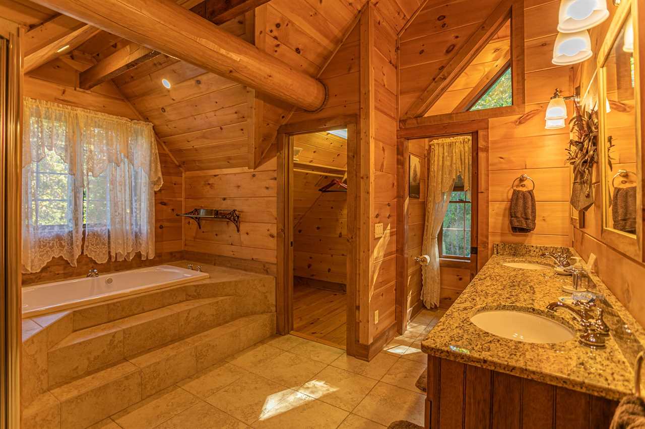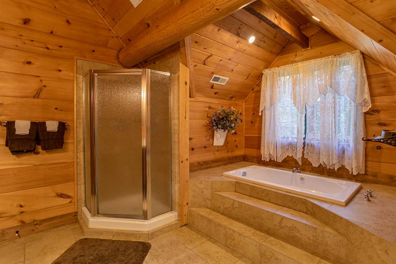 On the second floor is the loft, reserved for another master bedroom suite with a log frame queen bed nestled under twin skylights in the pine-paneled vaulted ceiling, and a very private en suite master bath containing a separate glass-enclosed stall shower and a raised soaking tub to soothe both body and mind.