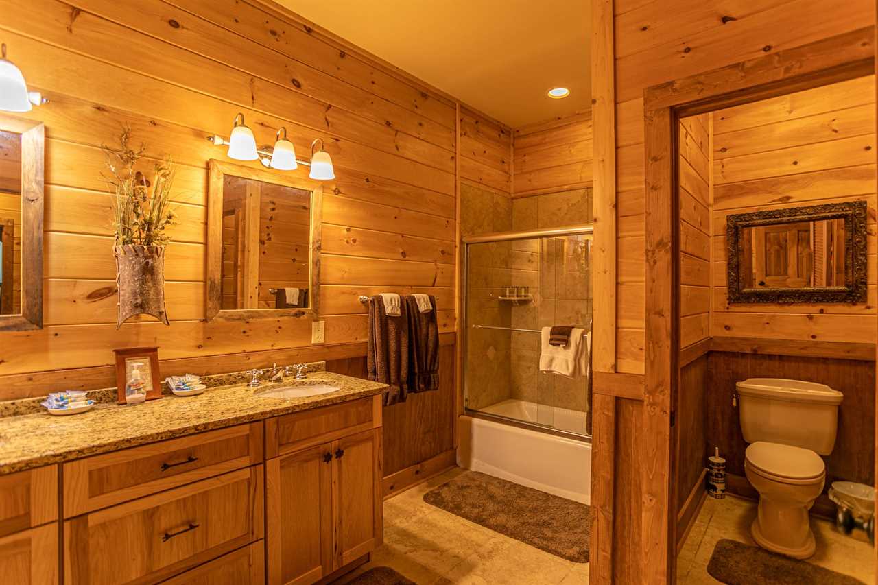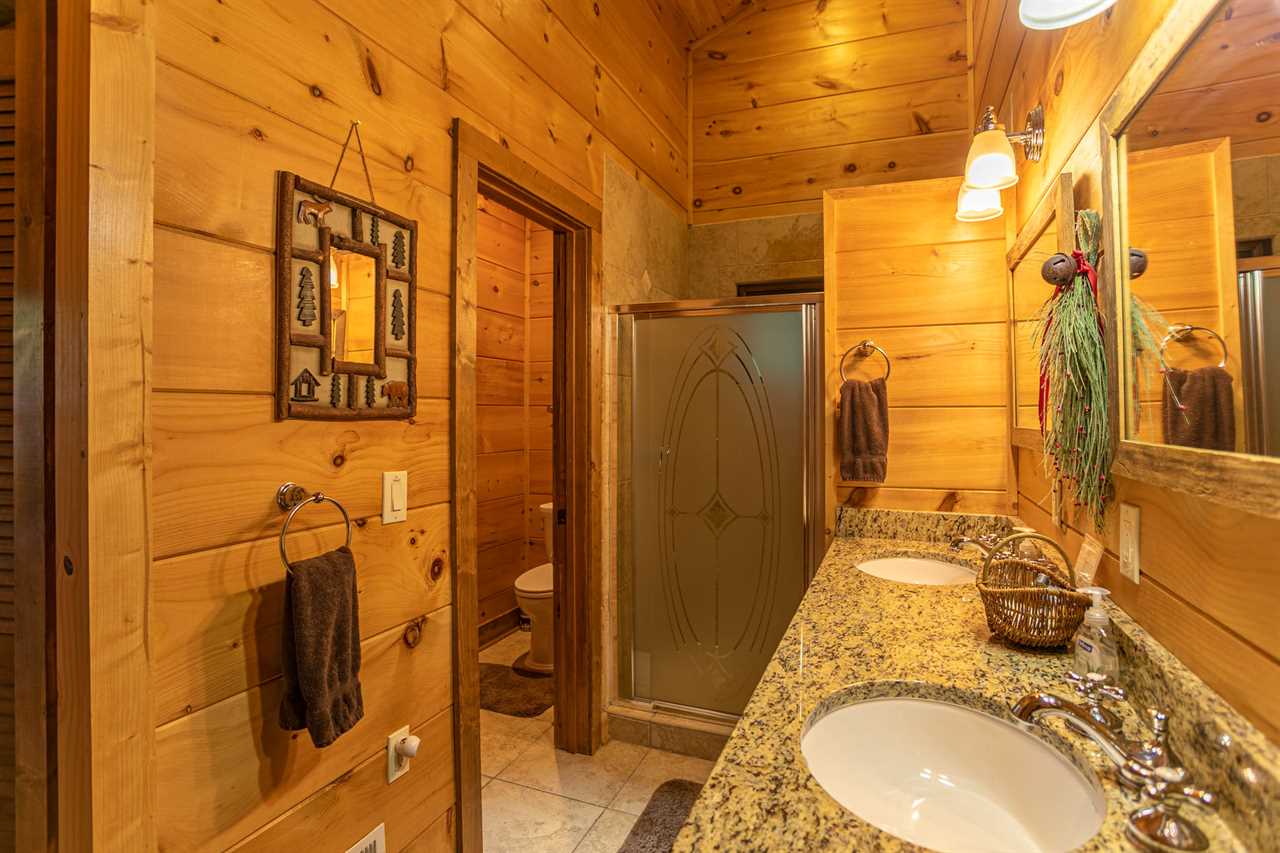 Each of the cabins' bathrooms has a granite vanity top with two sinks and rustic cross-handled faucet sets and antique barn-wood-framed mirror above. Each also has an enclosed toilet room for the ultimate in comfort and privacy.