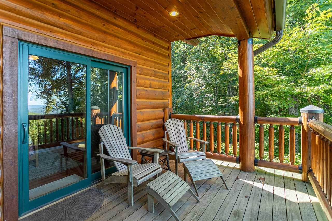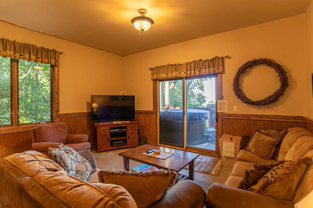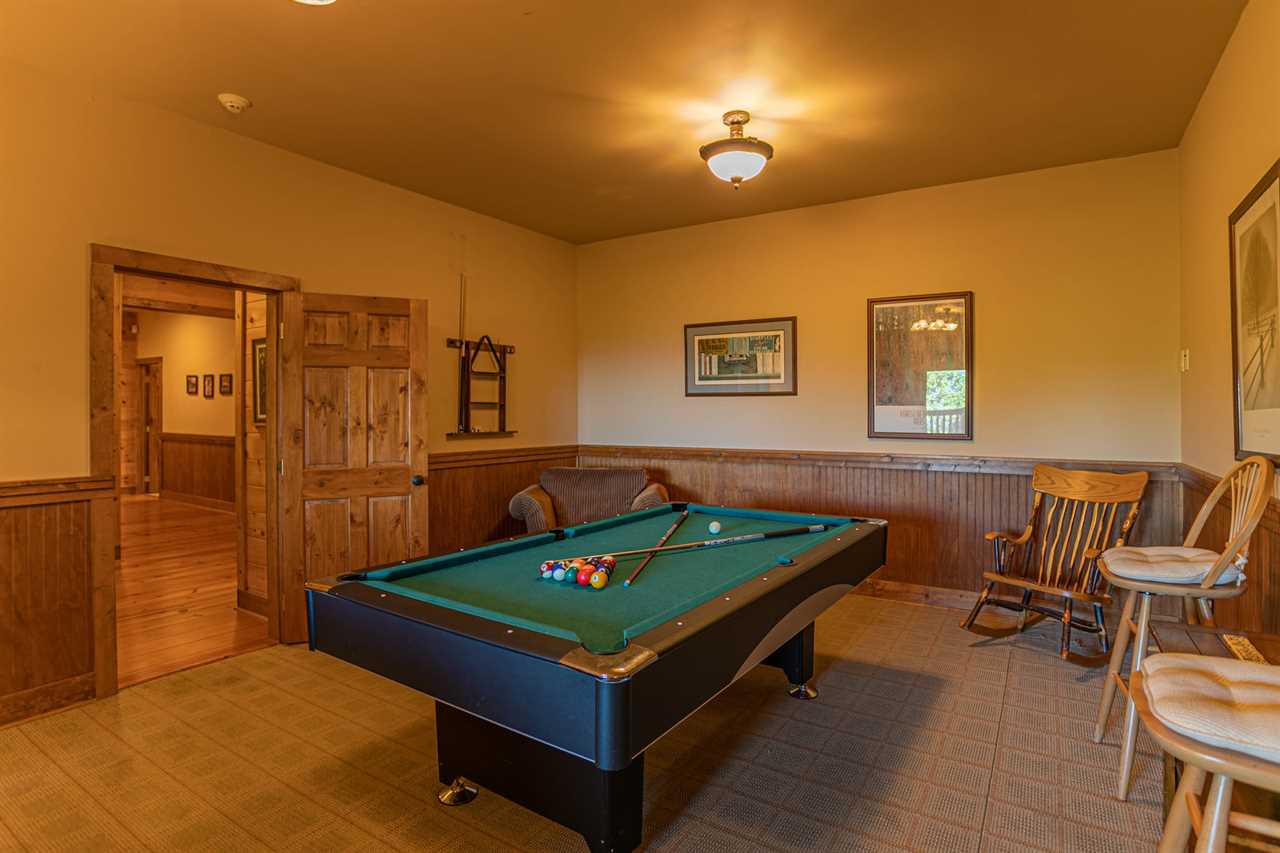 The lower level has voluminous 9 ½ foot ceilings and contains an additional spacious and beautifully-appointed country chic master bedroom with a queen bed and comfortable sitting area. There is a private room for the kids with Foosball table, and many sleeping options: a full, three twins, and a twin trundle. There is a large master-style bathroom with double vanity and glass-enclosed tub/shower and, to relax and entertain the guests, an enormous, deluxe recreation room with a Minnesota Fats pool table, a 52” flat screen HDTV and its own private covered deck with sumptuous hot tub overlooking the distant mountains. Who could ask for more in a North Carolina mountain retreat?