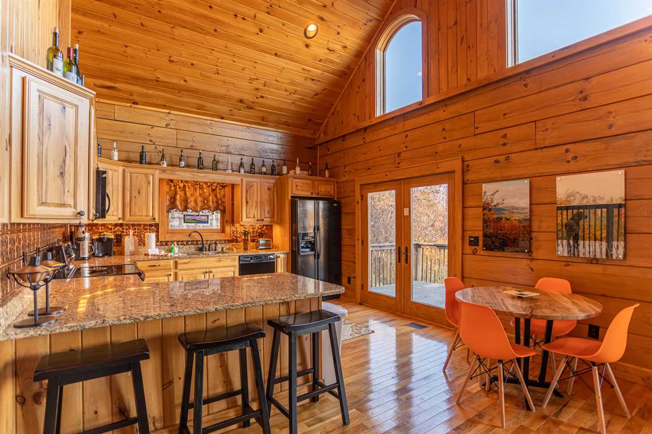 The living room offers a gas fireplace, beautiful vaulted ceilings, a cozy couch, an over-sized chair, a flat screen TV and deck access. Just behind the living room is the fully-equipped kitchen with all the tools necessary to prepare a great meal. This open concept makes this area the perfect place for all of your friends and family to gather! There is a dining table that seats 4 and 2 stools at the bar.