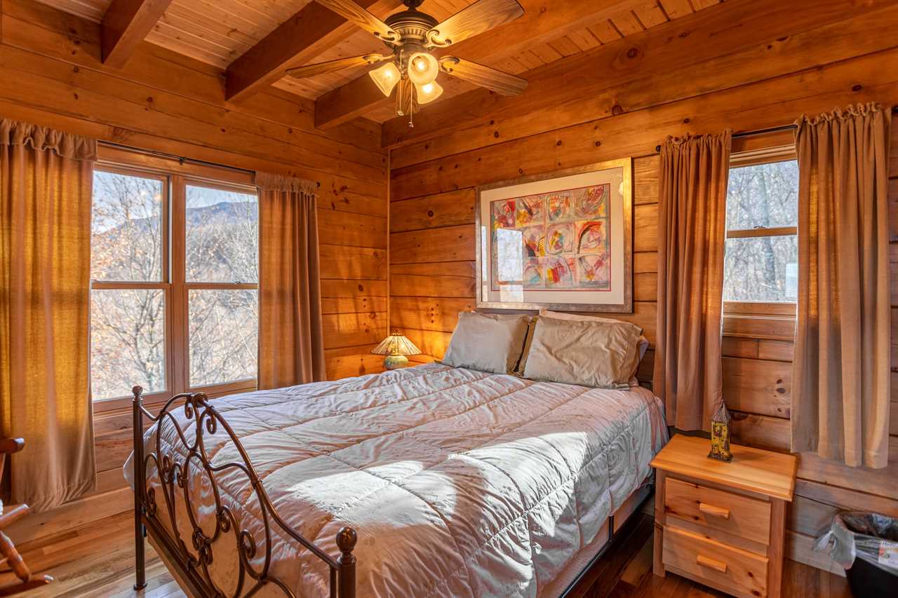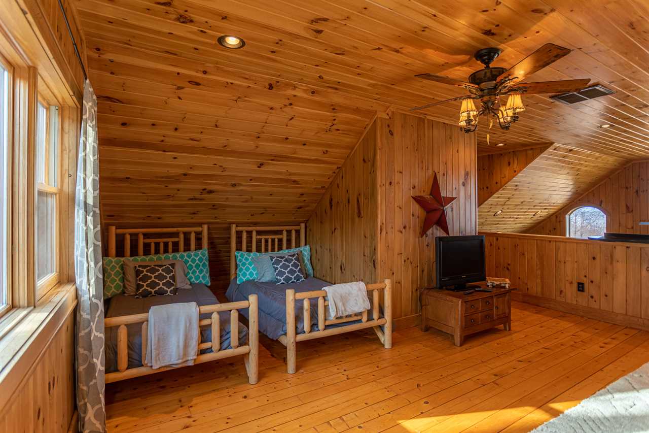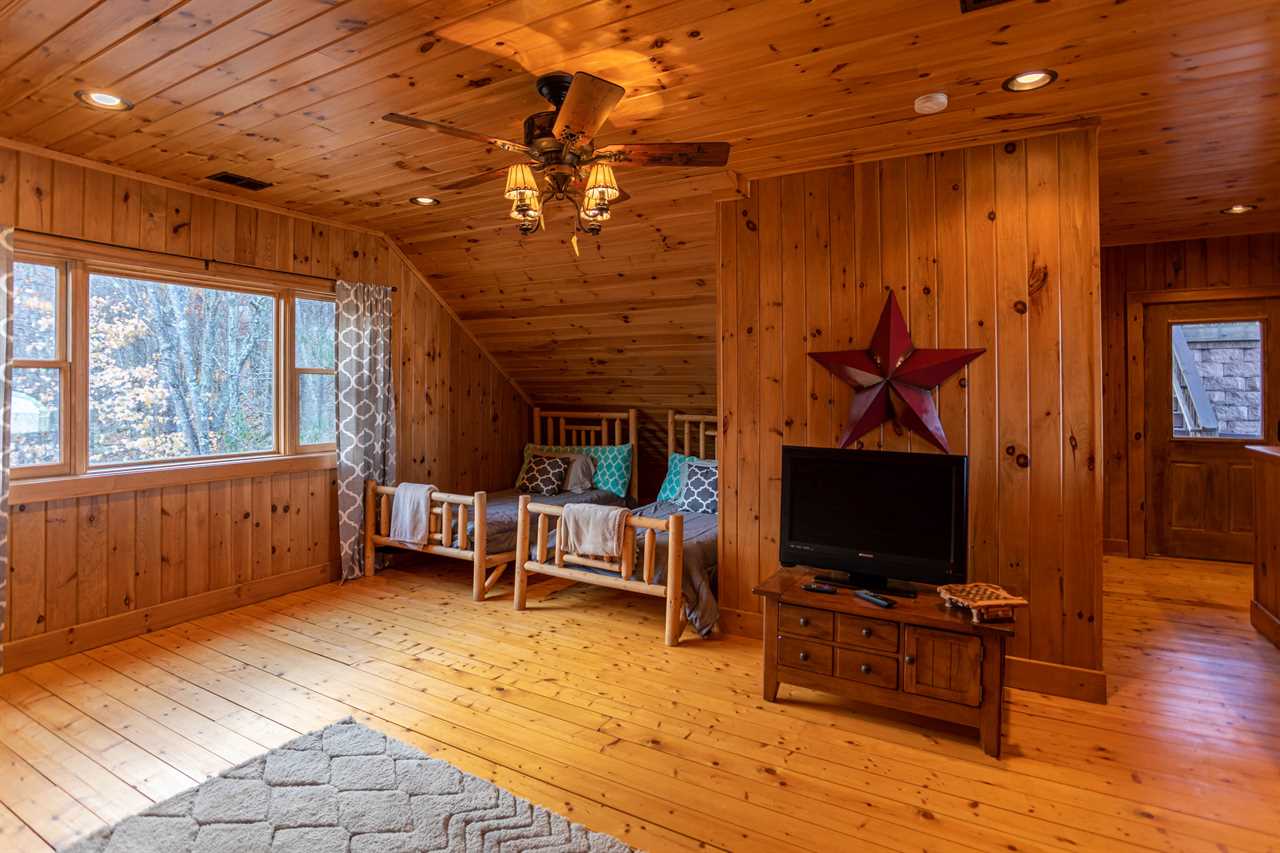 Both bedrooms are on the main level of the home, which is about 15 steps down from the front door entrance. One bedroom has a king bed and a full bathroom with a tile shower. The other bedroom has a queen bed. The second bathroom is just outside of this bedroom, in the hall. Upstairs, you will find two more twin beds in the loft along with another full bathroom. The outside grounds are likely to be your favorite feature of Faraway Skies. Just a short walk from the deck you will find a hot tub as well as a fire pit. Another perfect area for the family to spread out and enjoy the cool mountain evenings.