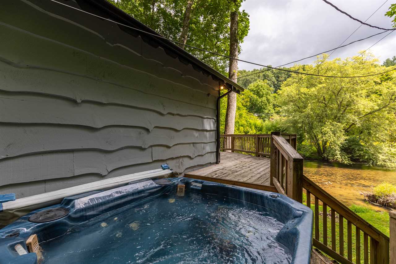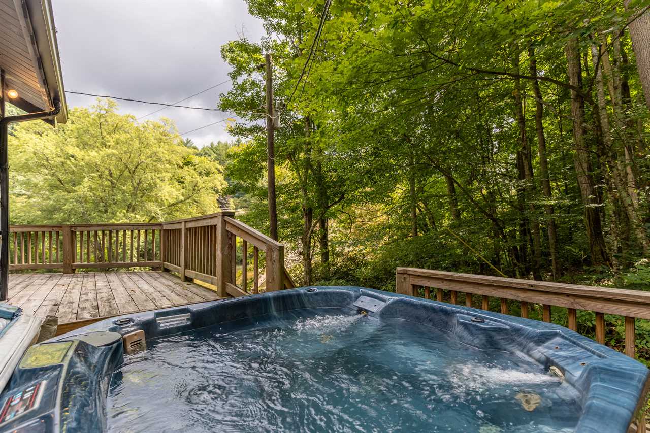 The cabin itself has a wraparound porch with charcoal grill, chairs and a picnic table on the front for eating outside. The hot tub is located around the far side of the cabin for extra privacy.