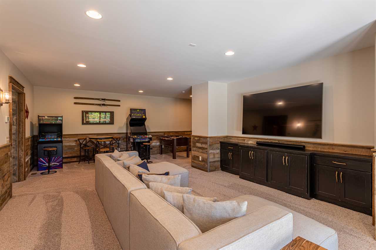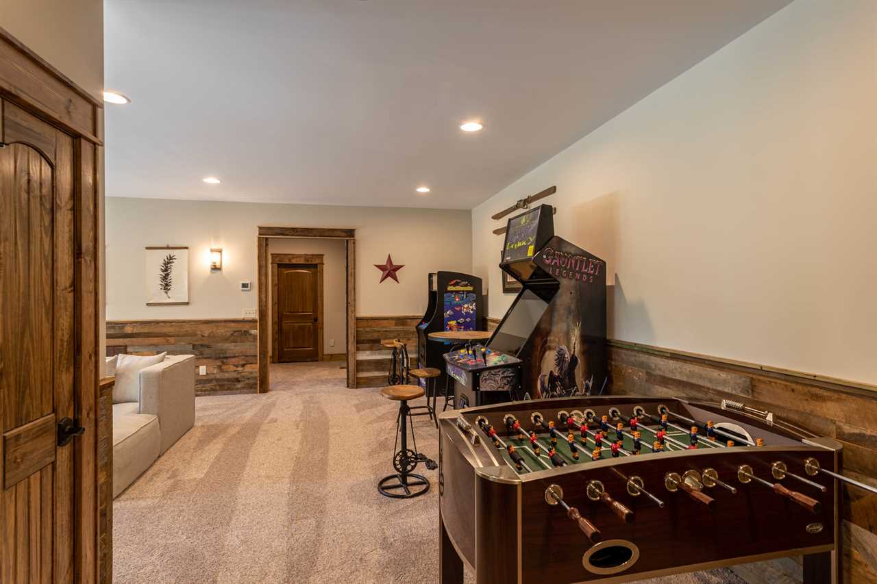 Full size lower level with 85” TV, 2 stand-up arcade games, 3 TV video game consoles (X-box One S, X-box 360, Sony PlayStation 2), You Tube TV login, and foosball