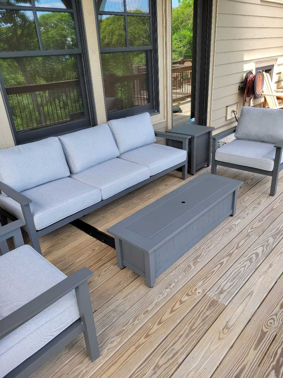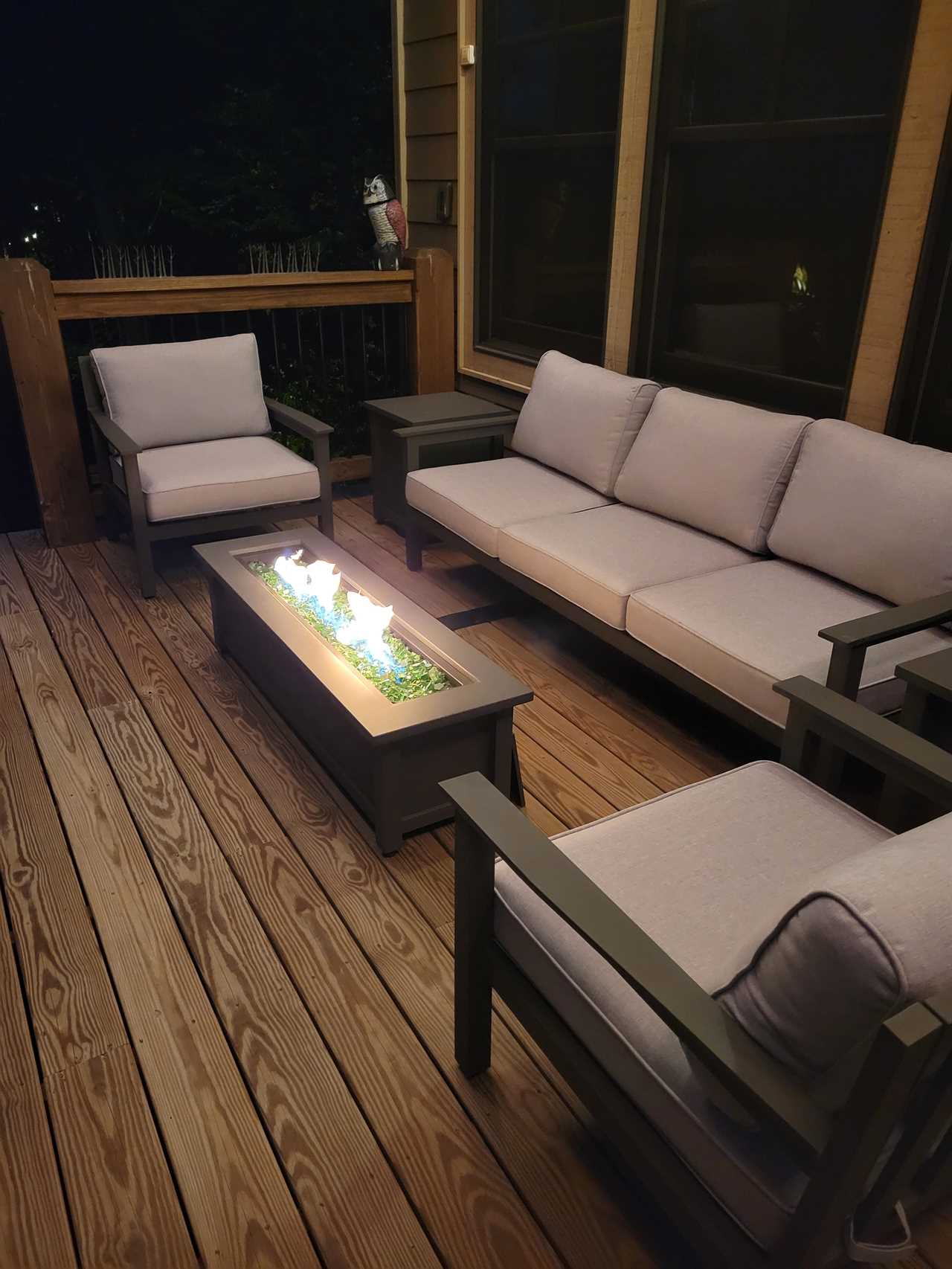 Gas fire table and comfortable seating on the deck outside of the master bedroom