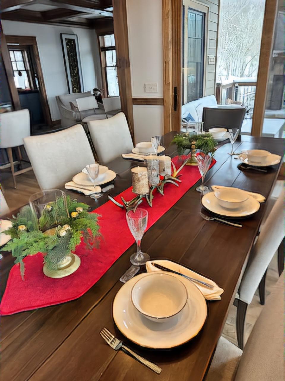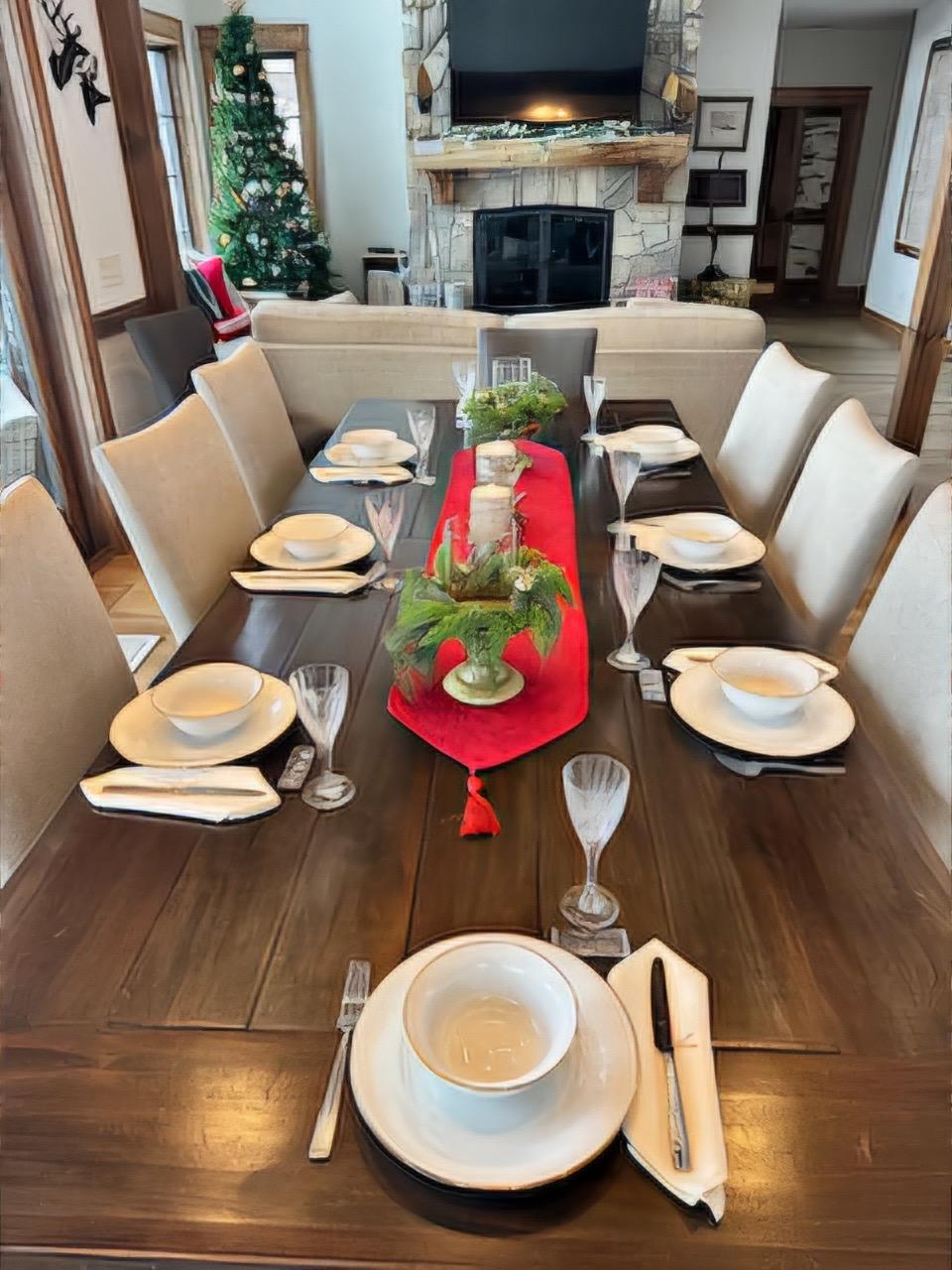 Indoor dining table with seating for 12 (extra fold-up table and chairs available for overflow)