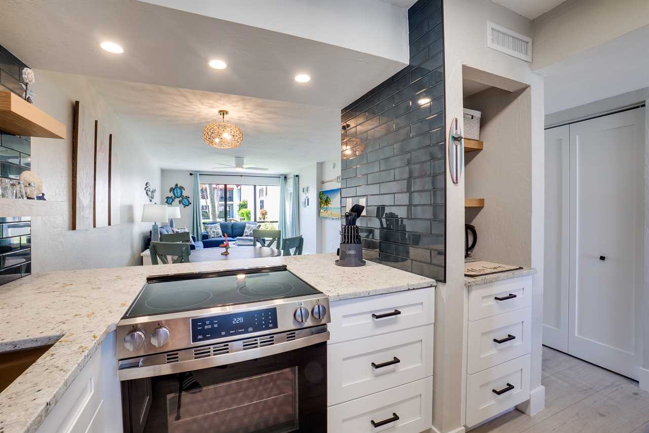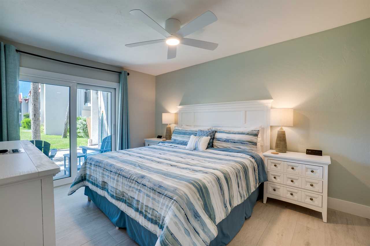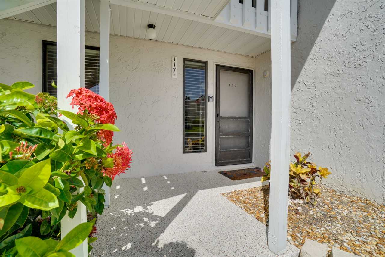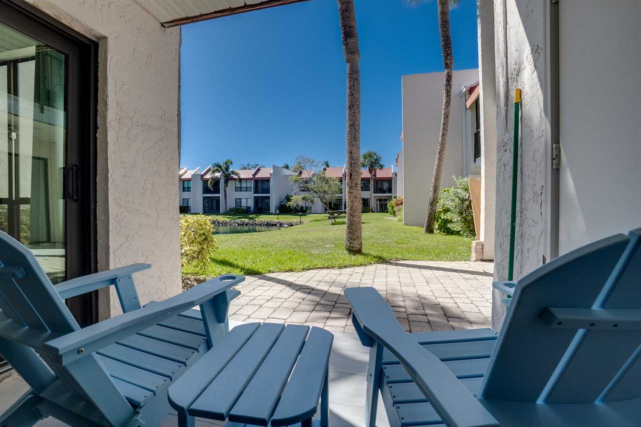Surrounded by vibrant tropical blooms and an emerald-green manicured lawn, Runaway Bay 117 features an open main living and dining area. The front door opens to reveal a recently updated kitchen, with crisp white cabinetry and a sparkling teal tiled backsplash. Stainless steel appliances include a dishwasher, smooth-top electric range, refrigerator, and microwave, while gorgeous slabs of granite create ample workspaces. A pass-through window looks out onto the formal dining area and living space. A plush and spacious sofa faces the large HDTV and creates an ideal spot to kick back with a cold drink and your favorite TV show. Large windows let in tons of natural Florida sunshine and a glass door leads outside to the private patio area where two comfy lounge chairs are the perfect place to sip your morning cup of coffee.