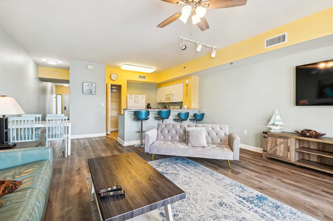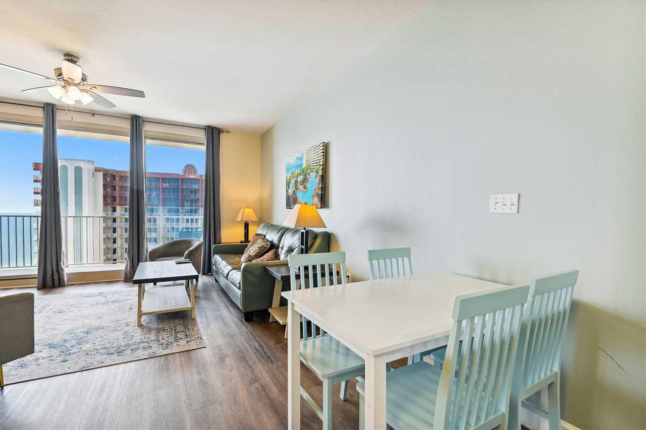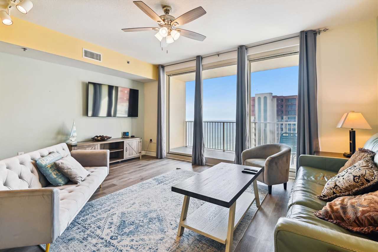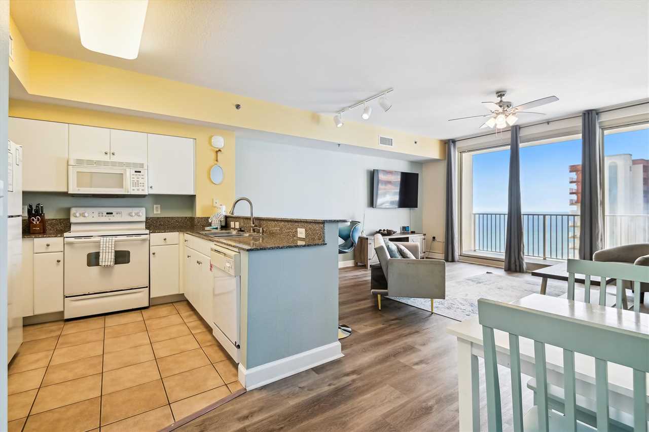 Shores of Panama 2026 is a 1 bedroom + bunk area, 2 bath condo located on the 20th floor of the Shores of Panama, in Panama City Beach. This condo has a sunset view of the Gulf of Mexico from the living area. Back in the condo, you'll find plenty of seating for everyone in your group. There is a queen-size sleeper sofa that sleeps 2. Take a break here and plan your day, or relax and laugh at the memories created at the end of the day. We have included HDTV via DirecTV in the event you become tired at the beach. The dining area has bar seating for 3 as well as a table with seating for 4. In the kitchen you'll find everything you need to prepare a fabulous meal with our local fresh ingredients, we recommend the seafood. Just past the kitchen, you'll find the laundry closet with a large washer/dryer for your convenience.