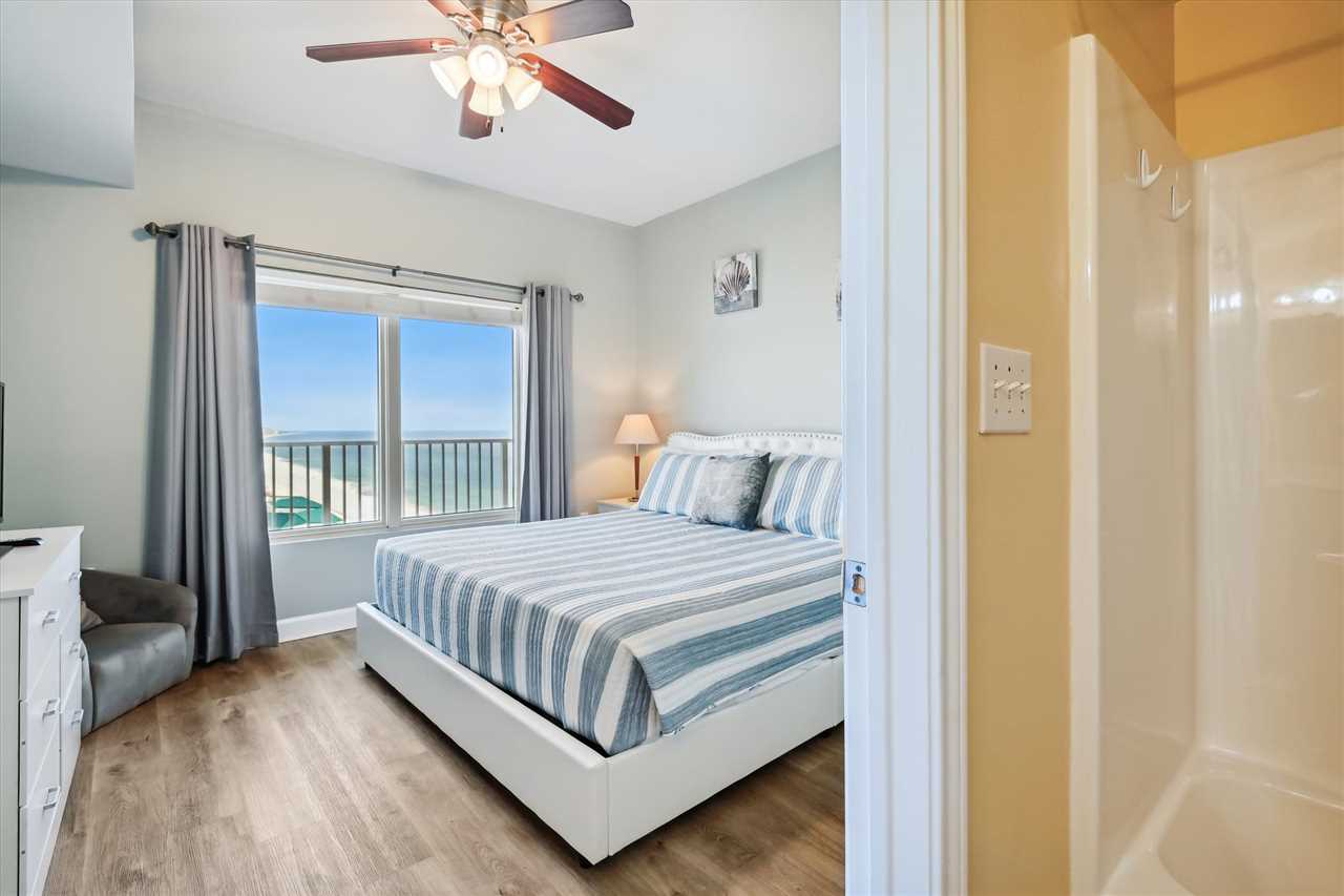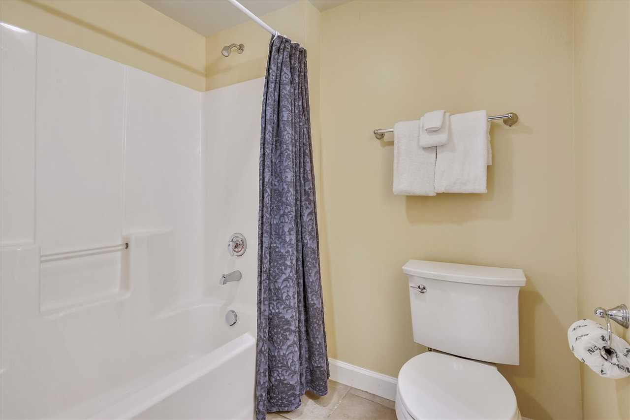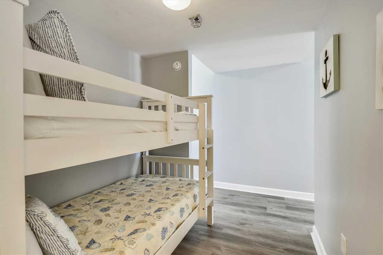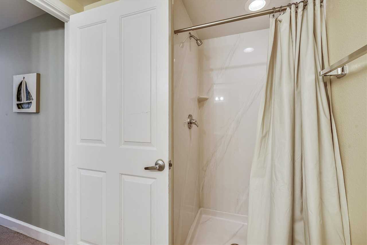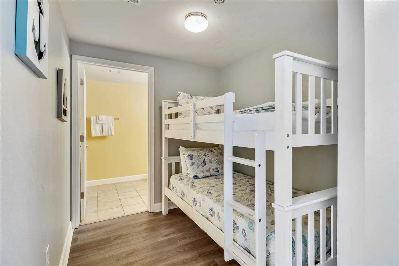 Next is the bunk bedroom which has a twin/twin bunk bed with a private bathroom featuring a stand-up shower. The master bedroom has a plush king-size bed with a closet and dresser. If you need to unwind, there is a TV for your enjoyment at the end of a long day on the beach. The master bathroom has a tub/shower combo.