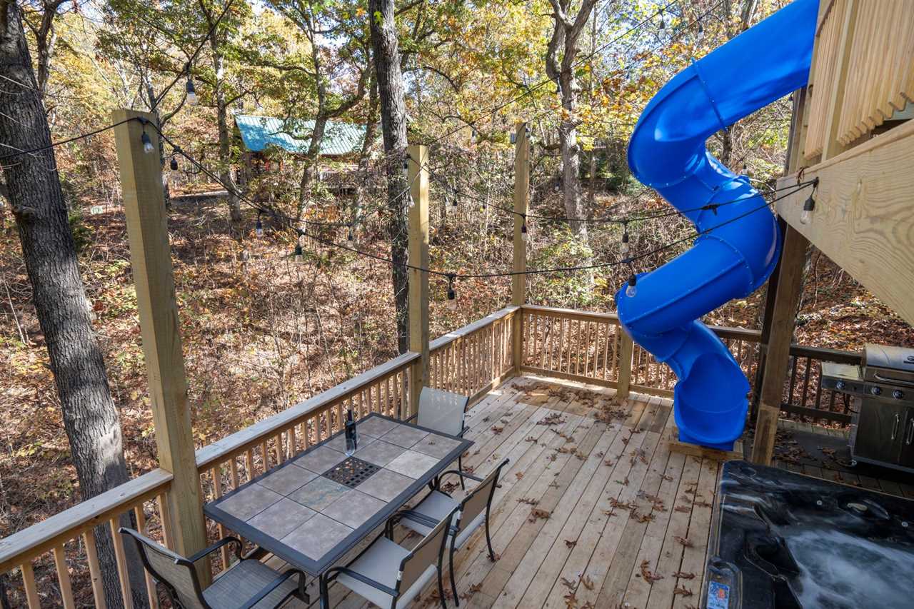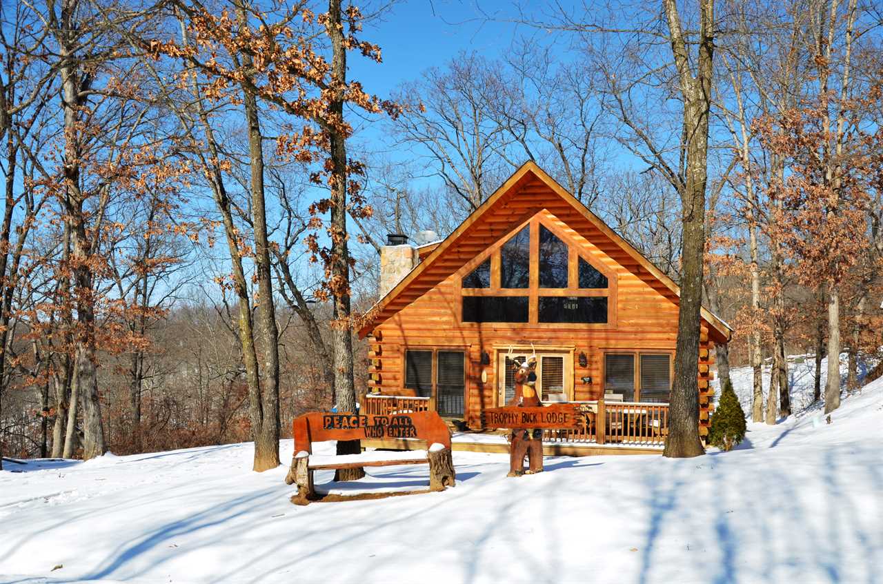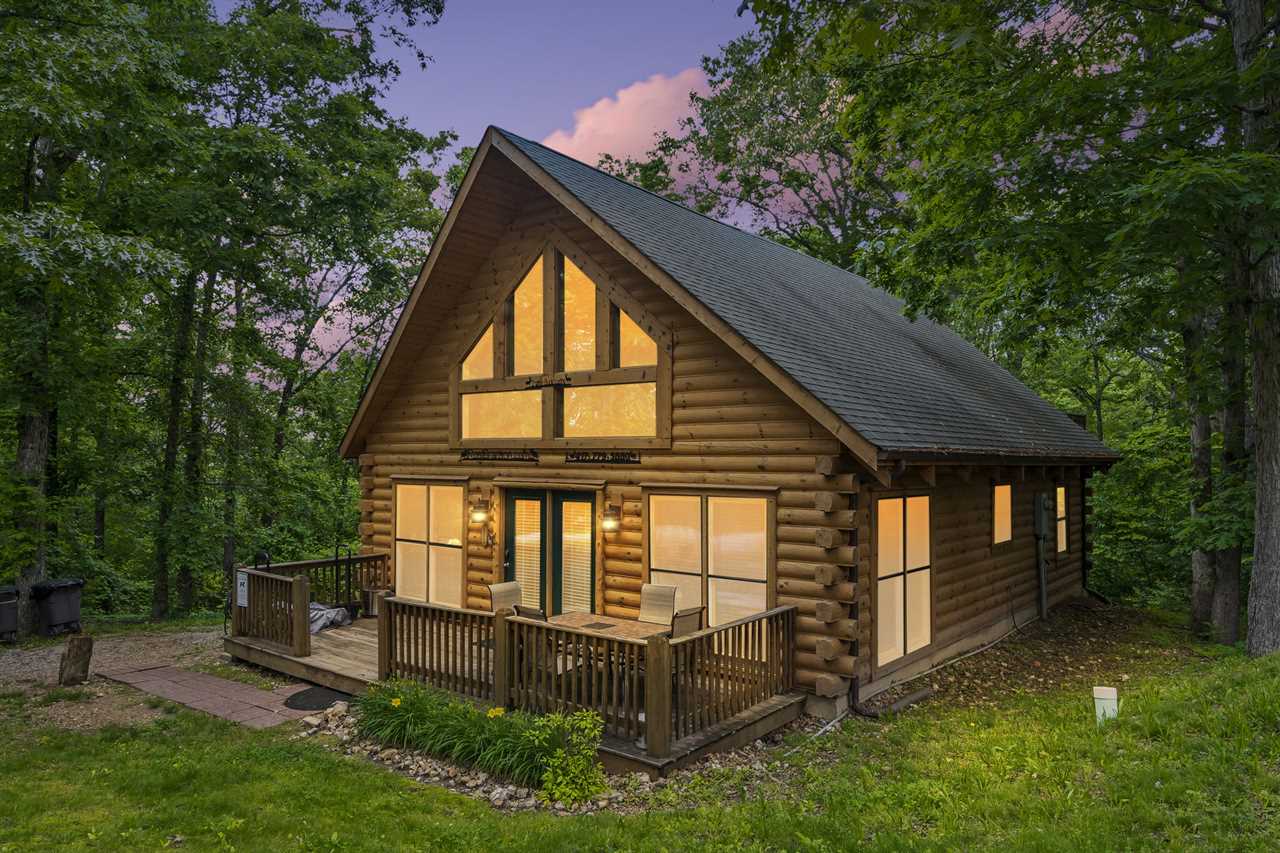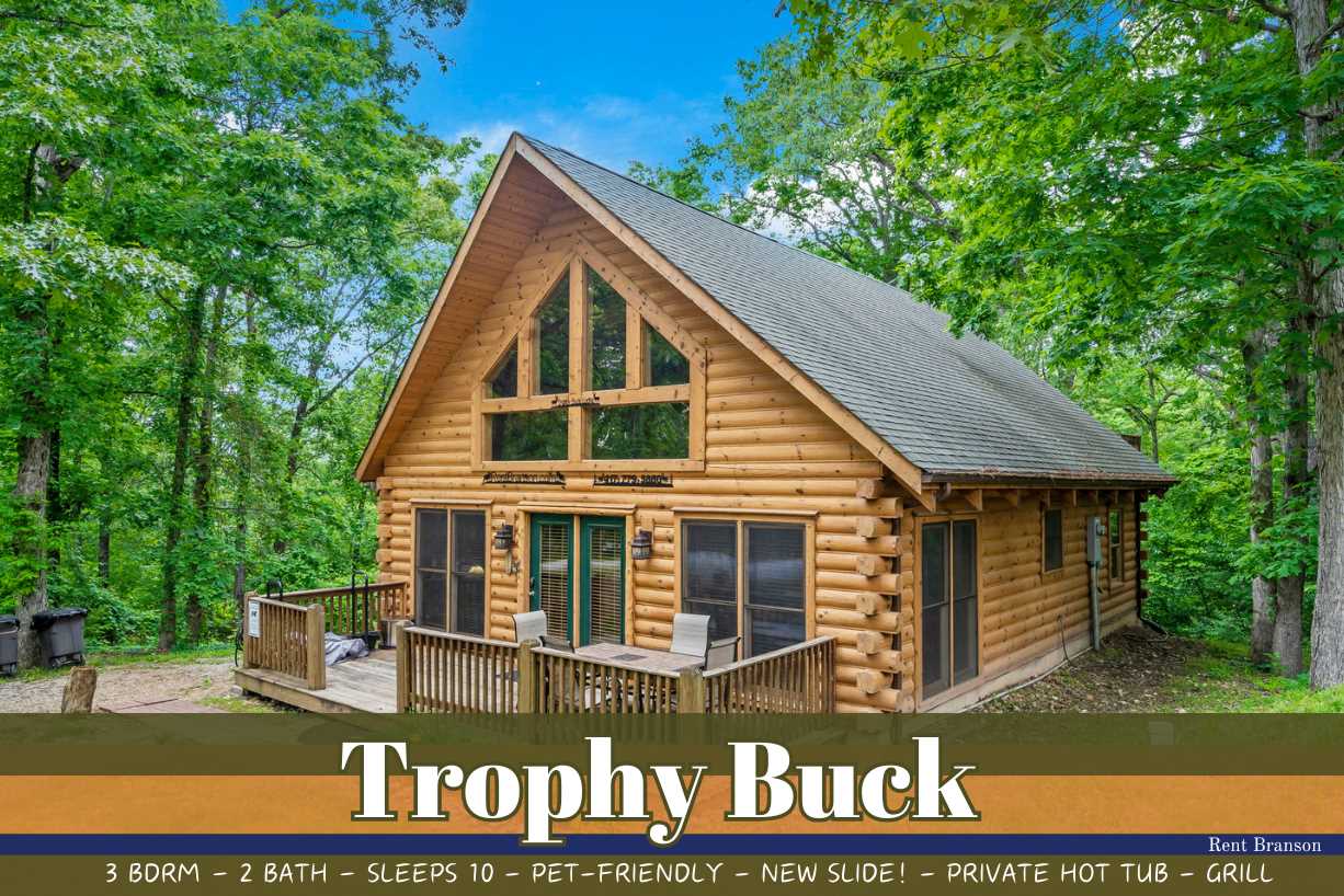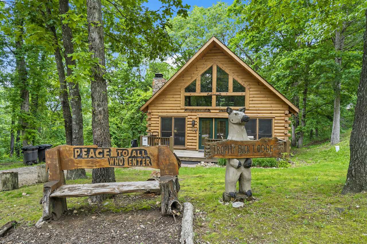 Trophy Buck is nestled in the woods providing you with a great view of the Ozarks forest and its native critters. Follow the country road a short distance past majestic rolling hills and soon you will find yourself tucked away in a beautiful two-story log cabin, perfect for families. As a very special new addition, our new slide from the upper to the lower deck promises lots of family fun!