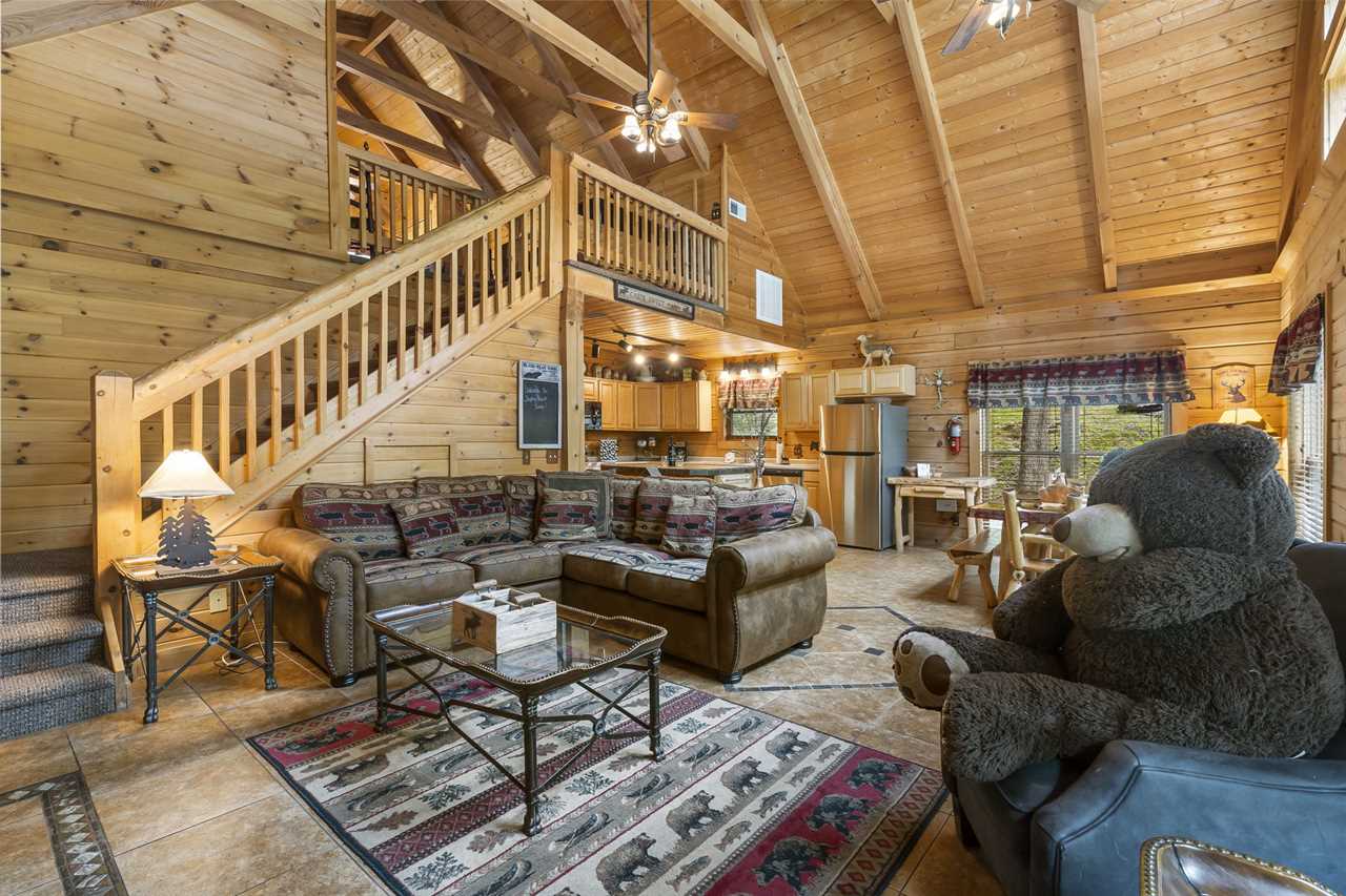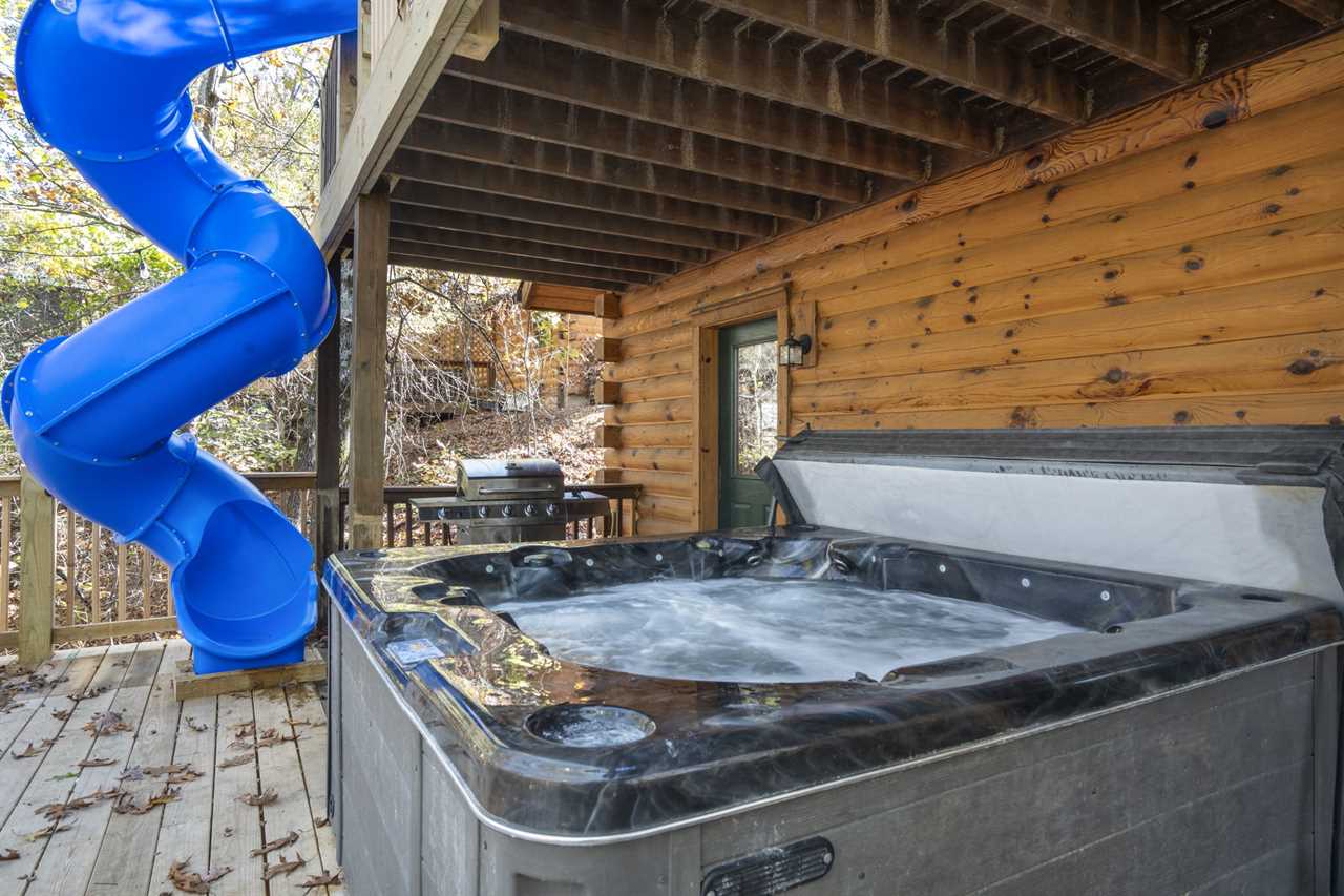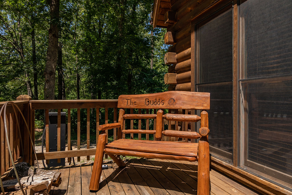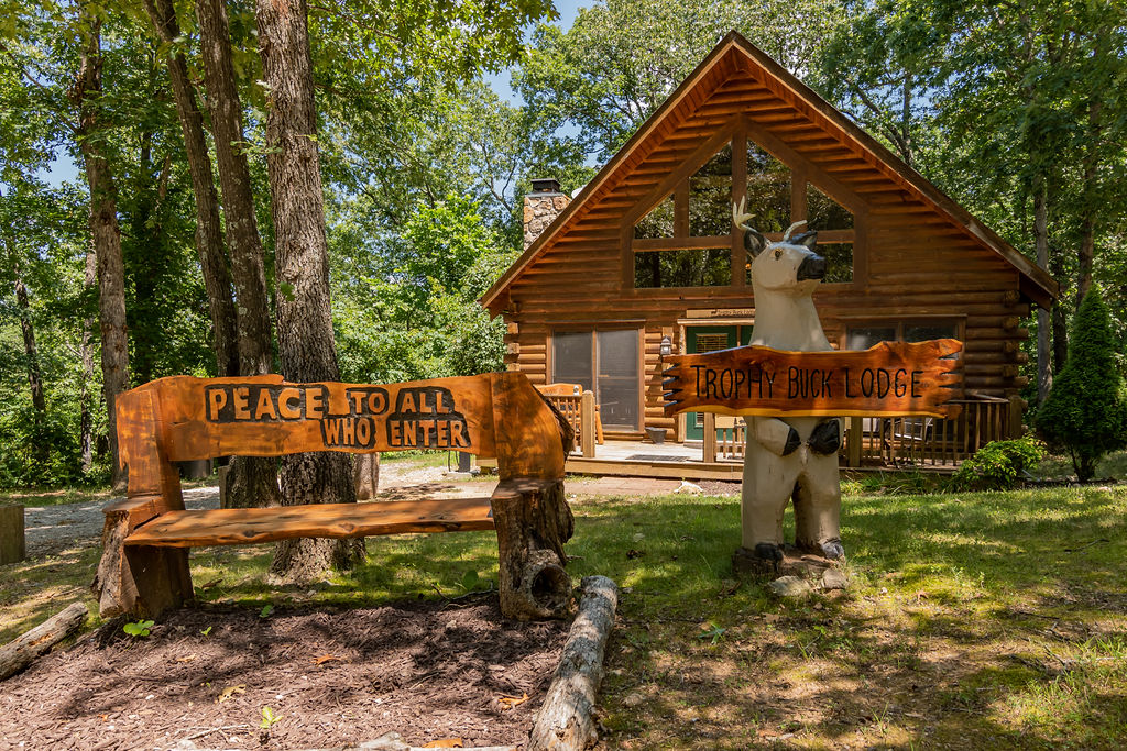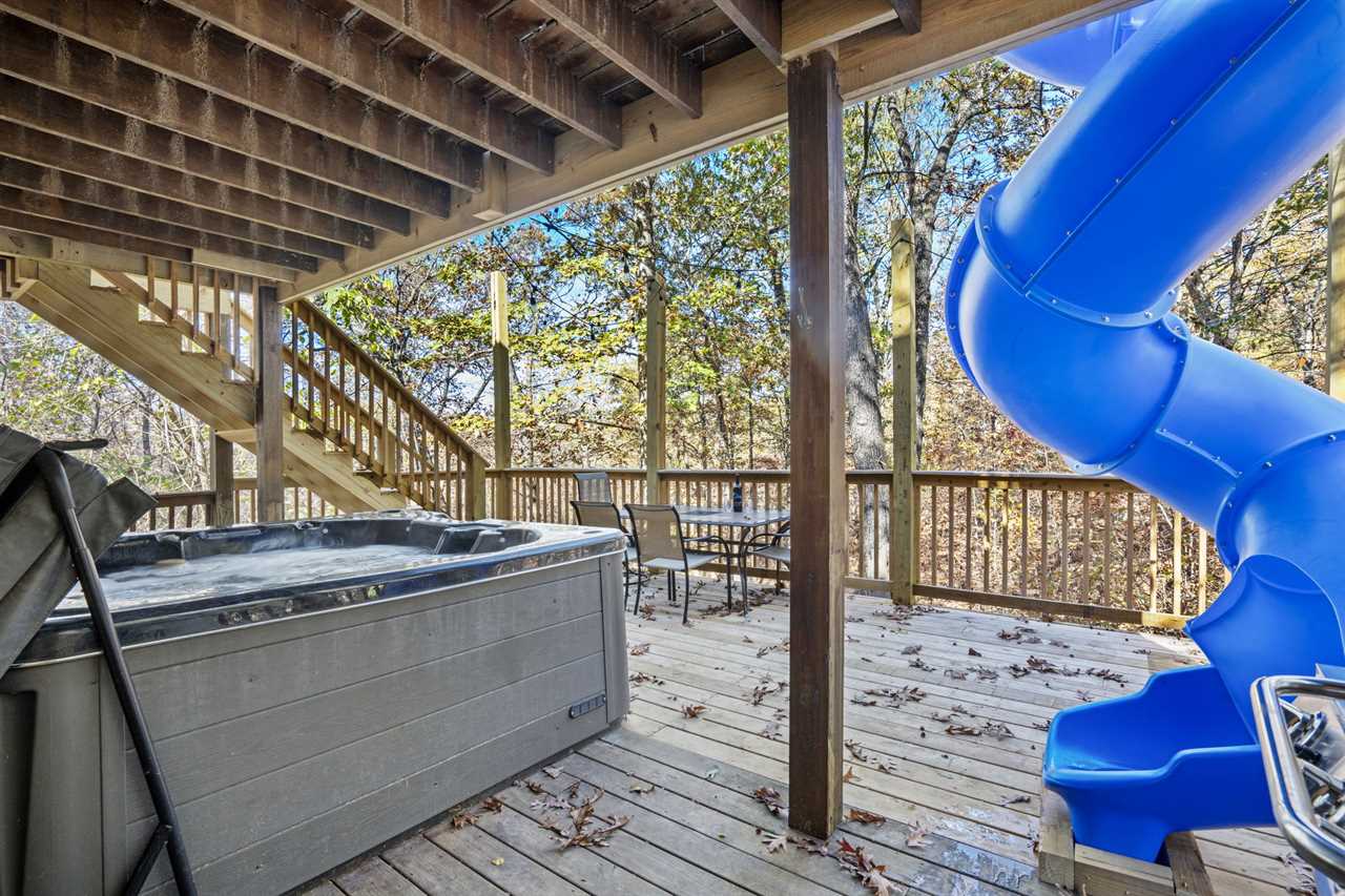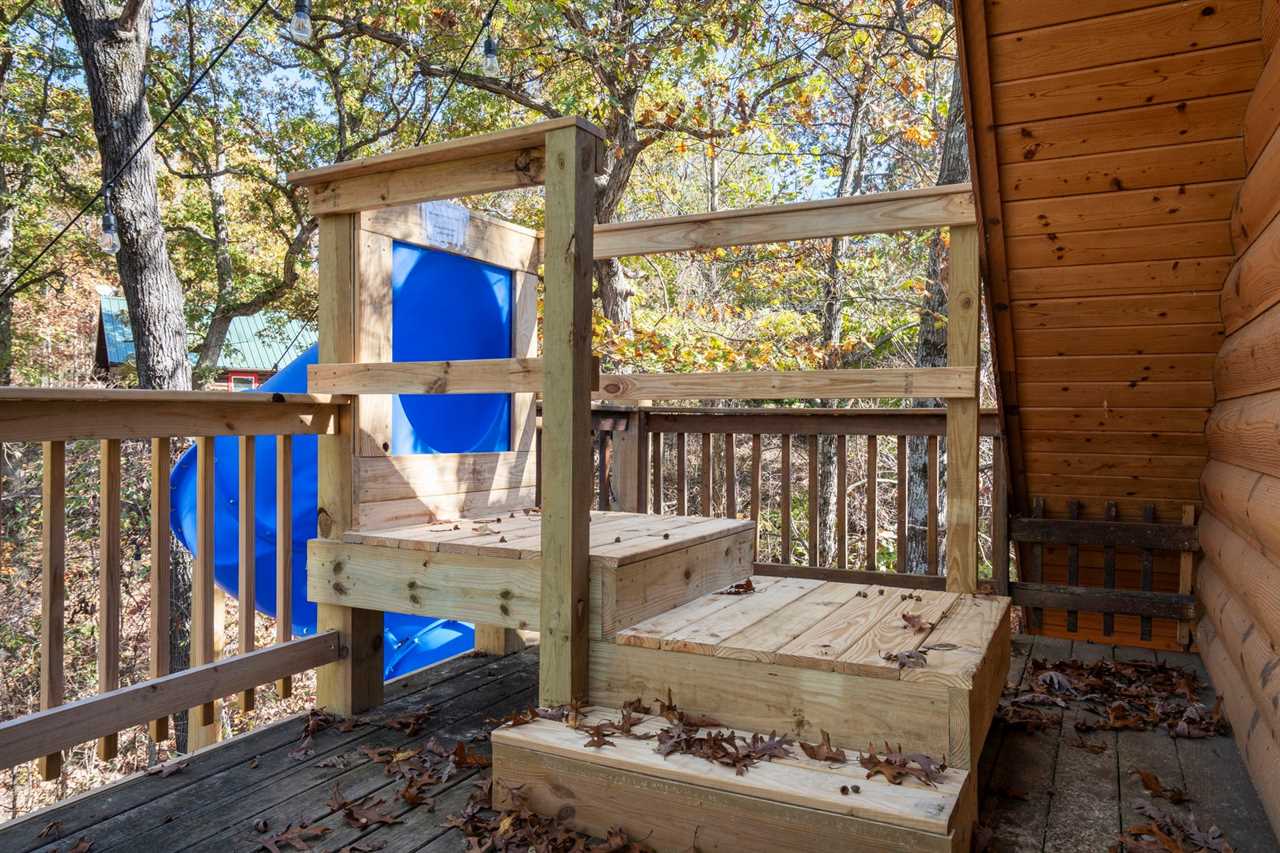 Trophy Buck is nestled in the woods providing you with a great view of the Ozarks forest and its native critters. Follow the country road a short distance past majestic rolling hills and soon you will find yourself tucked away in a beautiful two-story log cabin, perfect for families. As a very special new addition, our new slide from the upper to the lower deck promises lots of family fun!
