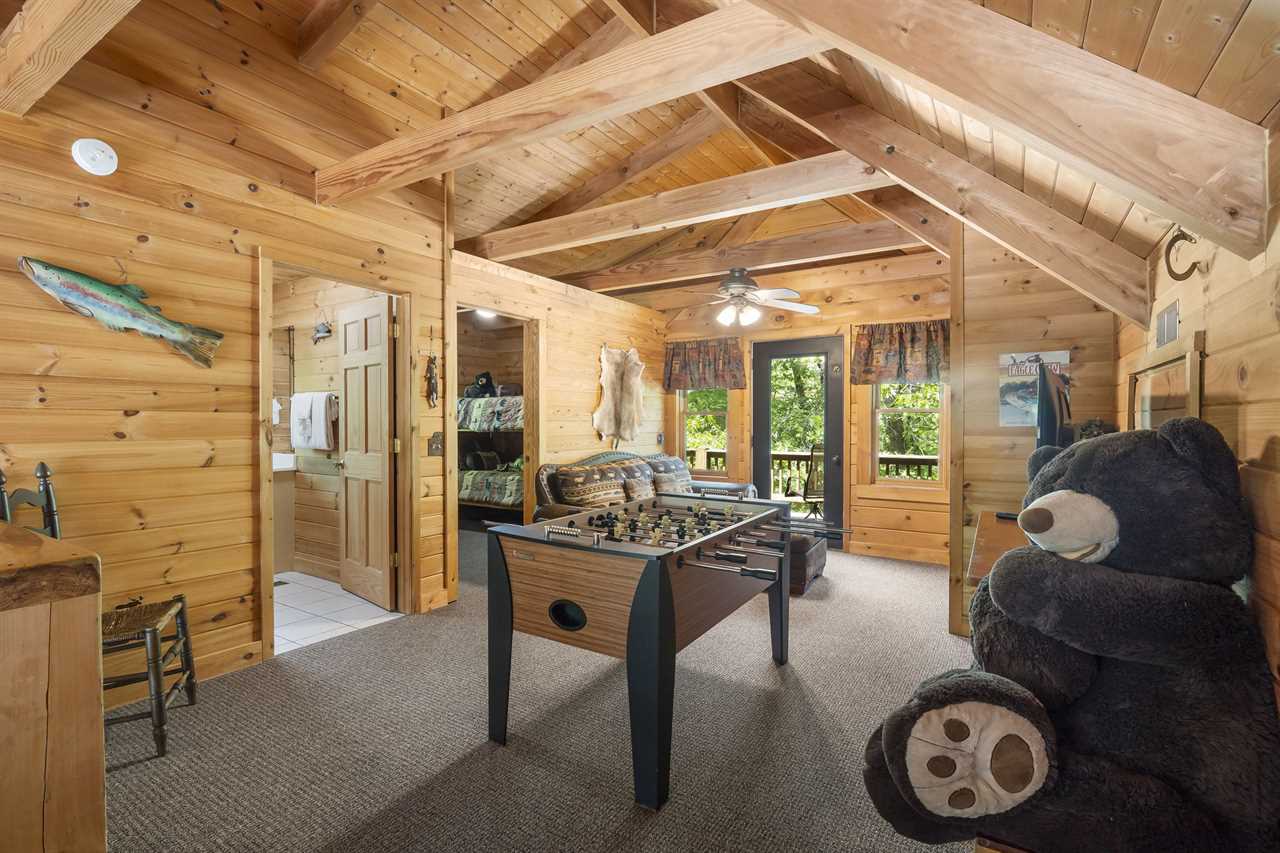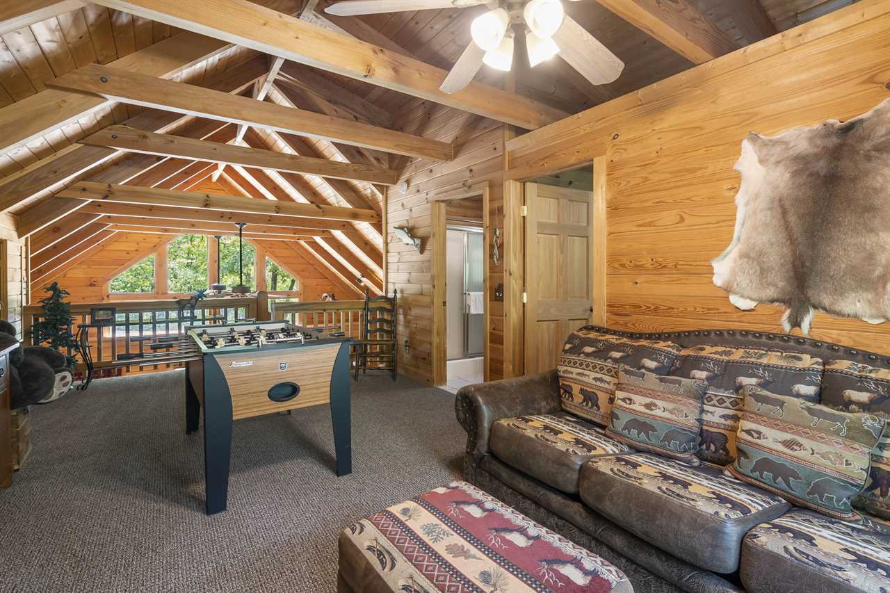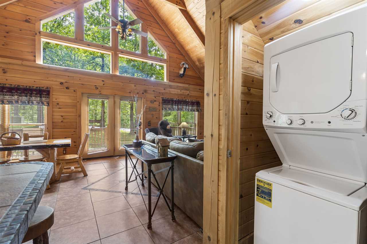 The main level is great for those that have trouble navigating stairs. There are two master bedrooms that share an adjoining back deck with endless views of nature; you may even sneak a peak at some turkey or deer! Had a lot of fun and need to do some laundry? We have a washer and dryer too! Upstairs is the perfect space for the younger ones! This level houses the bunk room and a second bathroom. Off the loft, a large back deck complete with Adirondack chairs awaits you as you enjoy a cup of coffee as the forest comes to life each morning. Trophy Buck has inviting top-of-the-line beds featuring comfy pillow-top mattresses and each bedroom offers Smart HDTVs. This will be the Trophy of your vacation!