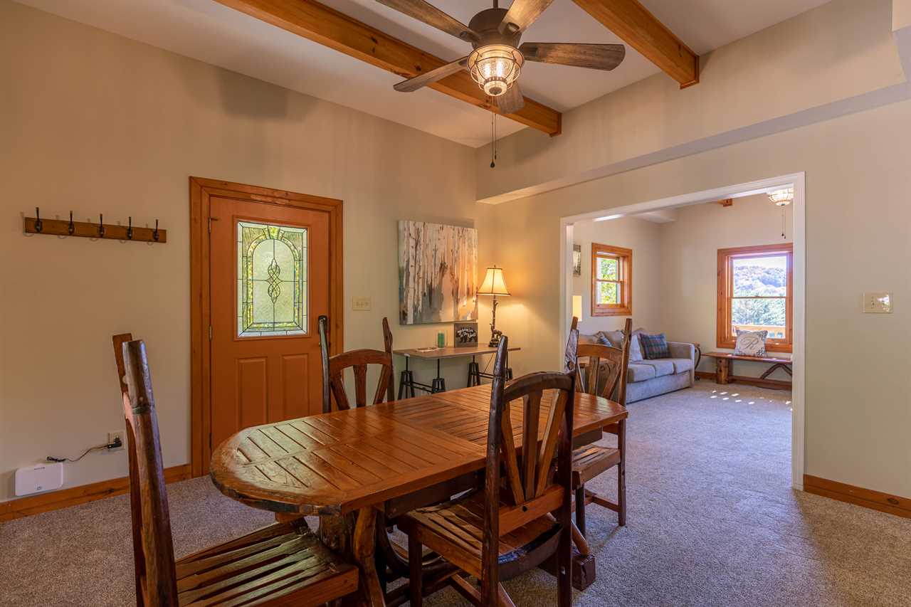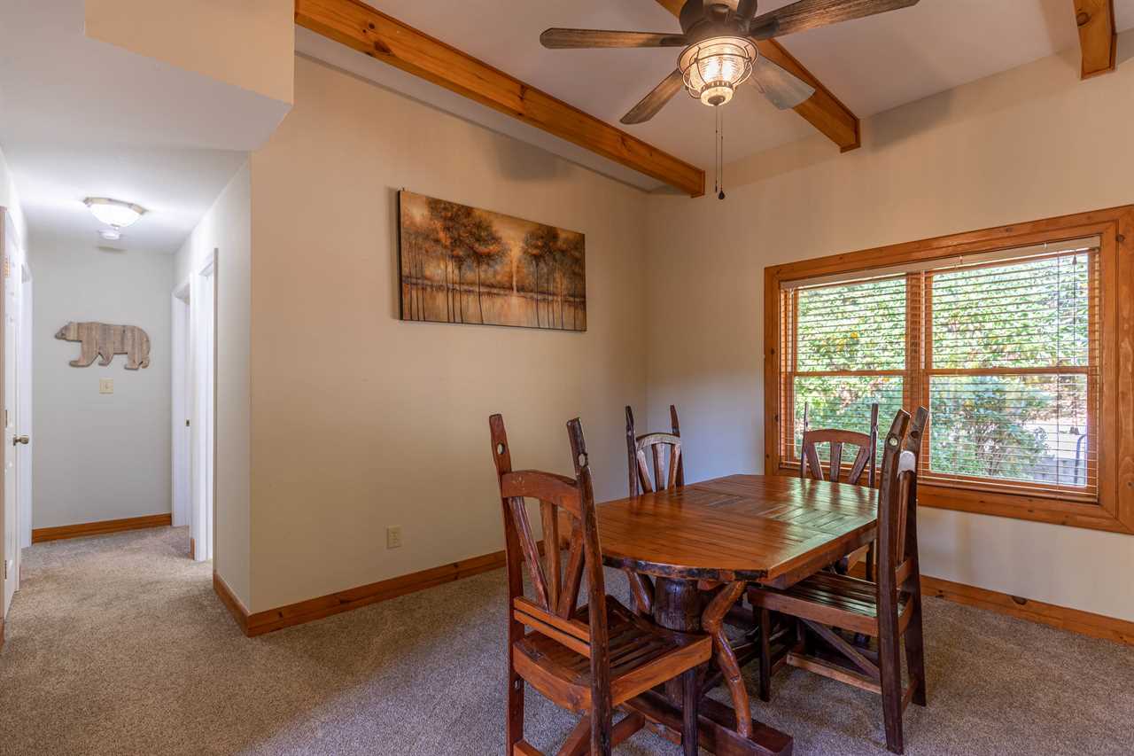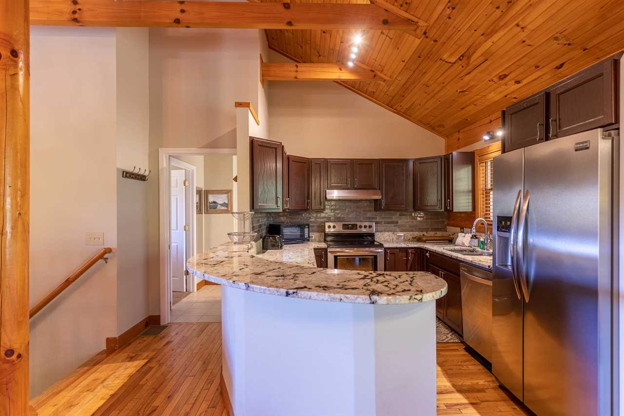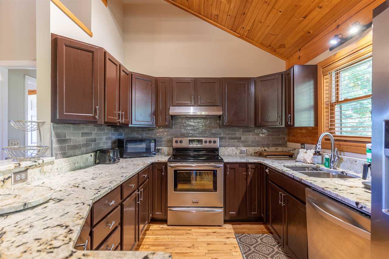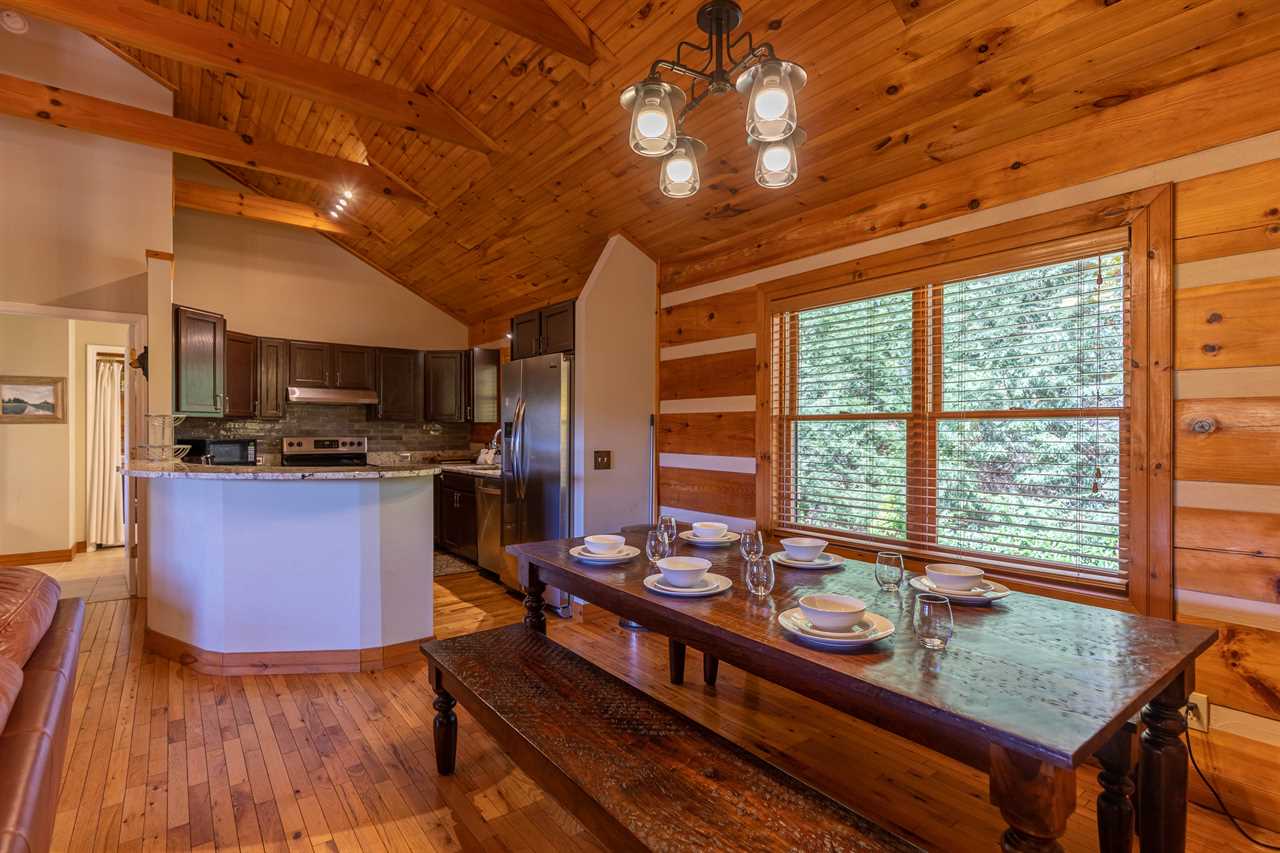 The master bedroom and bathroom are located on the upper level of the home. This room features a queen bed, TV, and a full bath with a shower/tub combo. Also located on the main level you will find the fully equipped kitchen sporting Frigidaire appliances, beautiful granite counters, and a combined standard drip & Keurig coffee maker. The adjacent dining space offers seating for 8 at the large farmhouse style table with a bench on each side. The living room is open to the dining and kitchen areas, allowing for ample space to spread out! There is a lovely wood-burning fireplace in the living room and a flat screen TV.
