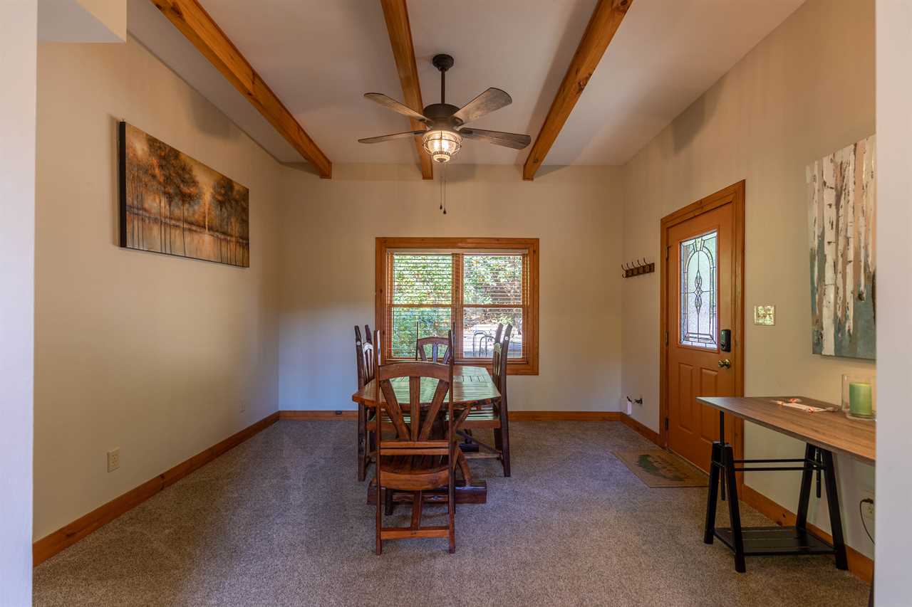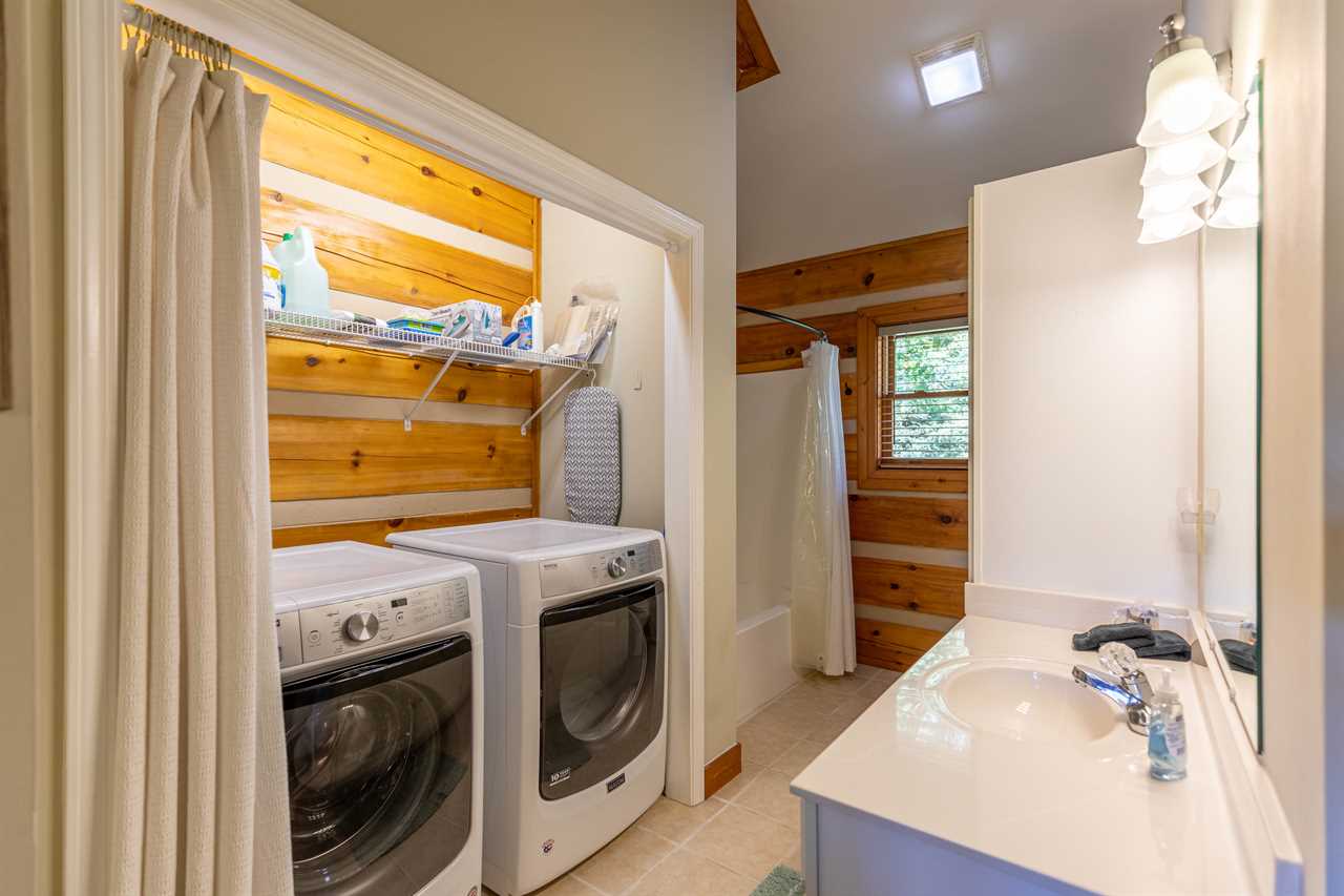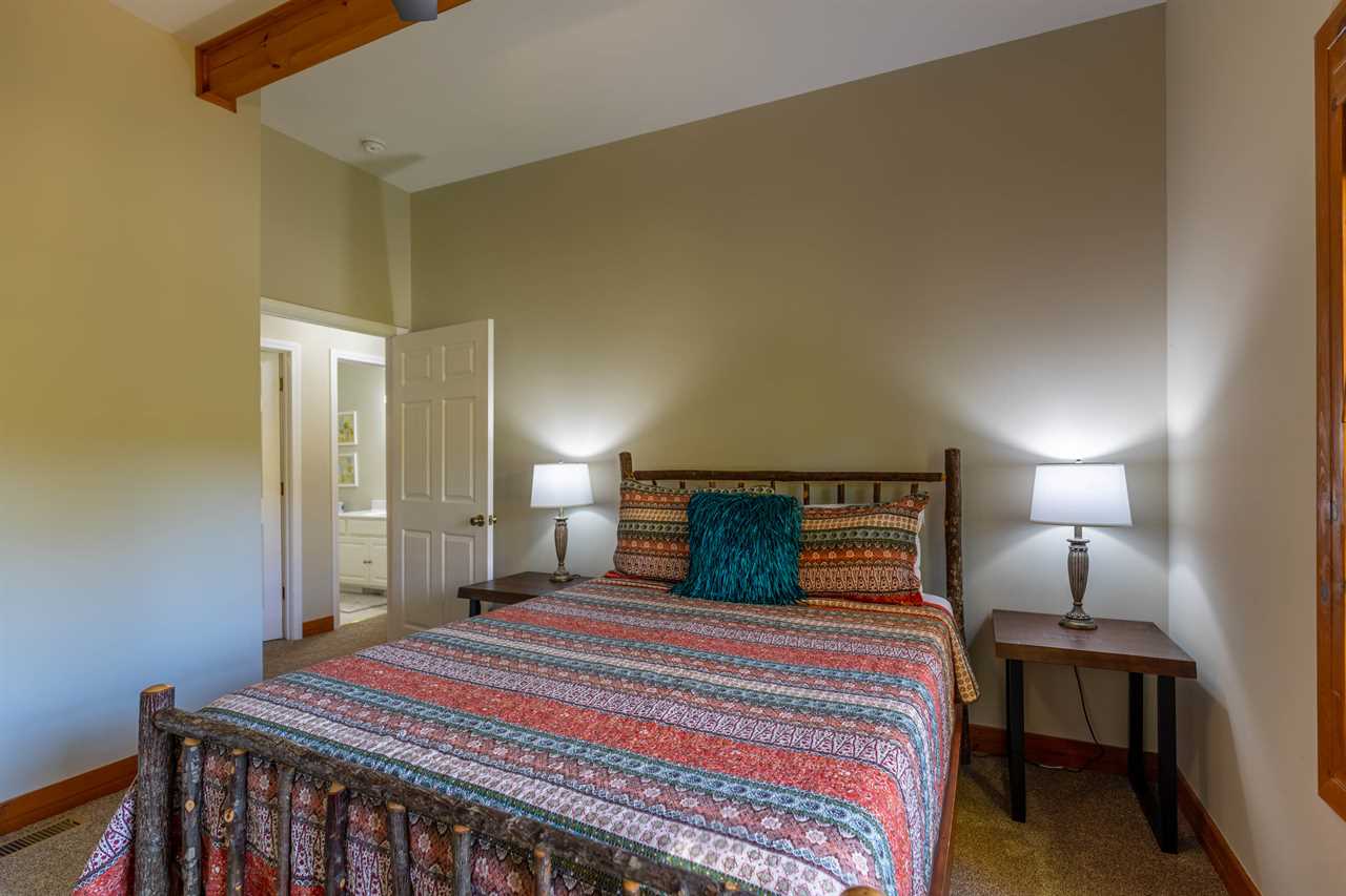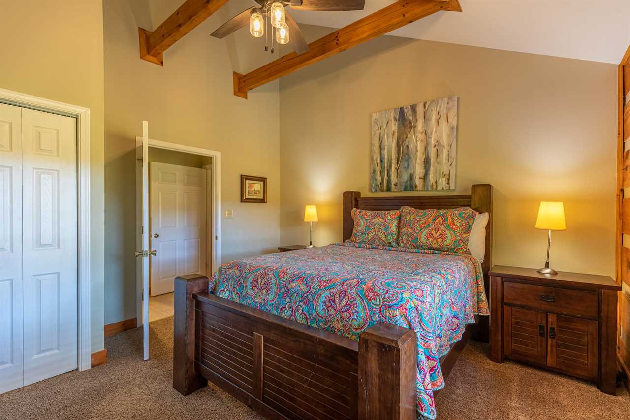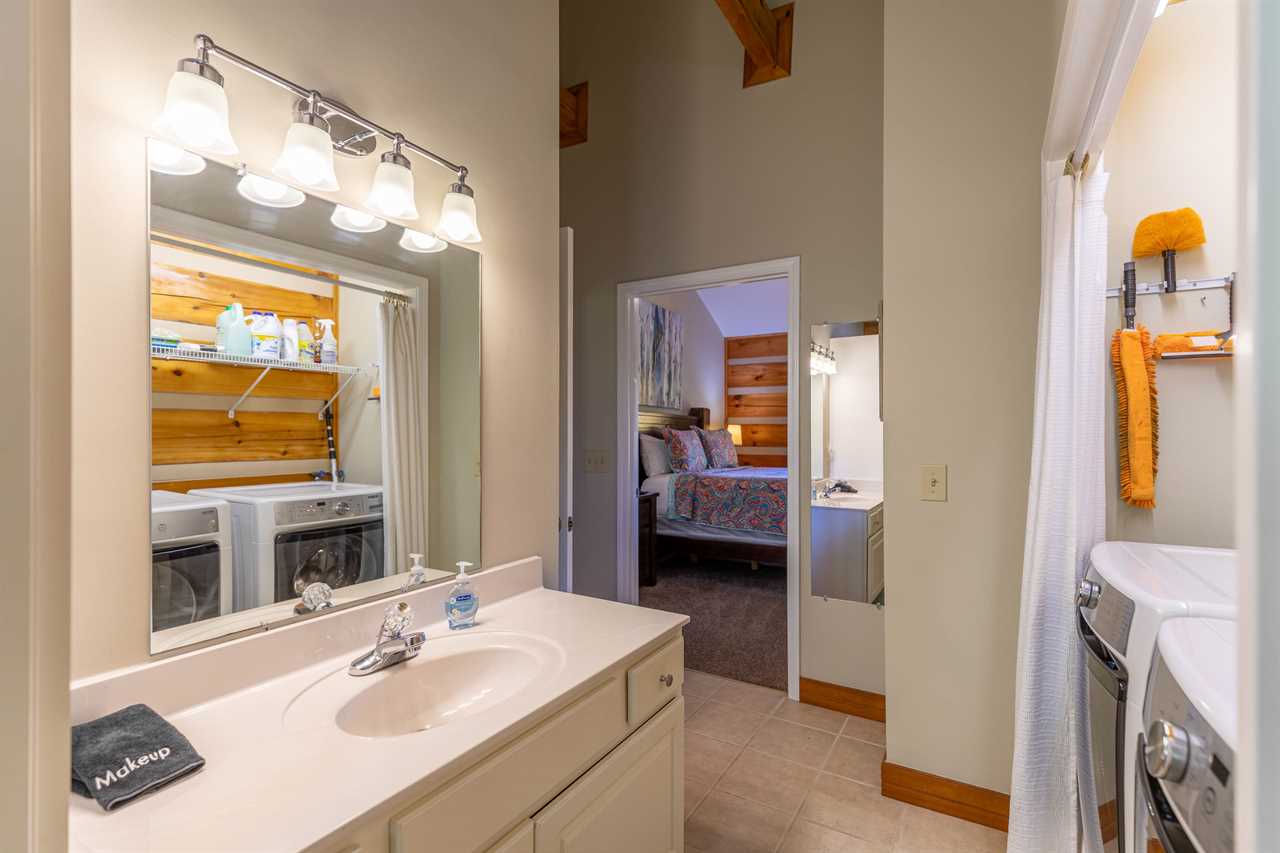 The master bedroom and bathroom are located on the upper level of the home. This room features a queen bed, TV, and a full bath with a shower/tub combo. Also located on the main level you will find the fully equipped kitchen sporting Frigidaire appliances, beautiful granite counters, and a combined standard drip & Keurig coffee maker. The adjacent dining space offers seating for 8 at the large farmhouse style table with a bench on each side. The living room is open to the dining and kitchen areas, allowing for ample space to spread out! There is a lovely wood-burning fireplace in the living room and a flat screen TV.