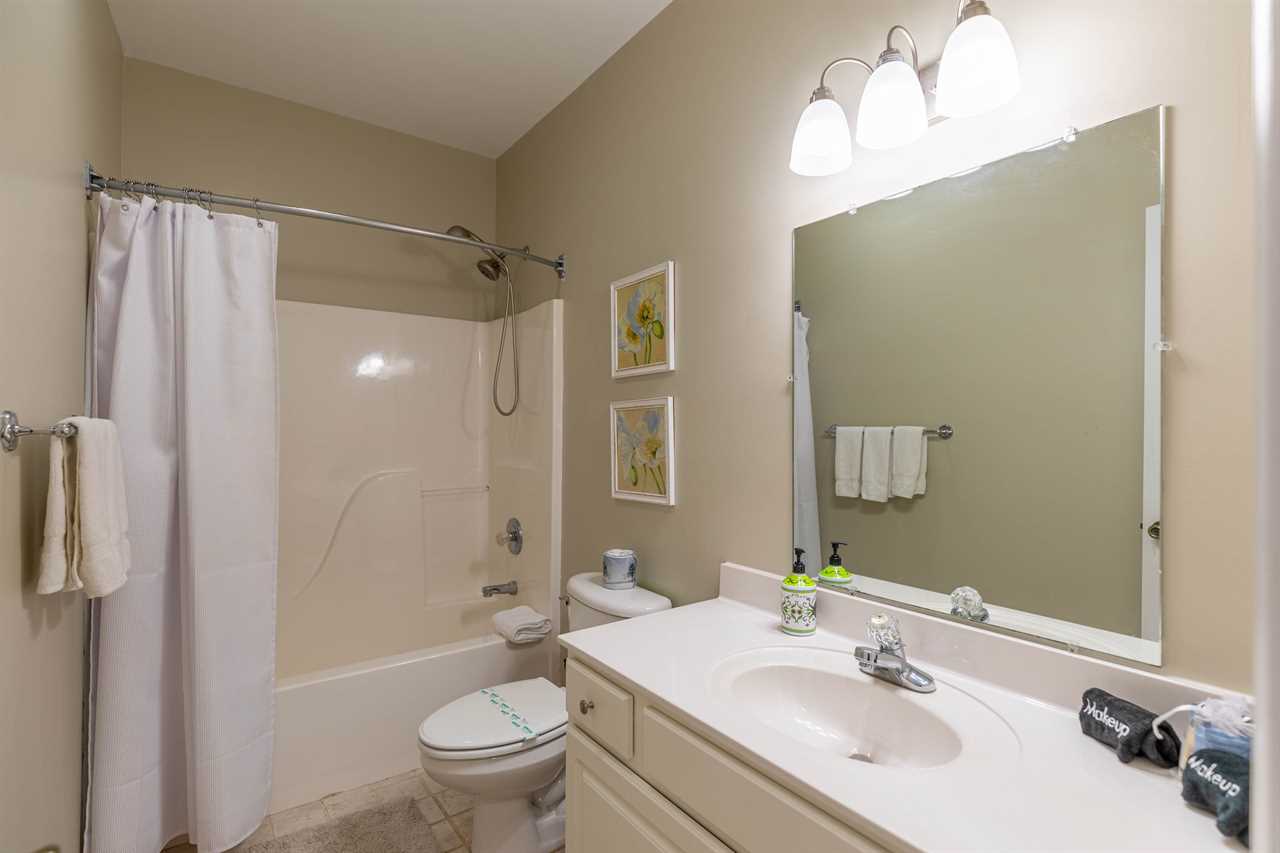 The middle floor features bedrooms 2 and 3. Both bedrooms offer a queen bed, and they share a full bathroom with a shower/tub combo. On the lowest level of the home you'll find the bunk room featuring a twin bunk bed (there is no bathroom on this level). Also on this level you'll find the game room with a pool table!
