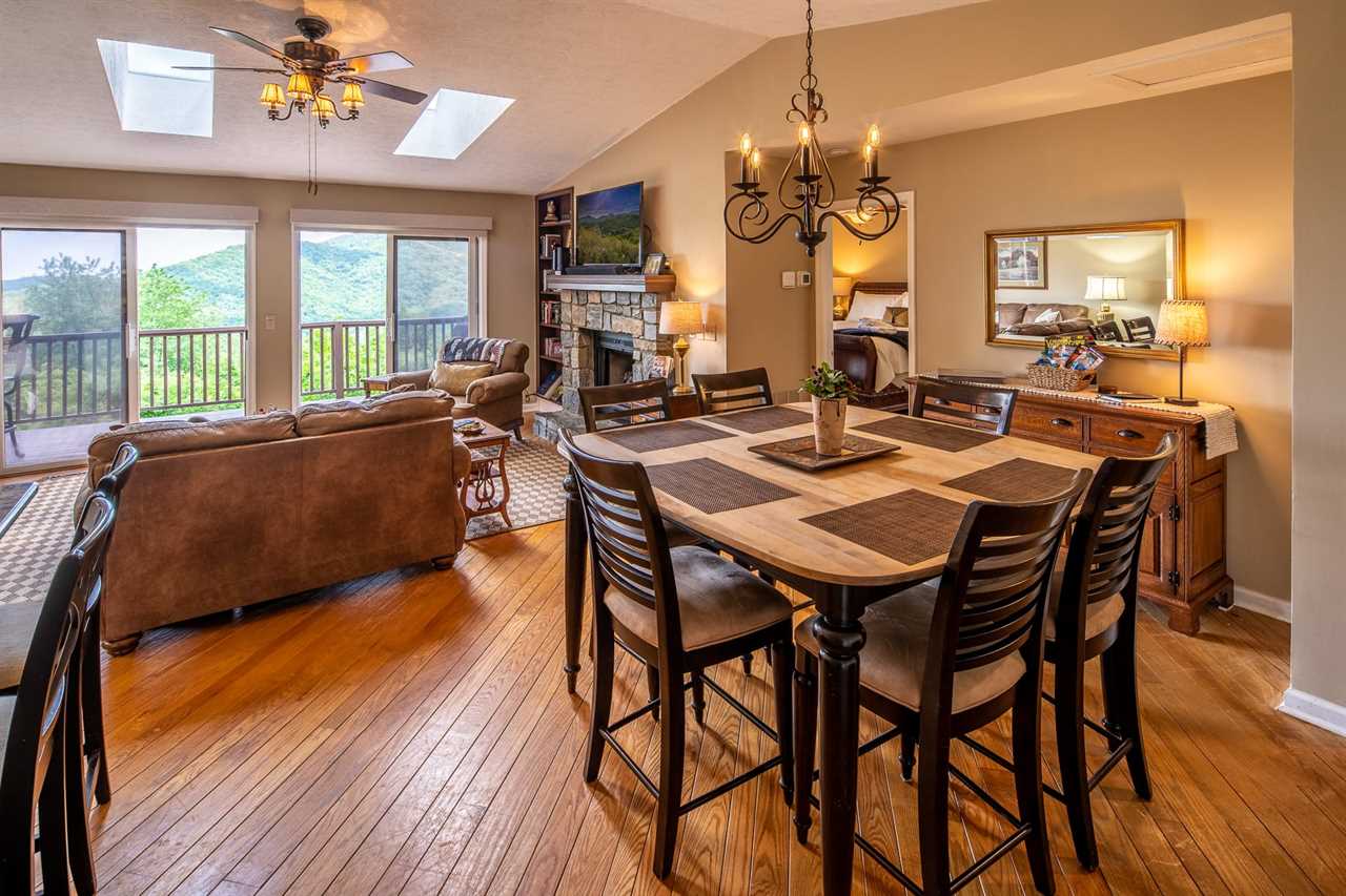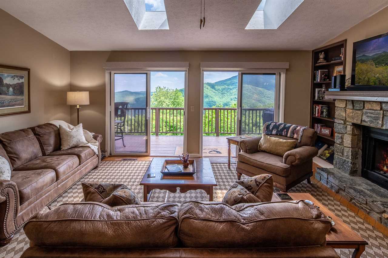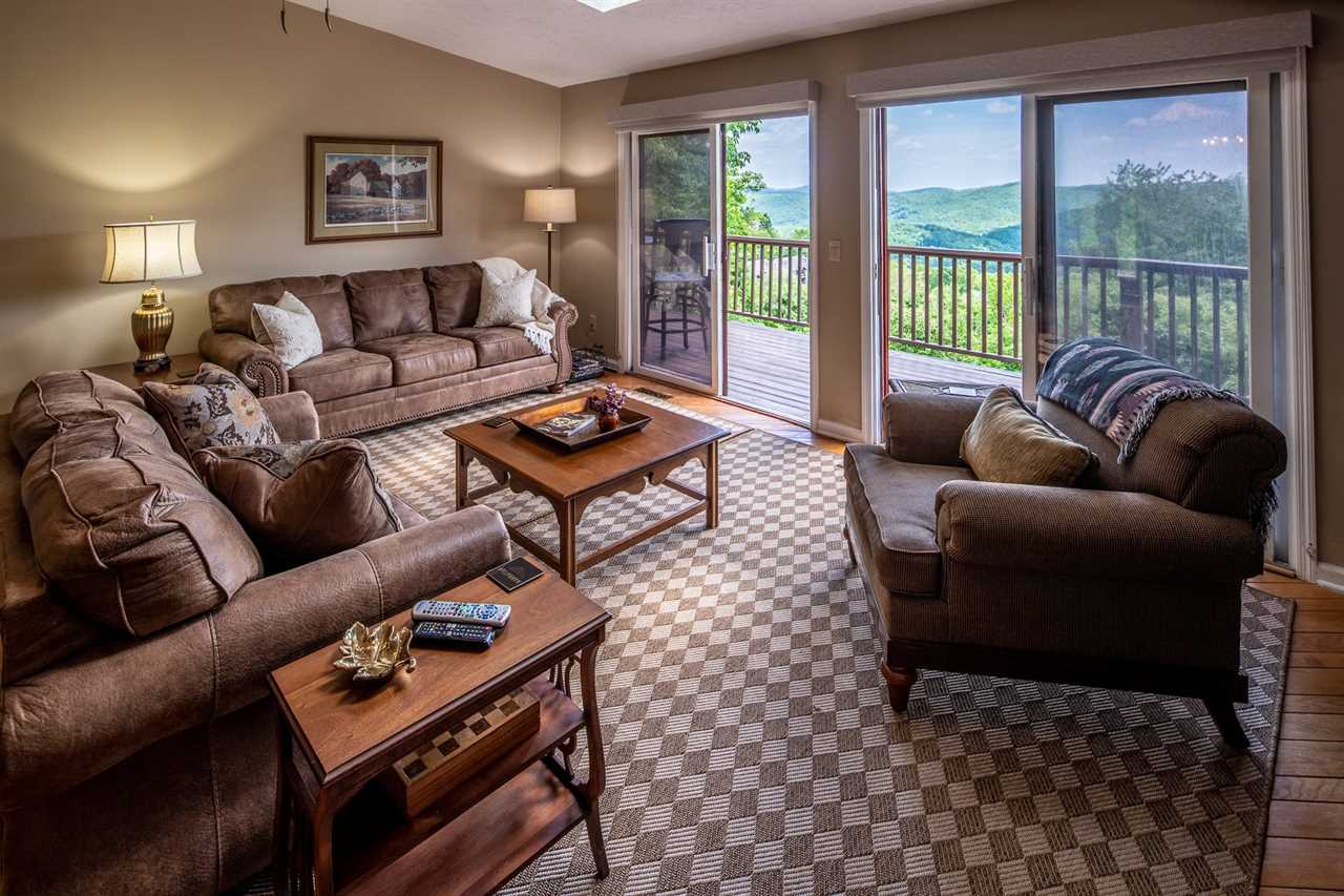 Kick App View is located in the Blue Ridge Mountains and boasts layered long-range views and an amazing view of Grandfather Mountain. Kick App View sleeps eight (8) guests in 4 bedrooms- all of which have a King or Queen bed, plus a Pack-N-Play crib should you need it. Central heat and air provide year-round comfort, or open the large glass doors in the main living area and enjoy the mountain breeze. The main level boasts an Open Concept Great Room, Dining, and Kitchen area with vaulted ceiling and skylights. Comfortable leather furniture frames a beautiful stone fireplace with gas logs, providing ambiance at the touch of a button. Kick App View has a wall of glass doors providing an abundance of natural light and opening to a deck offering long-range mountain views no matter the season. Six can sit comfortably at the dining table plus two more at the kitchen counter-height bar top so eight guests can all dine together. The fully equipped kitchen features granite countertops, upgraded stainless steel appliances, a microwave, and a gas range. The upper deck with its view of Grandfather Mountain has outdoor table seating and an easy-to-operate gas grill. An attached screened porch adjoins the deck with seating for six where guests can enjoy morning coffee or evening cocktails.