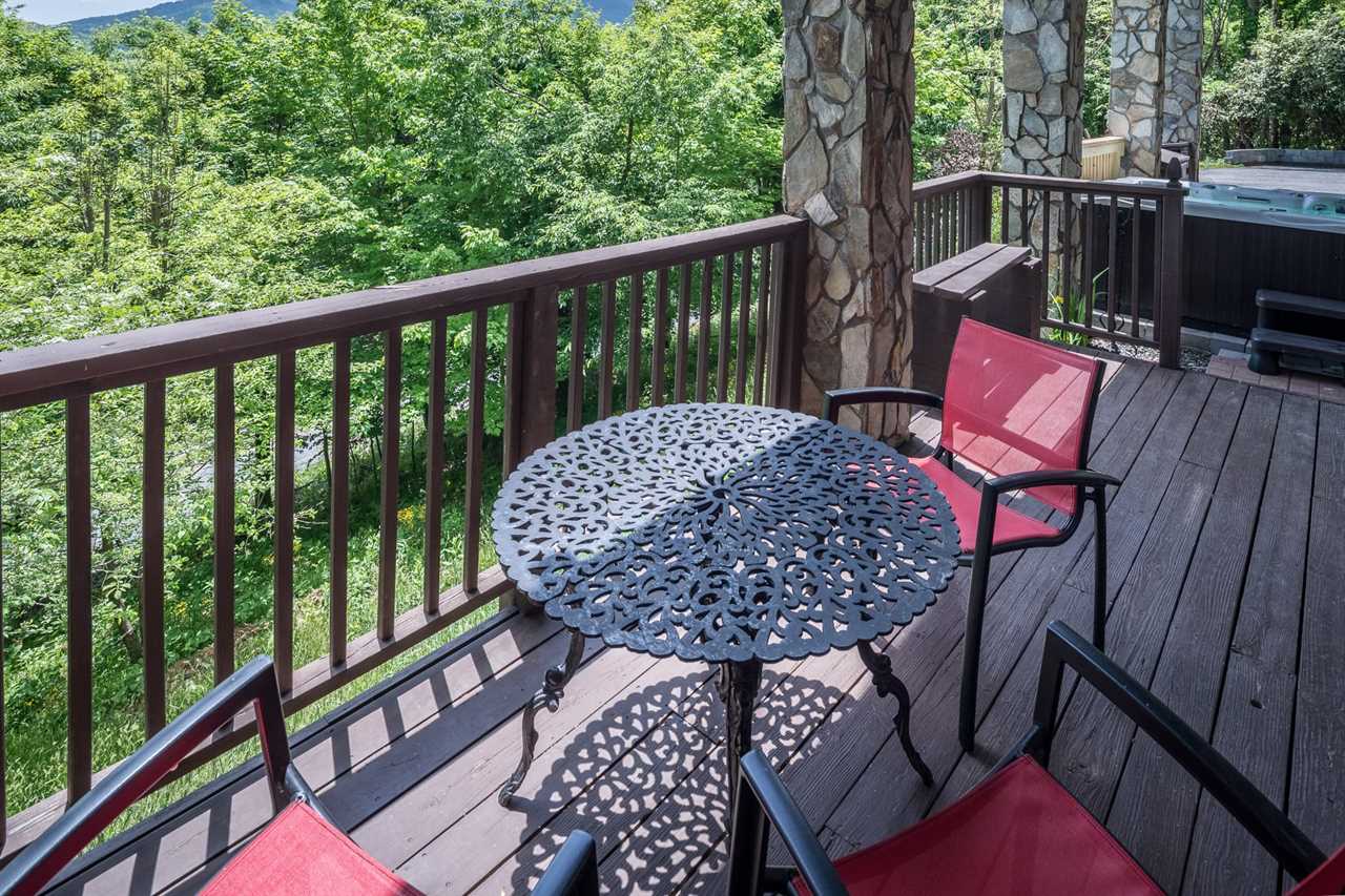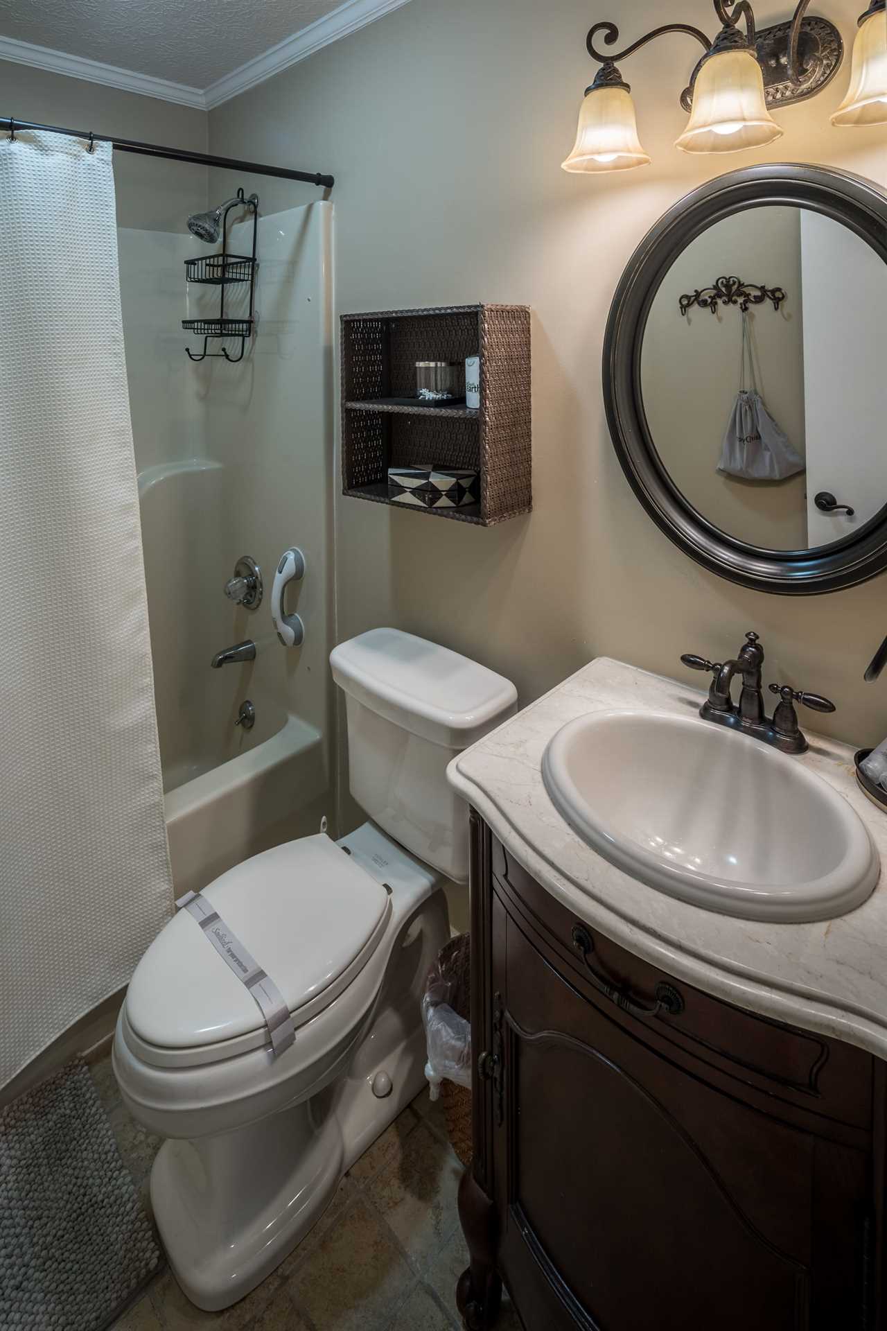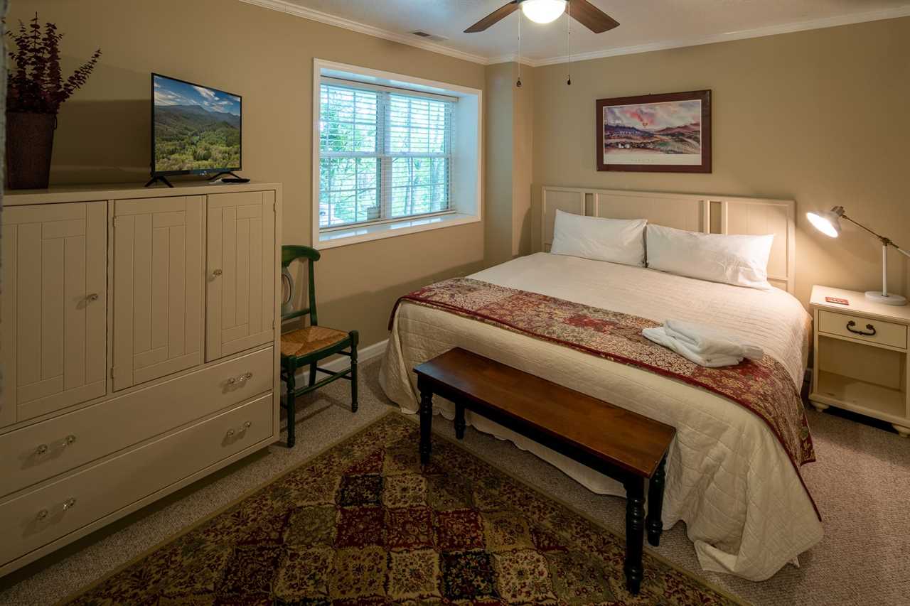 The King Master Suite, located on the main level of the home, has sliding glass doors that enjoy the view and open to the screened porch. The King Master Suite has an HDTV and a private ensuite bathroom with granite vanity and a tub/shower combo. There are additional Queen bedrooms on the main level, each with an HDTV. One has French Doors opening to the deck and mountain views. There is a full hallway bathroom between the two Queen Bedrooms.