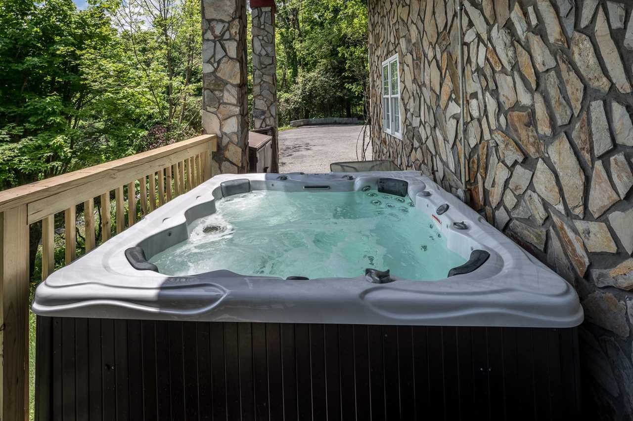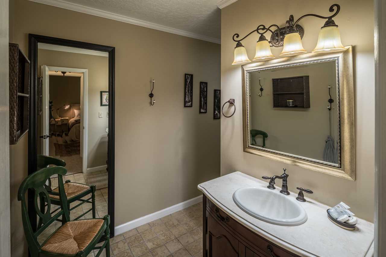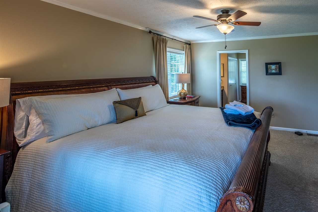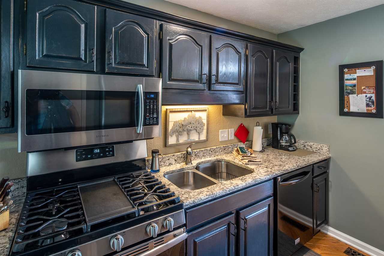 The King Master Suite, located on the main level of the home, has sliding glass doors that enjoy the view and open to the screened porch. The King Master Suite has an HDTV and a private ensuite bathroom with granite vanity and a tub/shower combo. There are additional Queen bedrooms on the main level, each with an HDTV. One has French Doors opening to the deck and mountain views. There is a full hallway bathroom between the two Queen Bedrooms.