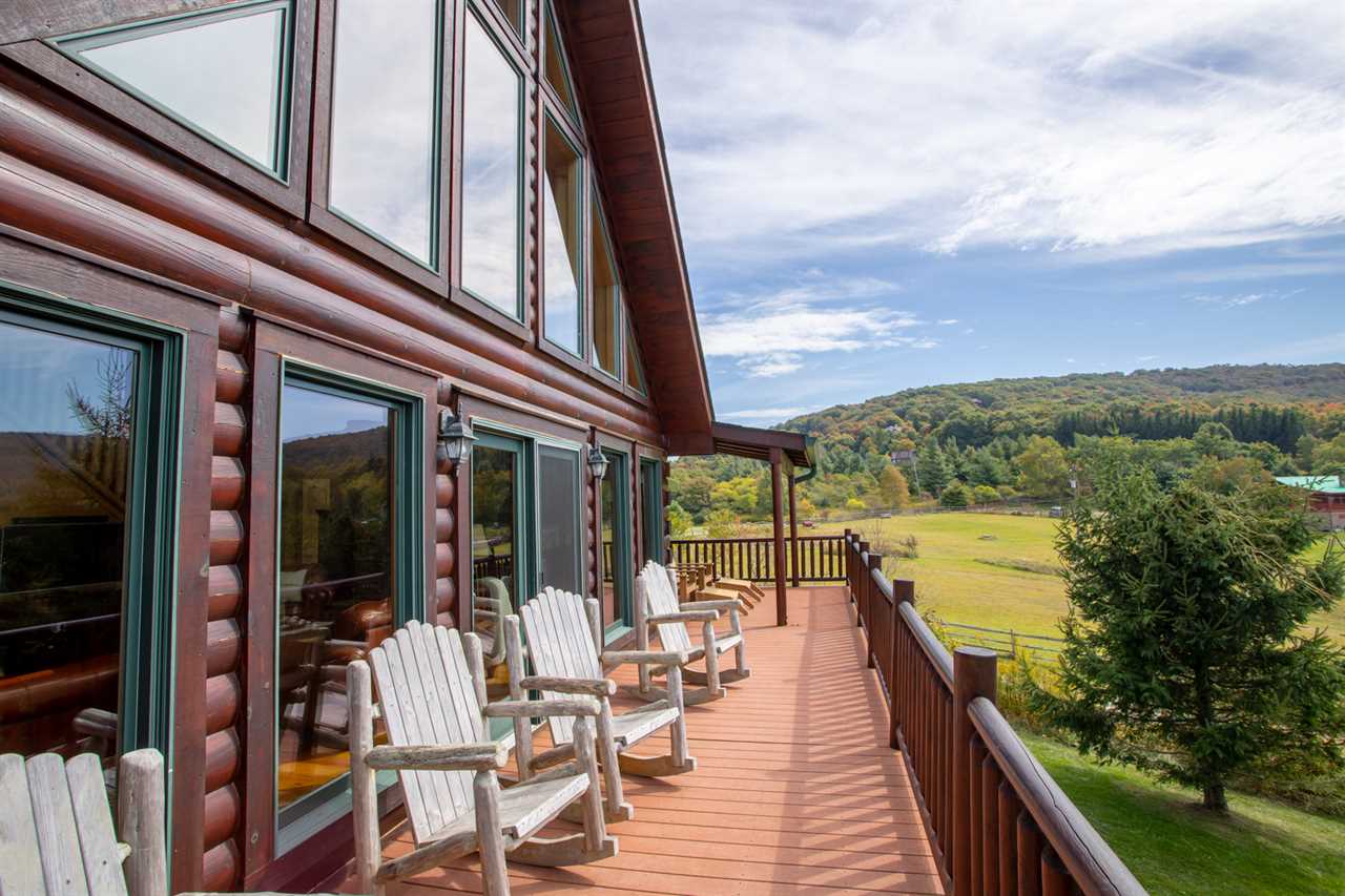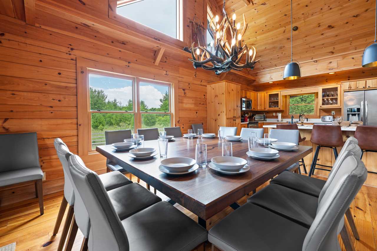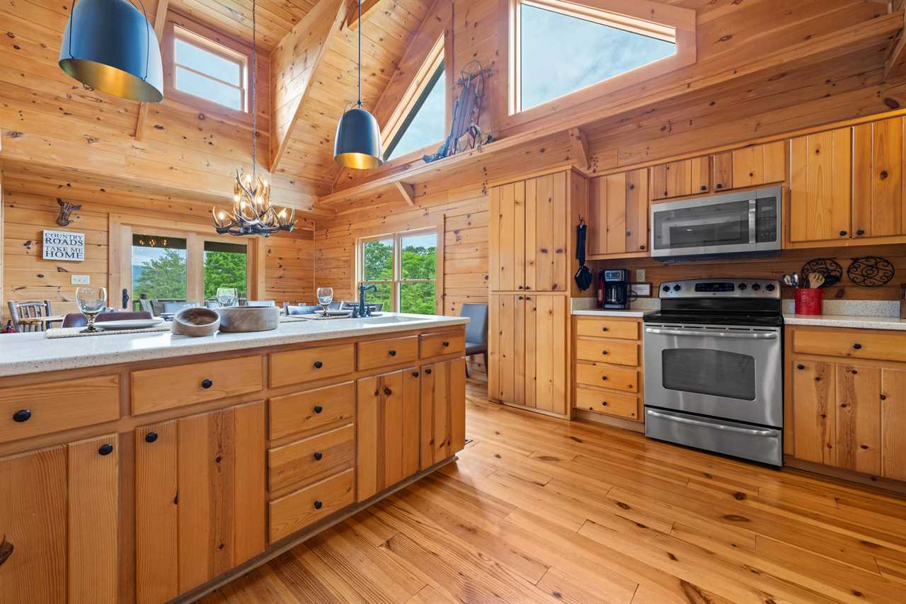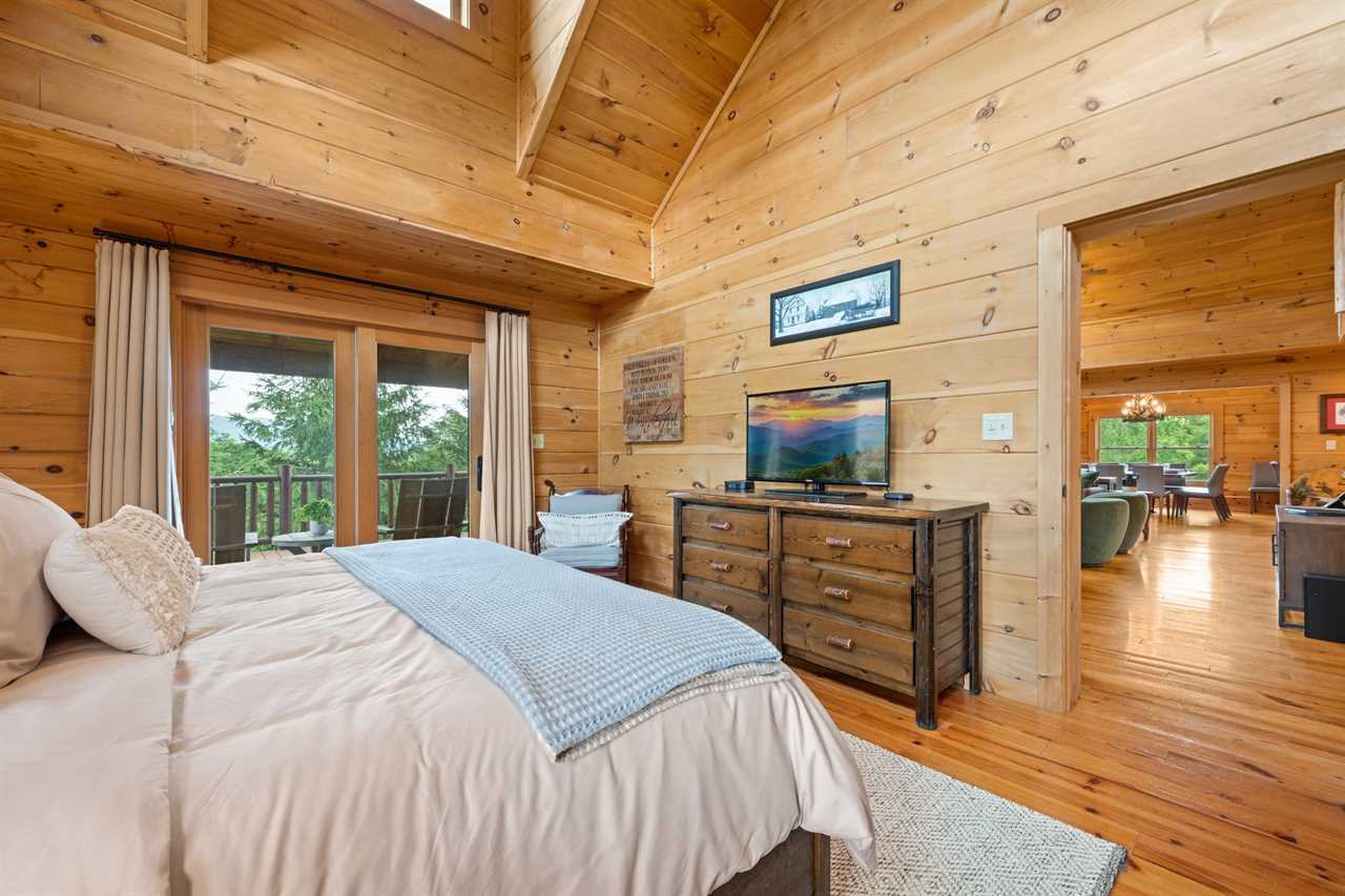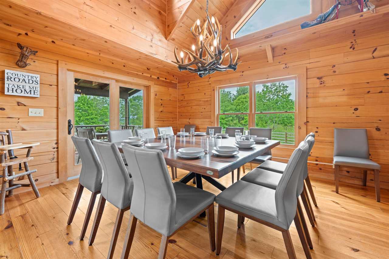 A charming log home built by Blue Ridge Log Cabins, Alpine Ridge accommodates 13 guests with warm and welcoming decor, quality furnishings, and comfortable options for relaxation and rejuvenation. As the name suggests, Alpine Ridge sits on a ridgeline with long-range, 180-degree views that include the slopes of Beech Mountain in the distance. It's spacious and roomy enough for your entire party to spread out. The cabin offers open-concept living space on the main level with a cathedral ceiling, large windows, upscale decor, large decks, and sweeping views of the surrounding mountains. The cabin is south-facing so you can enjoy sunrise coffee on the partially covered deck. Spend evenings grilling on the gas grill and sipping wine at sunset, but don't forget to leave room for S'mores at the fire pit for dessert!