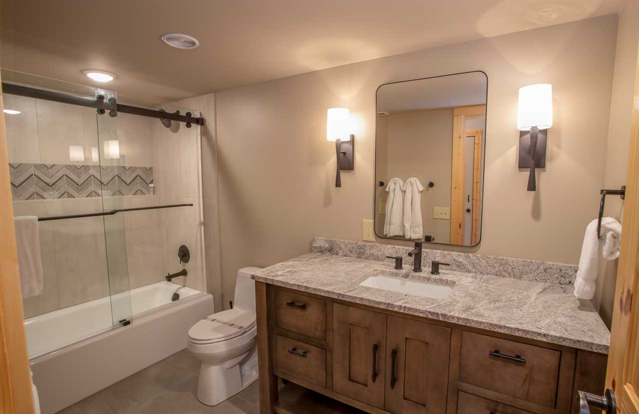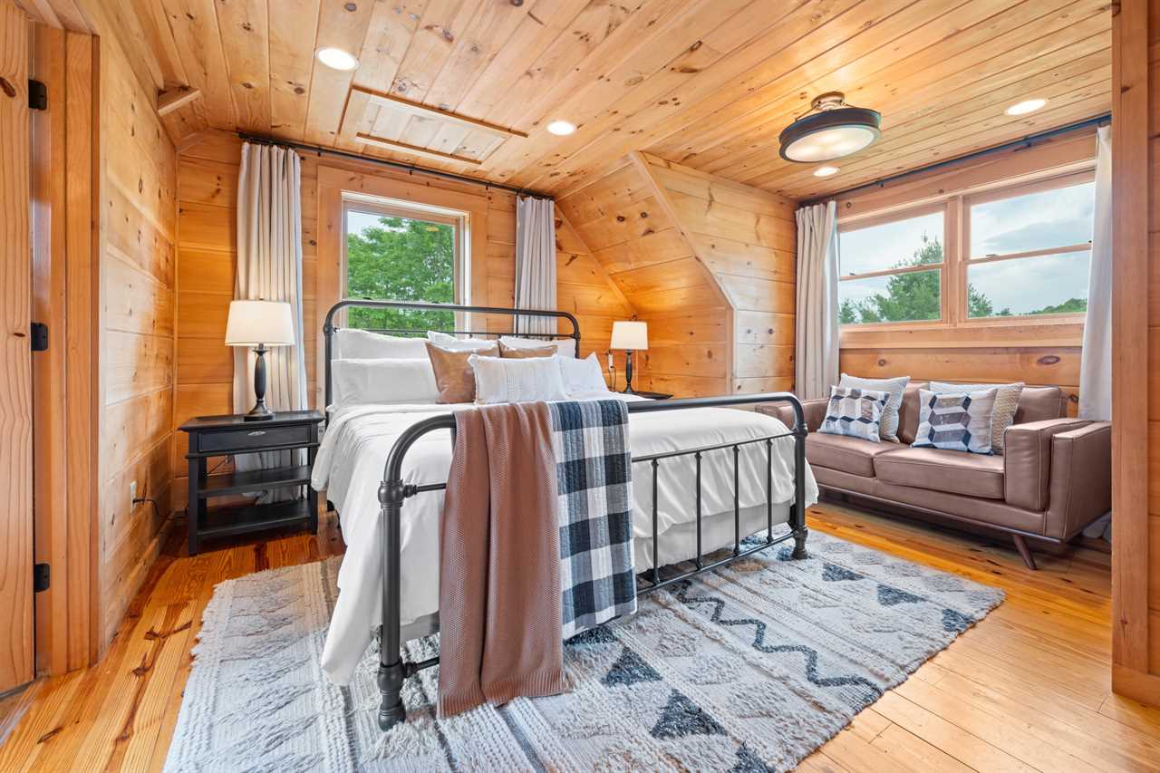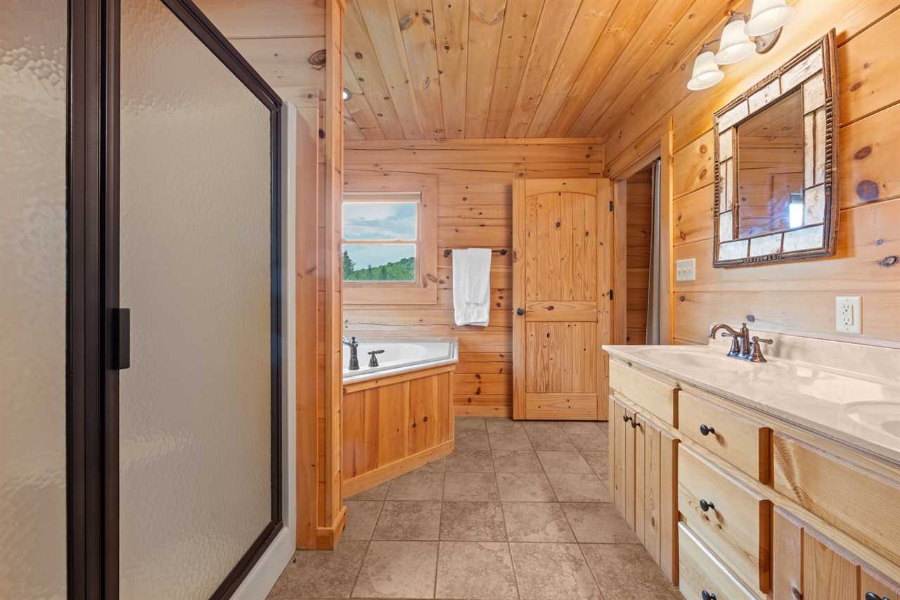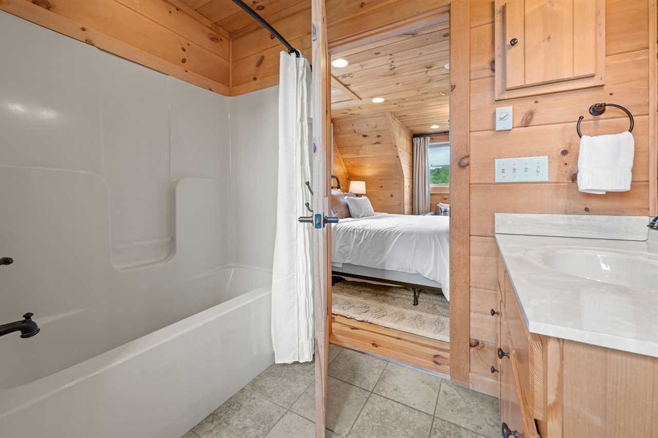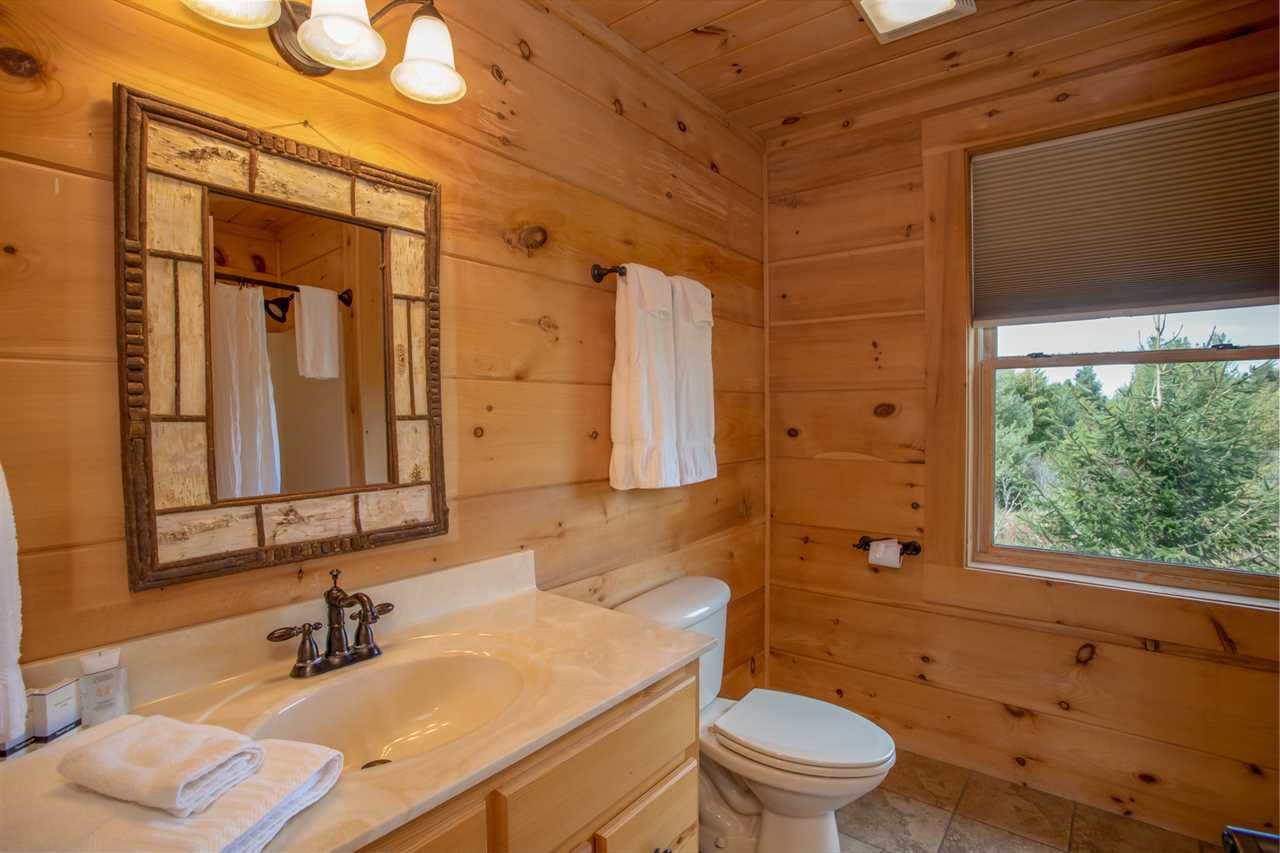 The loft area off the great room has another large bedroom with a king-size bed, a single twin-size bed, and a full ensuite bathroom. The hardwood floors and tongue-and-groove accent wall on the lower level make the finished space warm and inviting. There is another large bedroom with a king-size bed, two twin beds (all handcrafted "twig" style), and a new ensuite bathroom with a tiled shower and towel warmer. Including the pull-out queen sleeper sofa in the basement recreation room, which has a full bathroom with a combination tub/shower, the cabin has flexible sleeping arrangements for 13 guests. The basement bedroom and recreation room each have large sliding glass doors accessing the backyard for play. The hot tub sits outside of the basement on a covered patio. Alpine Ridge is dog friendly, so even your furry family members can enjoy life in the high country. This exquisite lodge-style mountain home has everything your family and friends need to appreciate the perfect vacation to the North Carolina mountains.